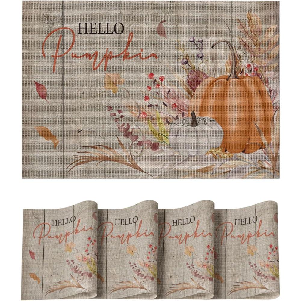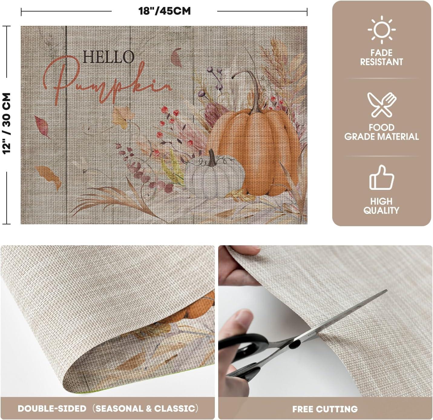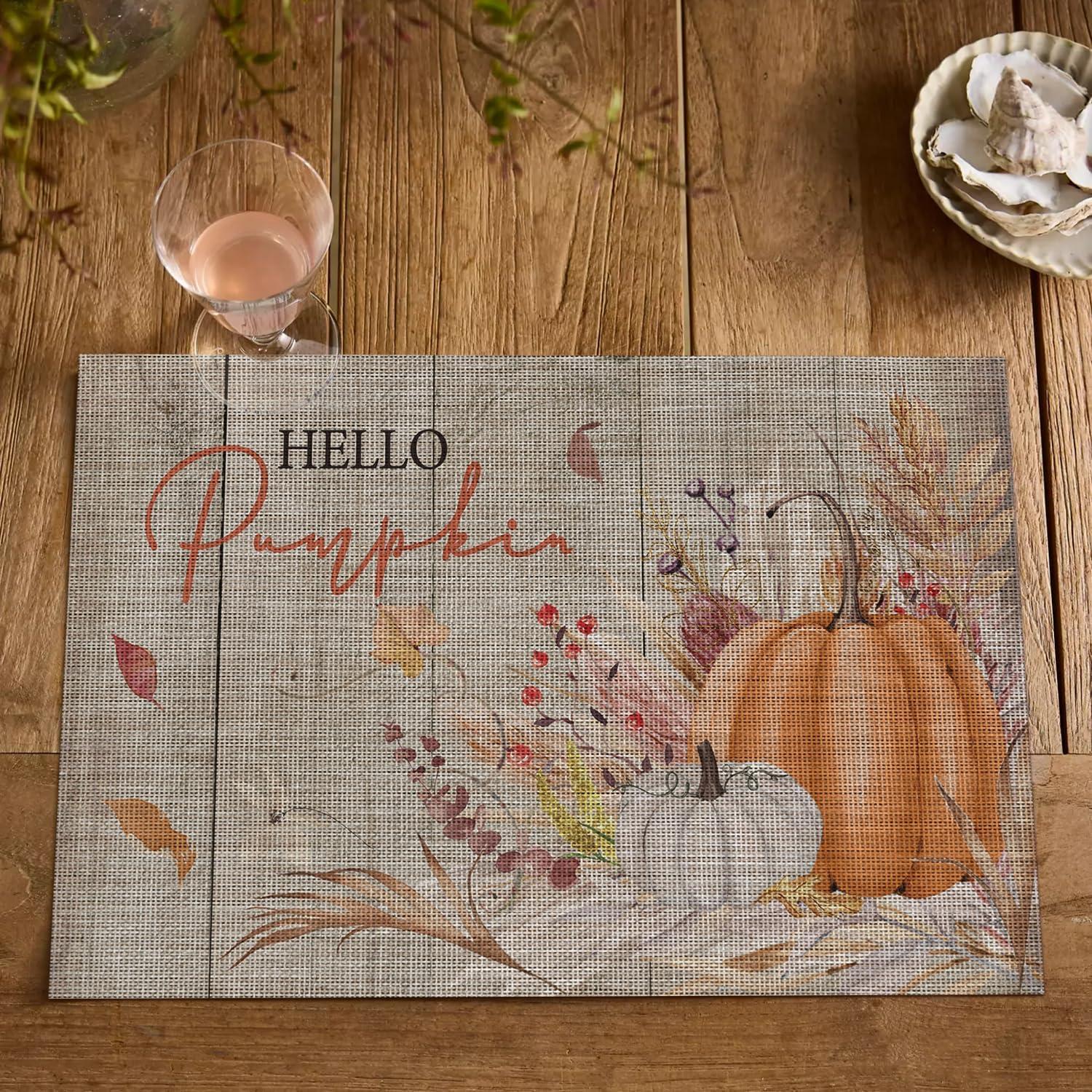 Artoid Mode Orange Hello Pumpkin Leaves Fall Vinyl Placemats Set of 4, Washable Woven Non-Slip Plastic Table Mats for Thanksgiving Holiday Party Kitchen Dining Decor(Wood)
