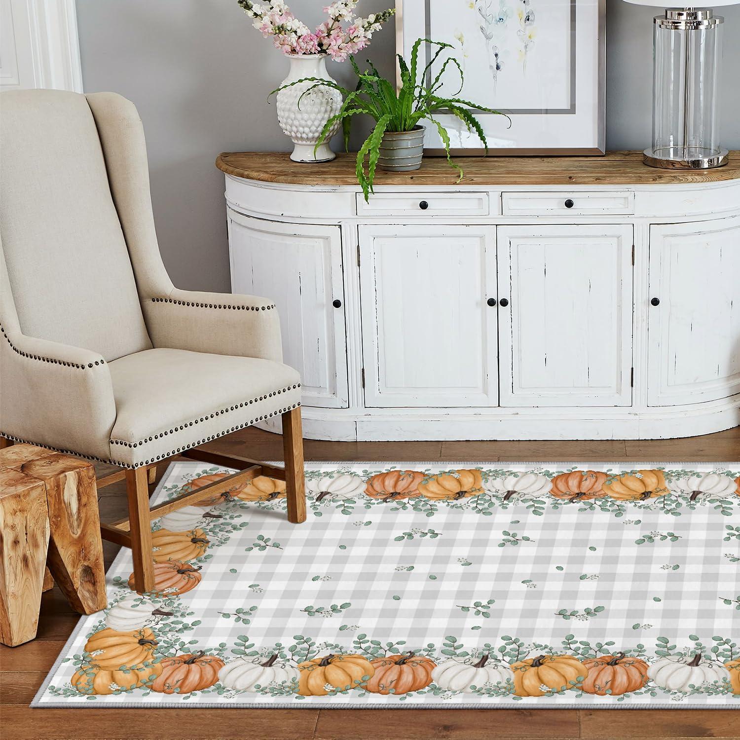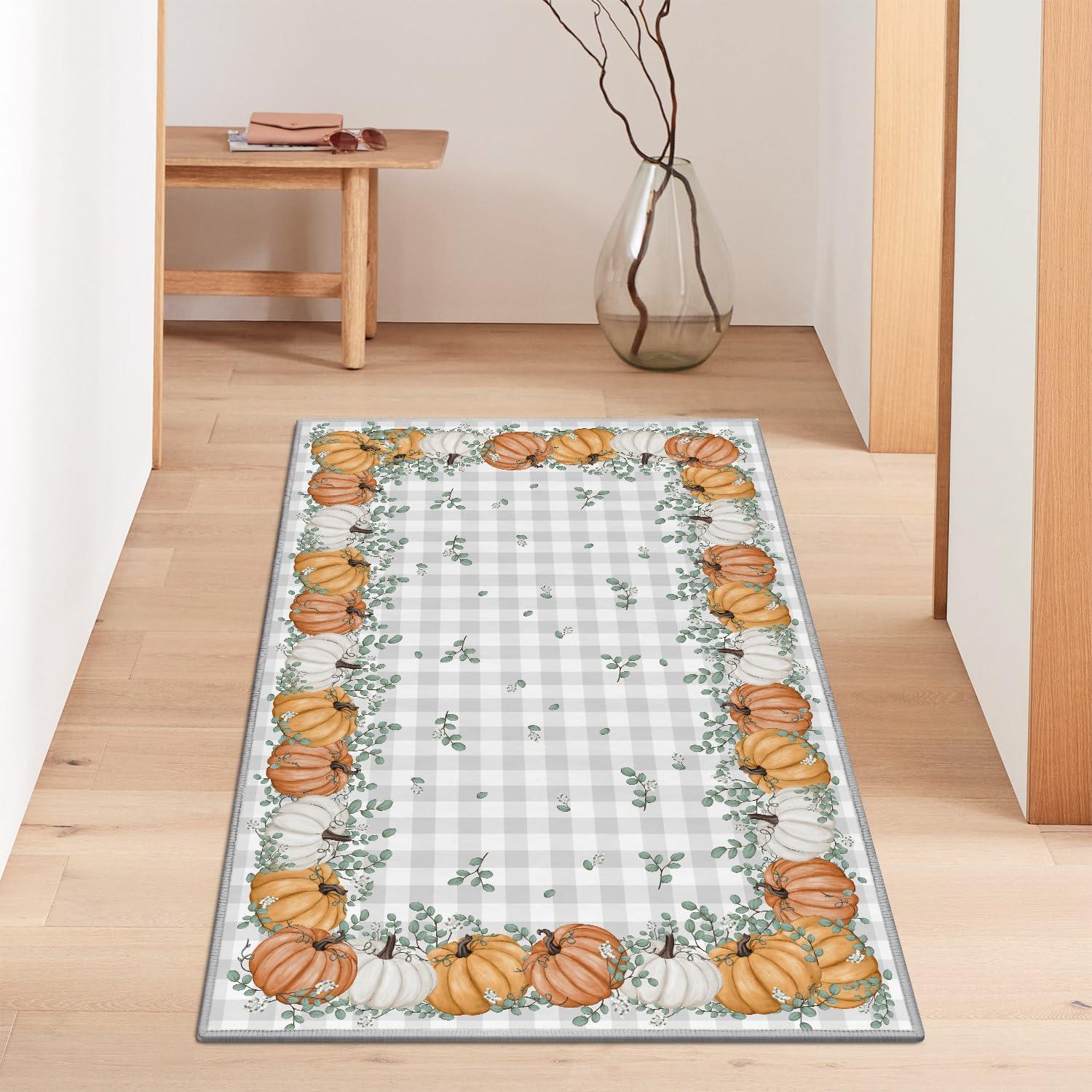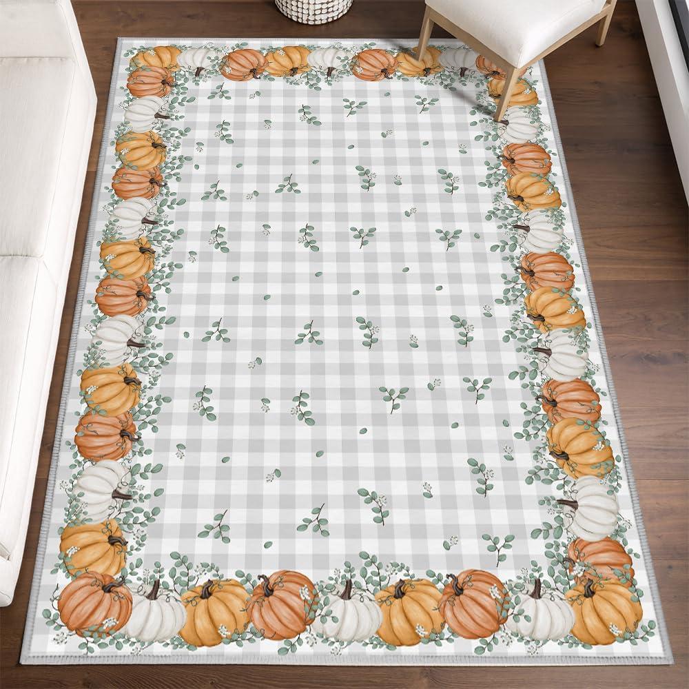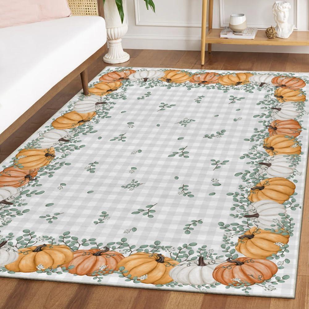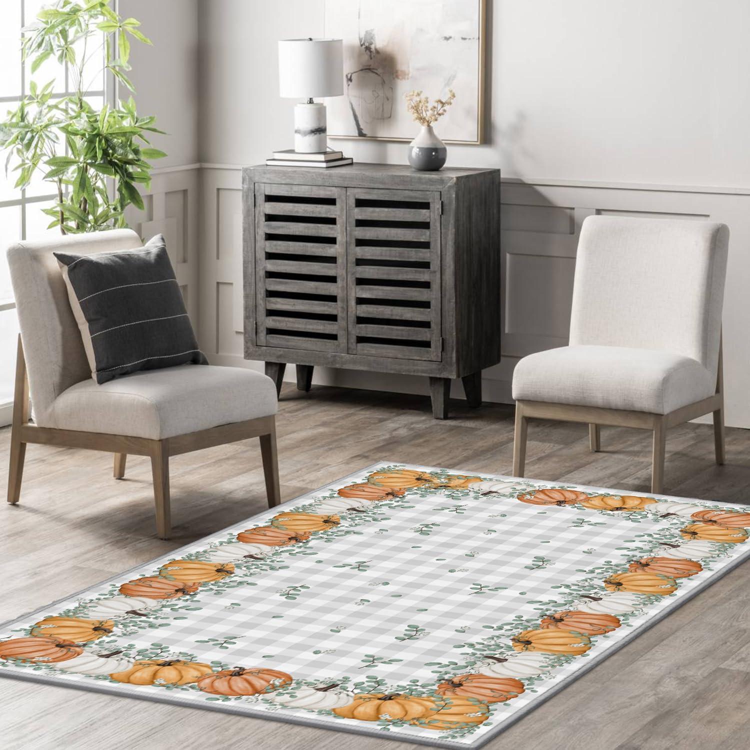 Artoid Mode Orange Pumpkins Eucalyptus Leaves Fall Area Rug, Autumn Thanksgiving Home Decor Low-Profile Washable Area Rugs for Entryway Bedroom Living Room Laundry Room Indoor 5×7 Feet(Orange)