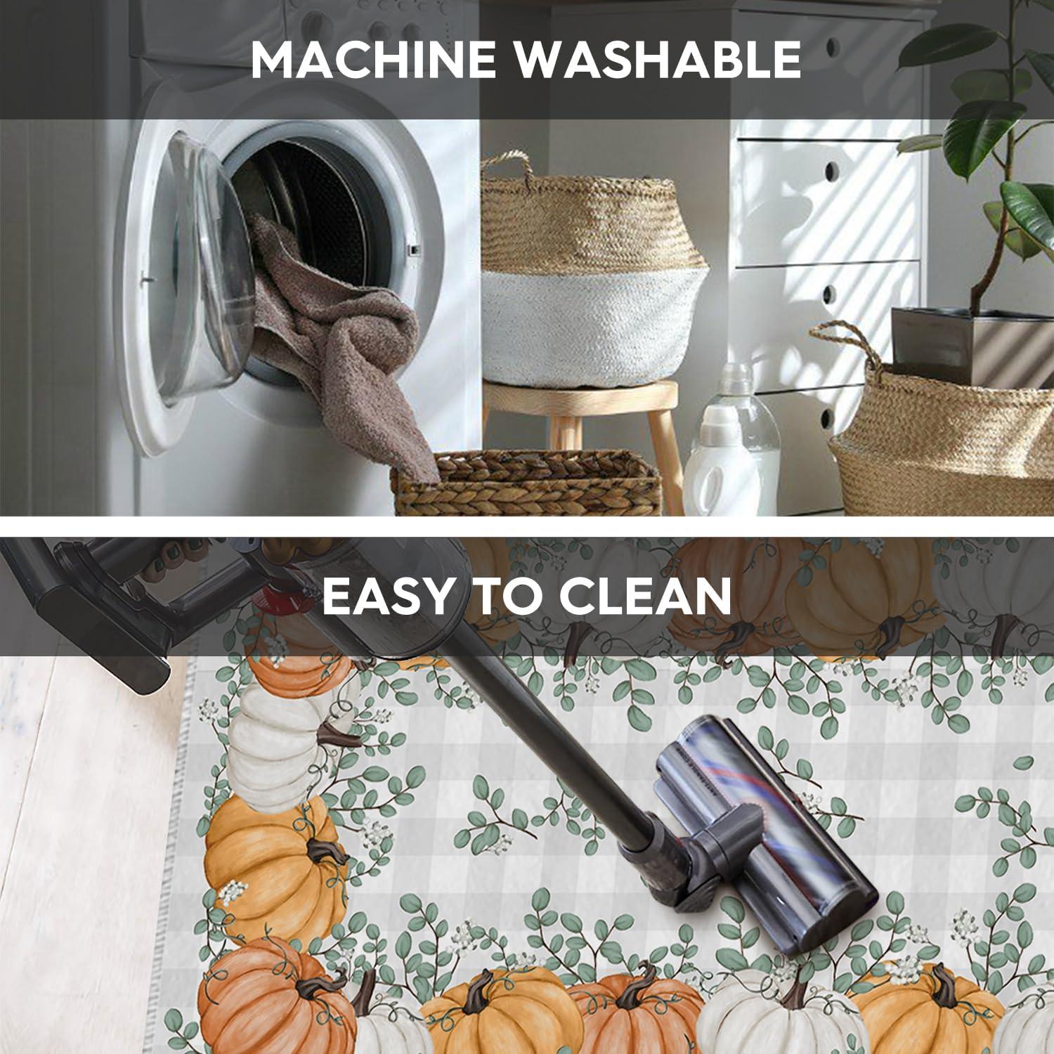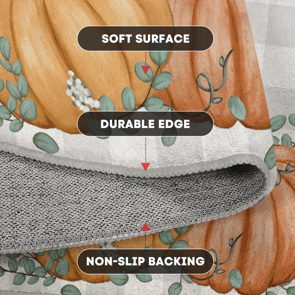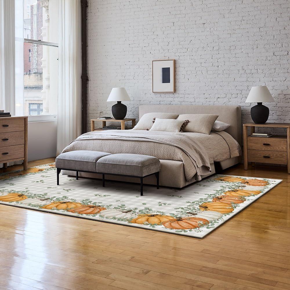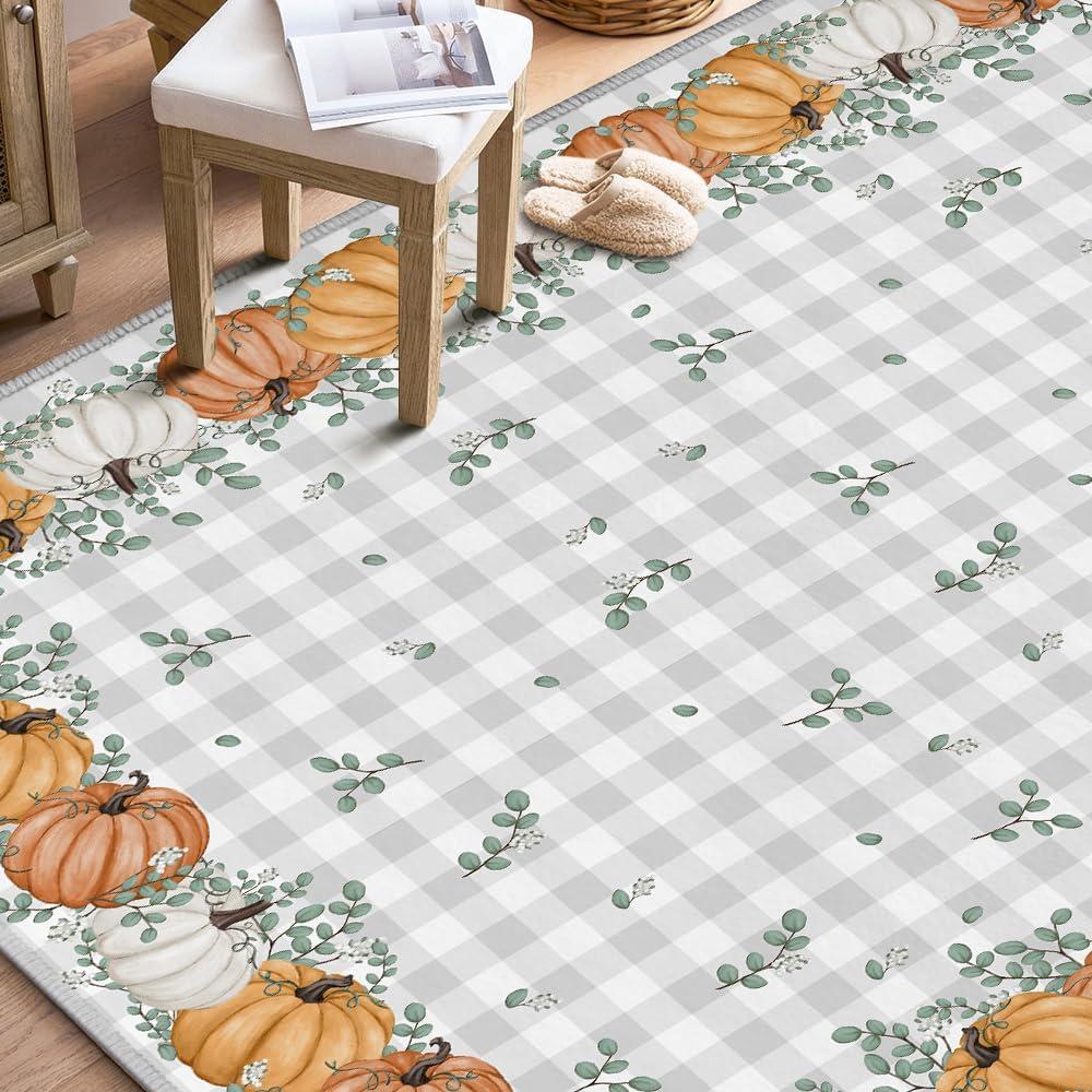 Artoid Mode Orange Pumpkins Eucalyptus Leaves Fall Area Rug, Autumn Thanksgiving Home Decor Low-Profile Washable Area Rugs for Entryway Bedroom Living Room Laundry Room Indoor 5×7 Feet(Orange)
