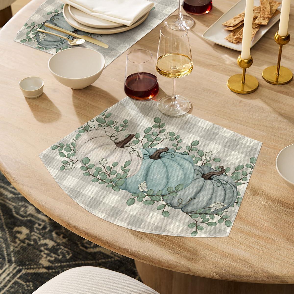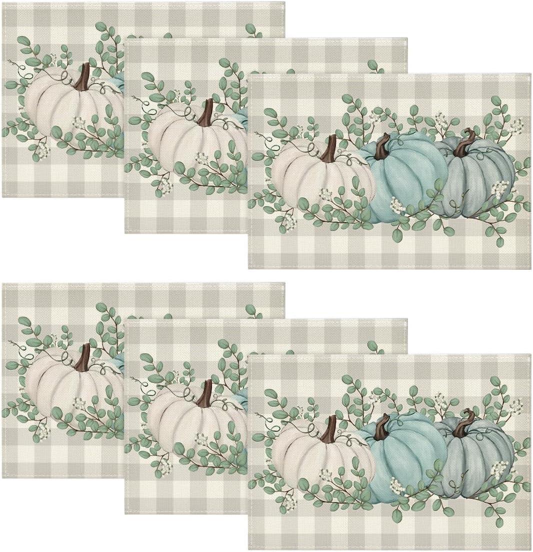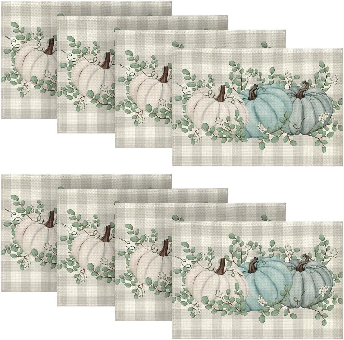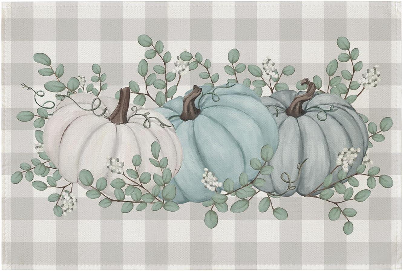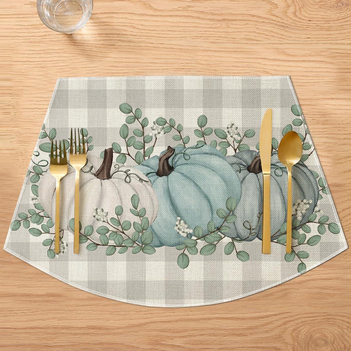 Artoid Mode Orange Pumpkins Eucalyptus Leaves Fall Placemats Set of 4, 12×18 Inch Seasonal Autumn Table Mats for Party Kitchen Dining Decoration(Blue)