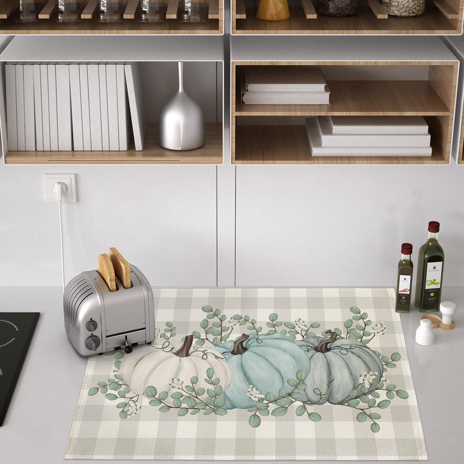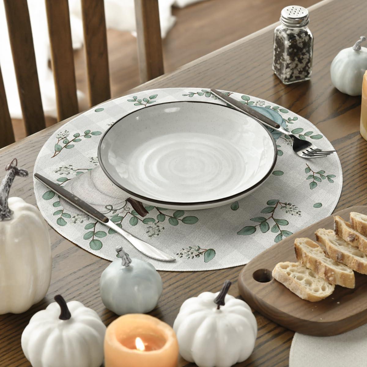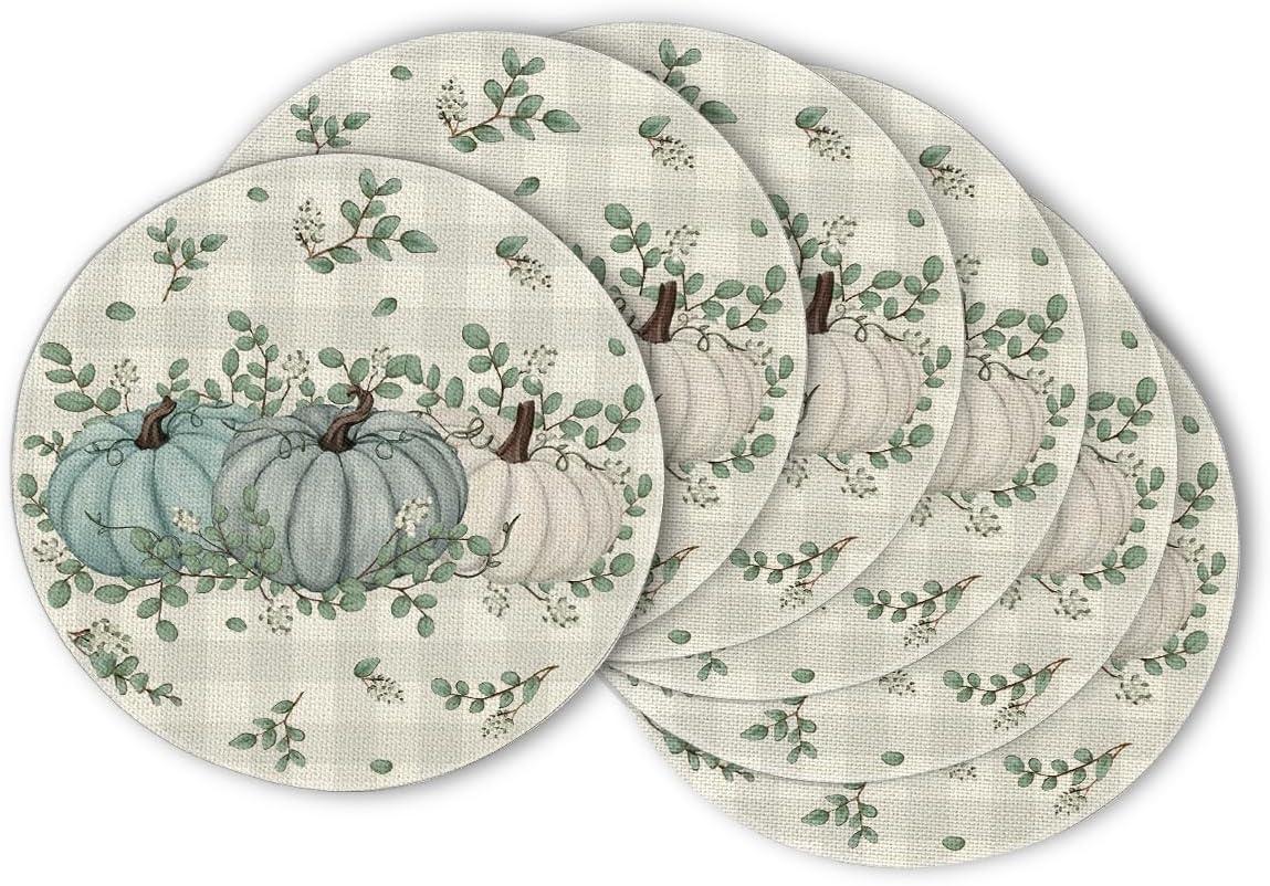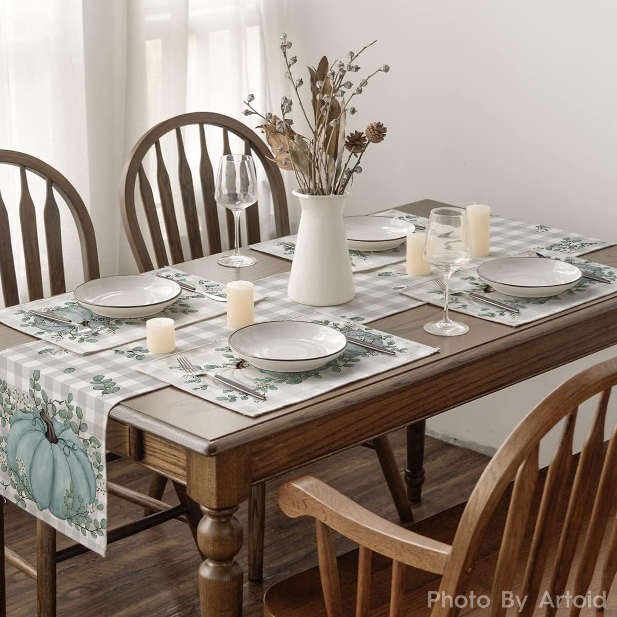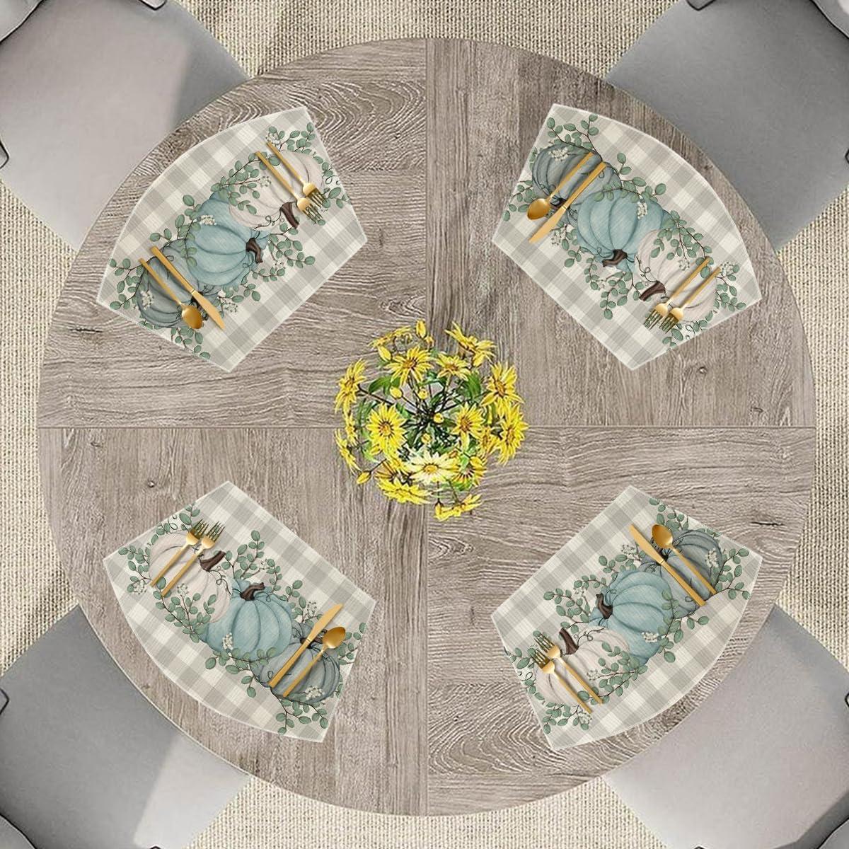 Artoid Mode Orange Pumpkins Eucalyptus Leaves Fall Placemats Set of 4, 12×18 Inch Seasonal Autumn Table Mats for Party Kitchen Dining Decoration(Blue)