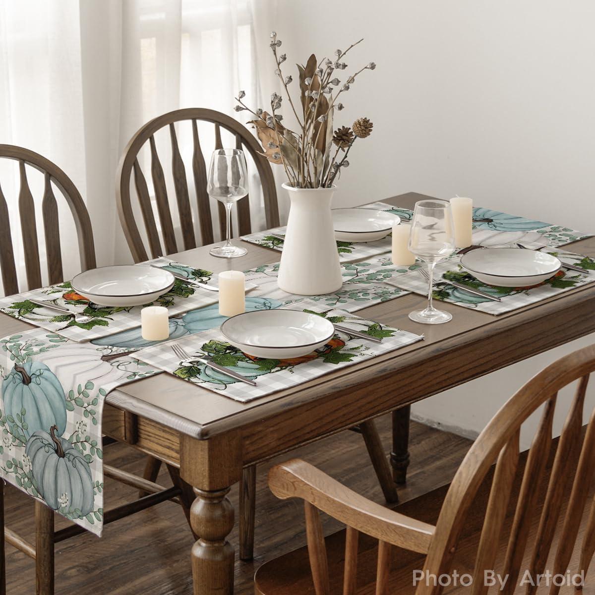 Artoid Mode Orange Pumpkins Eucalyptus Leaves Fall Placemats Set of 4, 12×18 Inch Seasonal Autumn Table Mats for Party Kitchen Dining Decoration(Orange/Blue)
