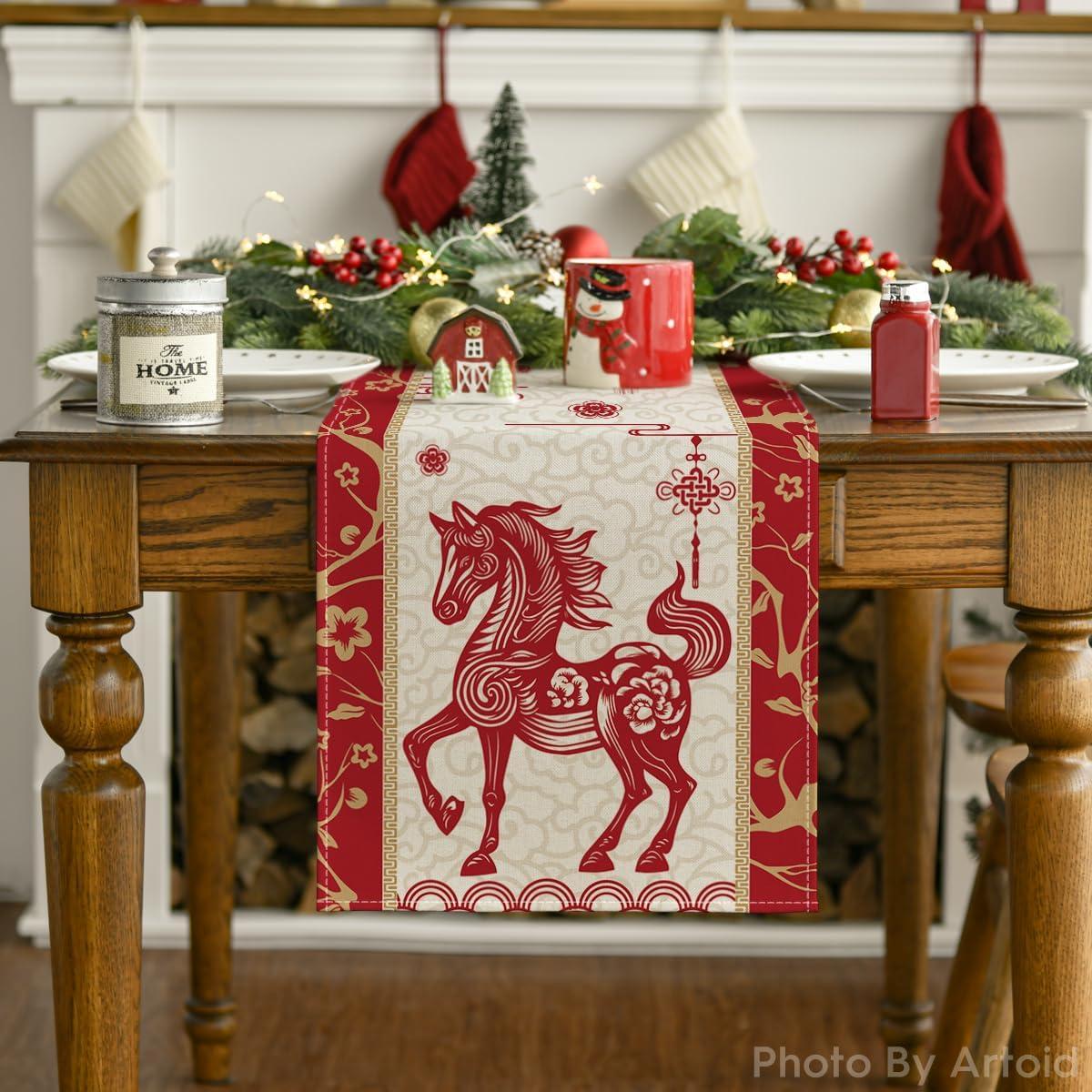 Artoid Mode Paper Cutting Style Chinese Zodiac Horse Happy 2026 Lunar New Year Table Runner, Spring Festival Winter Kitchen Dining Table Decoration for Home Party 13×72 Inch(Beige)