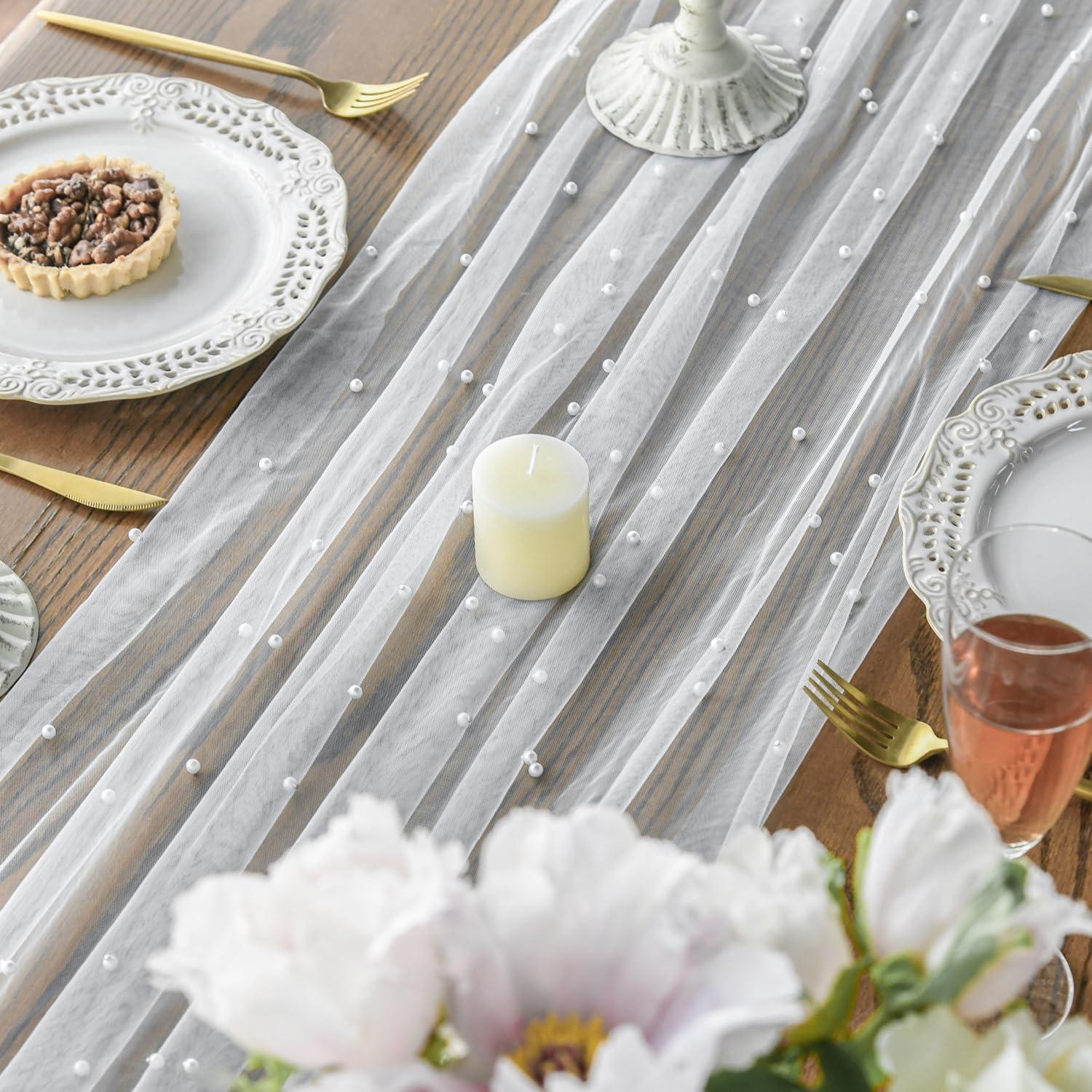 Artoid Mode Pearl Blue Gauze Table Runner 120 Inch 10FT, Seasonal Sheer Dining Holiday Wedding Birthday Baby Shower Table Decor for Home Party(White)