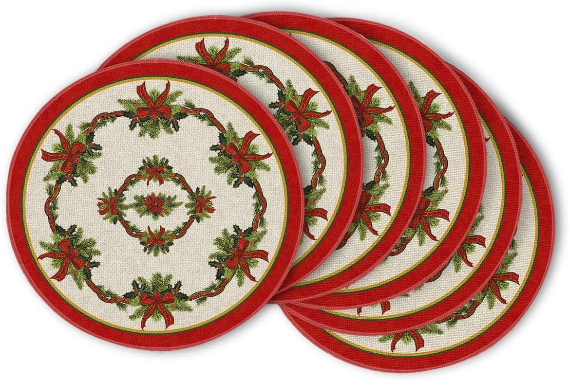 Artoid Mode Pine Branches Bow Ribbon Christmas Round Placemats Set of 4, 14 Inch Winter Round Table Mats for Dining Decoration(Red)