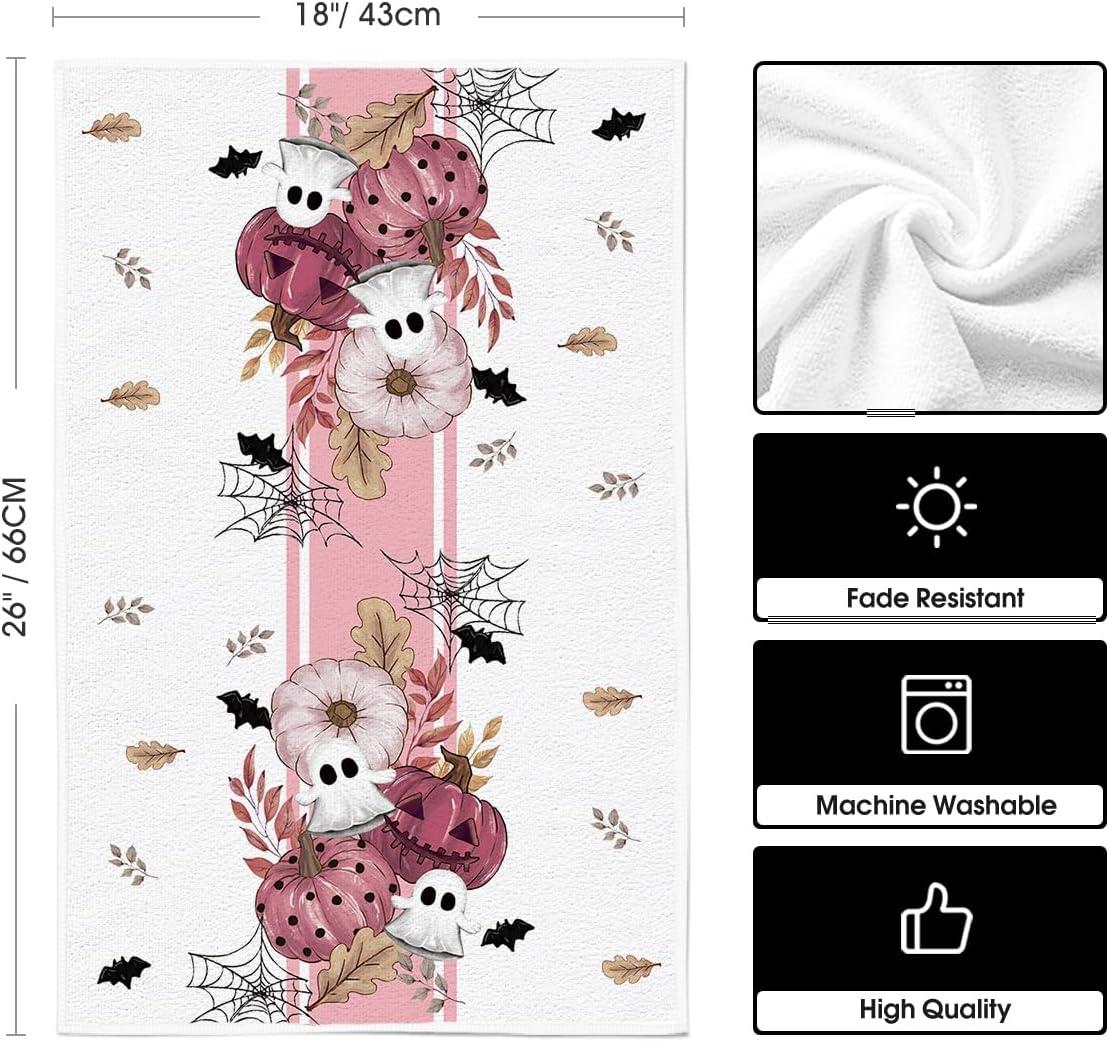Artoid Mode Pink Ghost Polka Dot Pumpkin Happy Halloween Kitchen Towels Dish Towels, 18×26 Inch Farmhouse Flower Bat Decoration Hand Towels Set of 2(Pink)