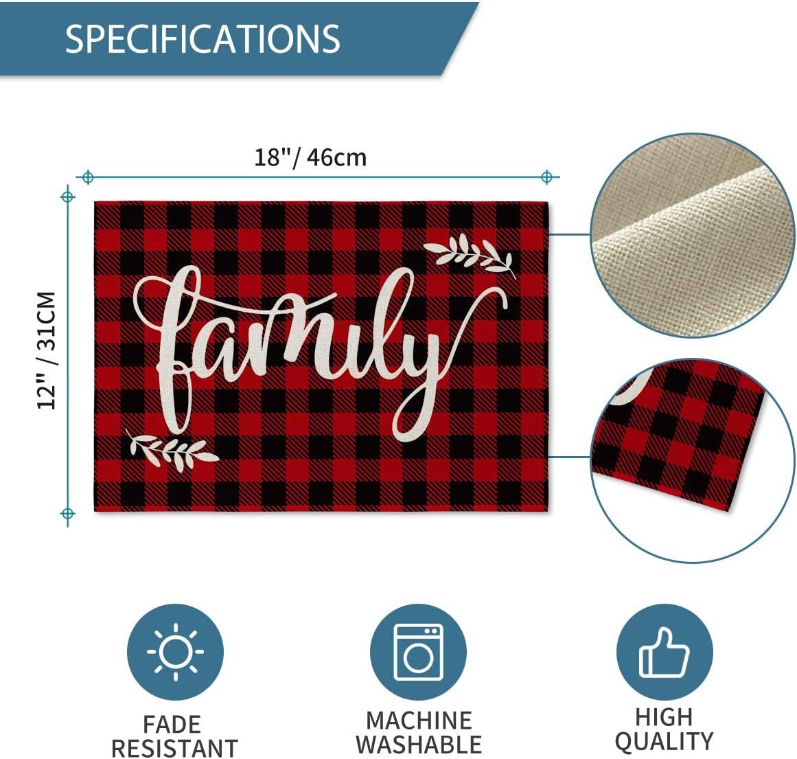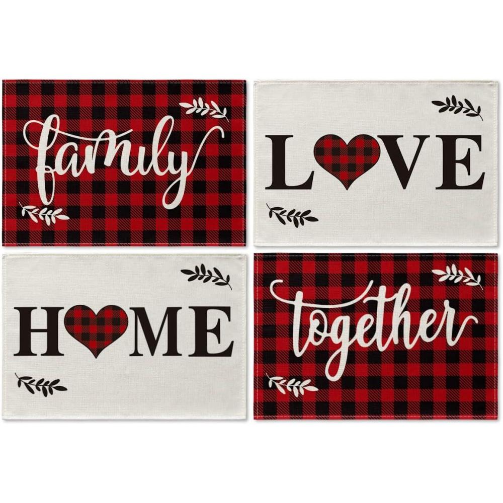 Artoid Mode Placemats for Dining Table Red Buffalo Plaid Love Home Family Together, 12 x 18 Inch Winter Holiday Washable Table Mat Set of 4(Black/Red)