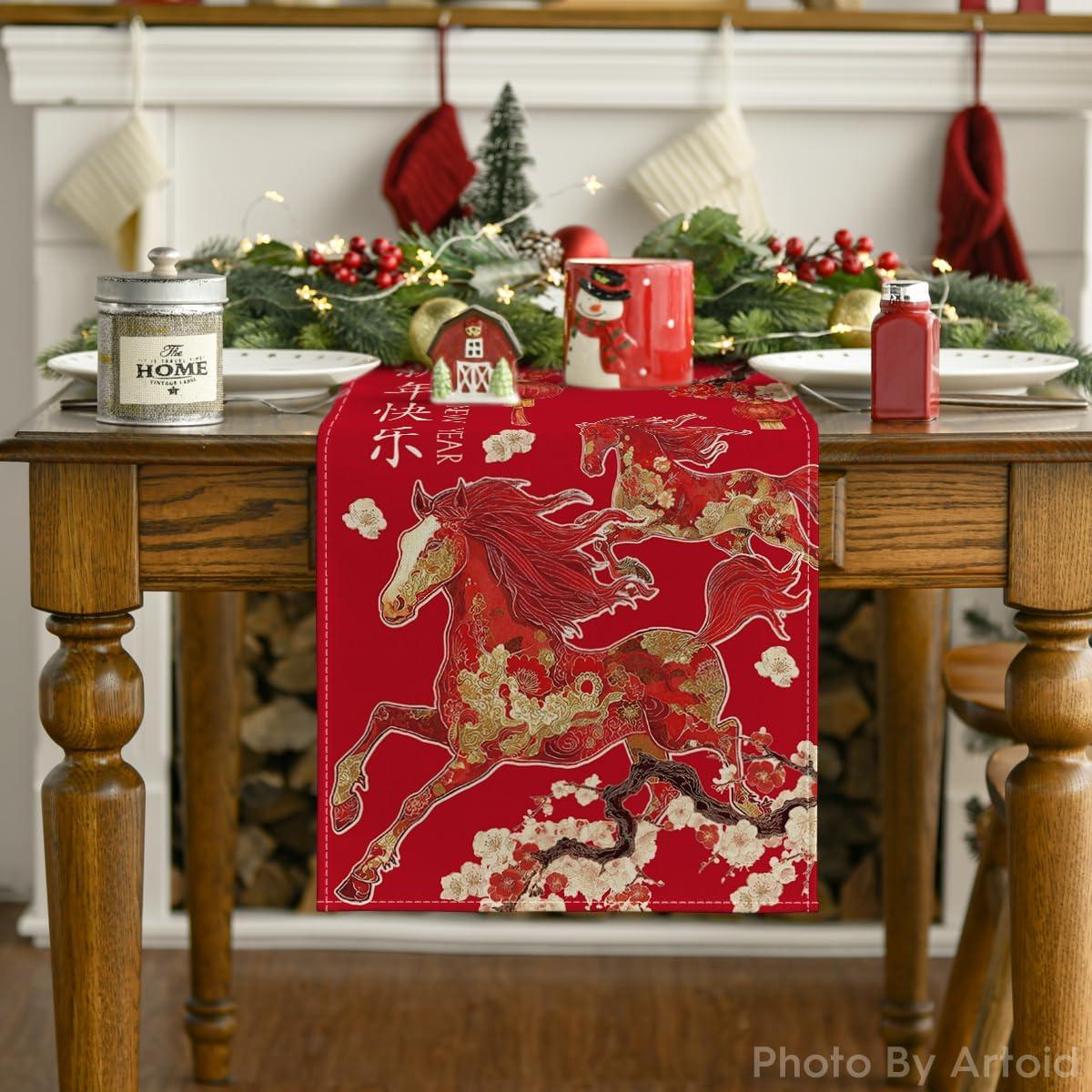 Artoid Mode Plum Blossom Chinese Zodiac Horse Happy 2026 Lunar New Year Table Runner, Spring Festival Winter Kitchen Dining Table Decoration for Home Party 13×72 Inch