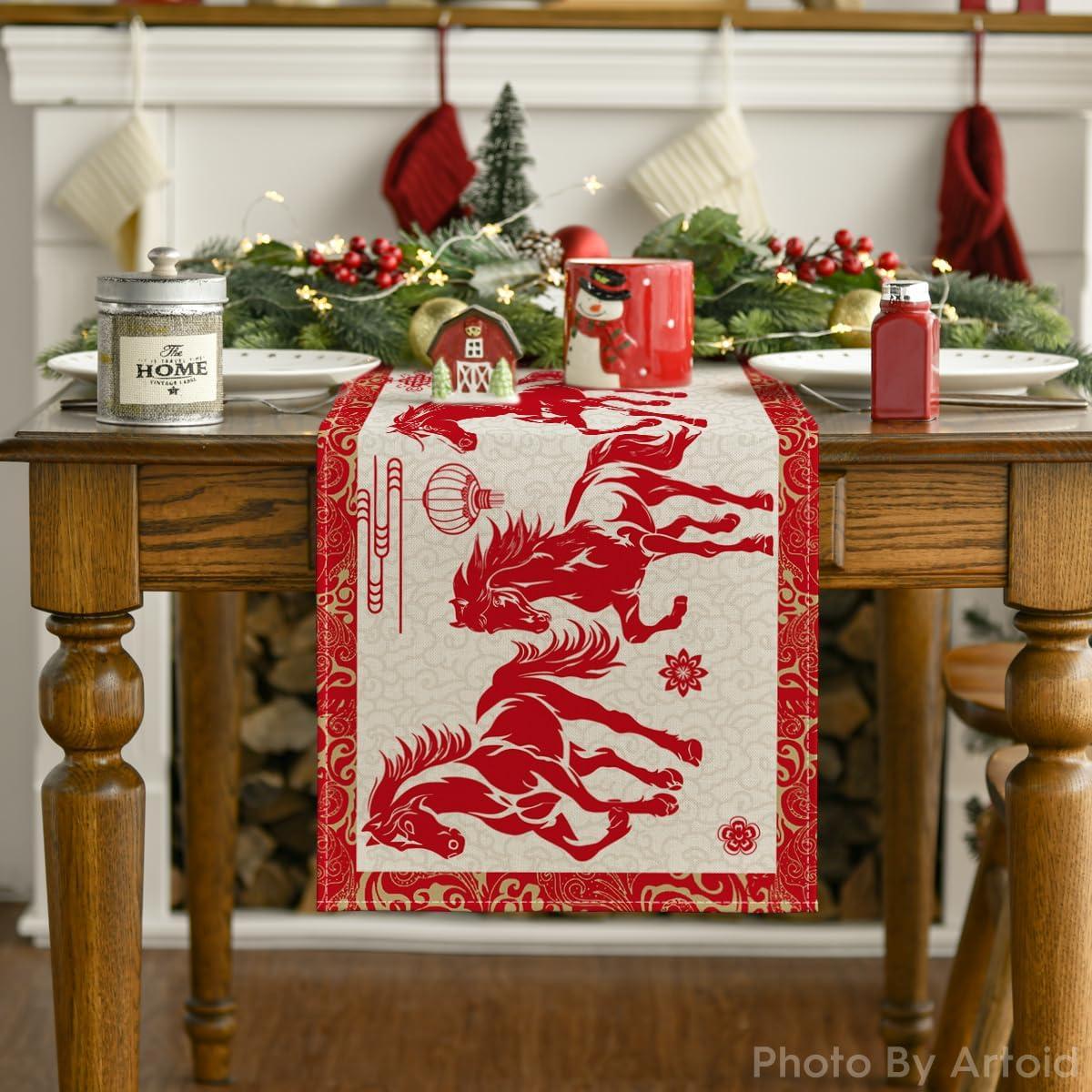 Artoid Mode Propitious Clouds Chinese Zodiac Horse Happy 2026 Lunar New Year Table Runner, Spring Festival Winter Kitchen Dining Table Decoration for Home Party 13×72 Inch