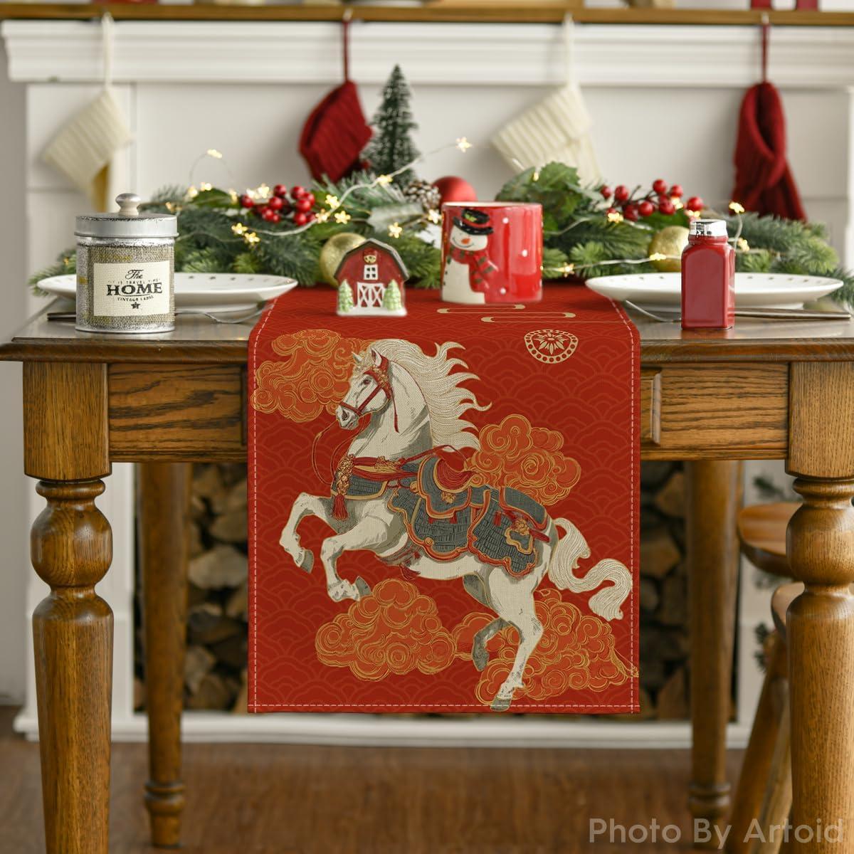 Artoid Mode Propitious Clouds Steeds Red Chinese Zodiac Horse Happy 2026 Lunar New Year Table Runner, Spring Festival Winter Kitchen Dining Table Decoration for Home Party 13×72 Inch