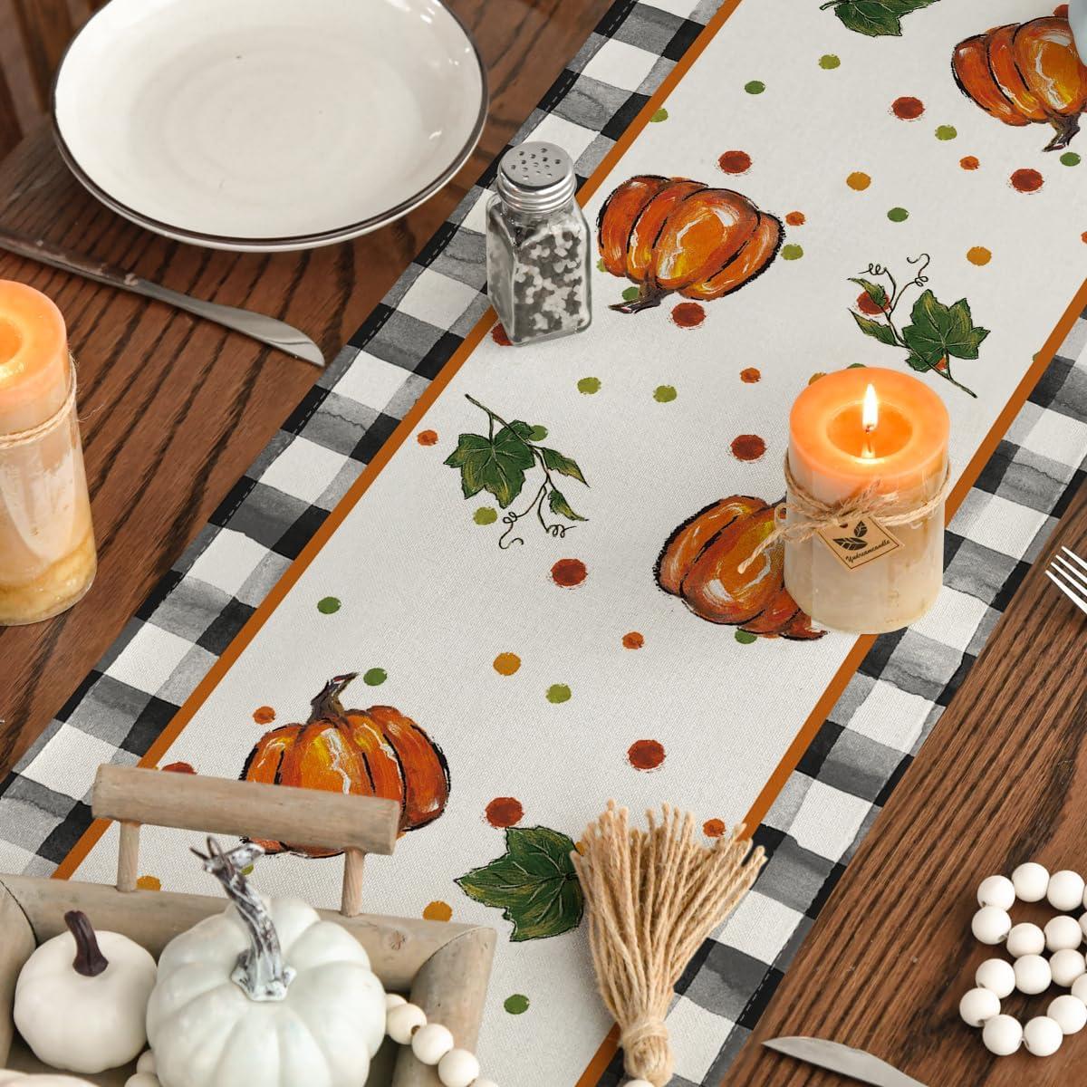 Artoid Mode Pumpkin Bow Buffalo Plaid Fall Table Runner,Seasonal Autumn Kitchen Dining Table Decoration for Home Party Decor 13×72 Inch(Black/Beige/Orange)