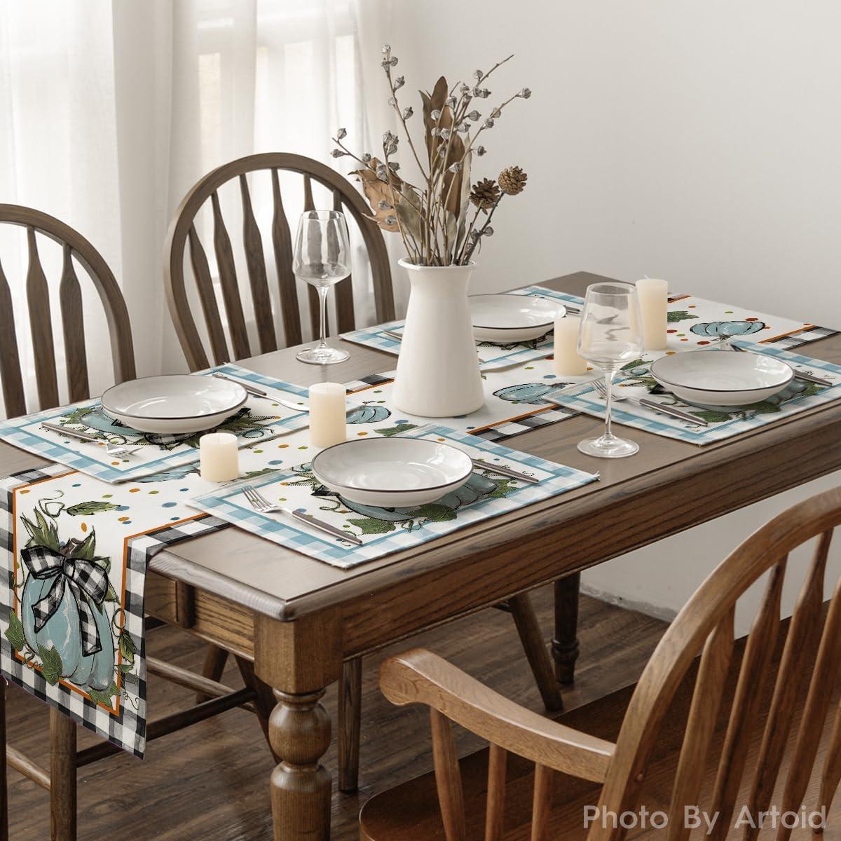 Artoid Mode Pumpkin Buffalo Plaid Fall Placemats Set of 4, 12×18 Inch Seasonal Autumn Table Mats for Outdoor Home Party Dining Decoration(Blue/Beige)