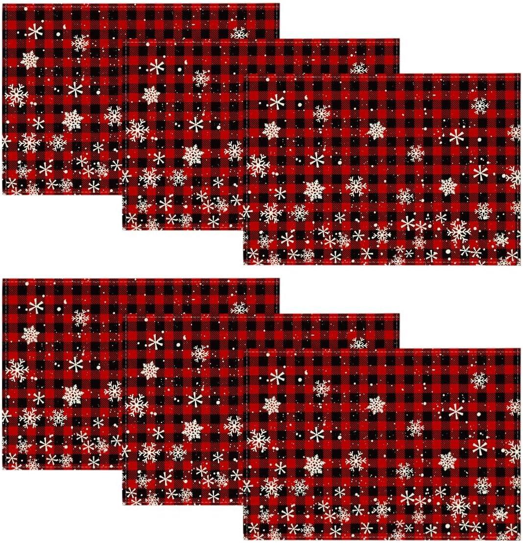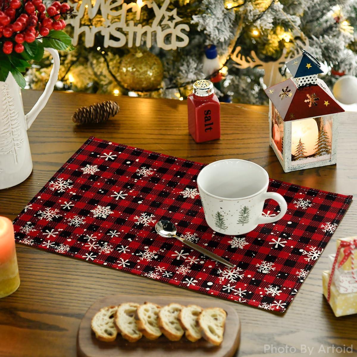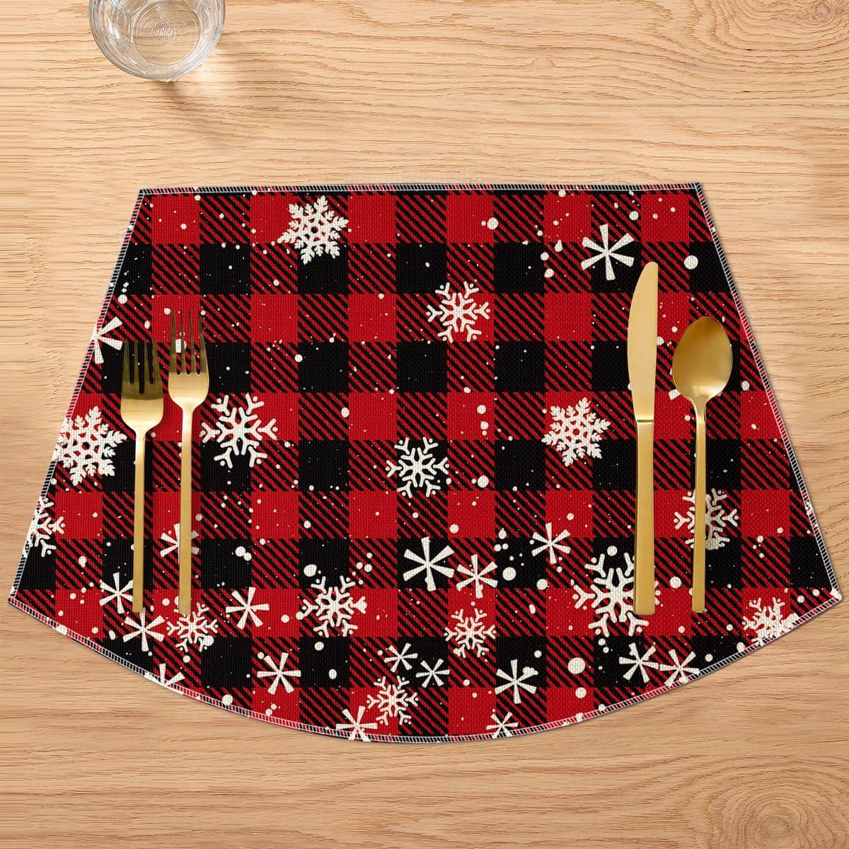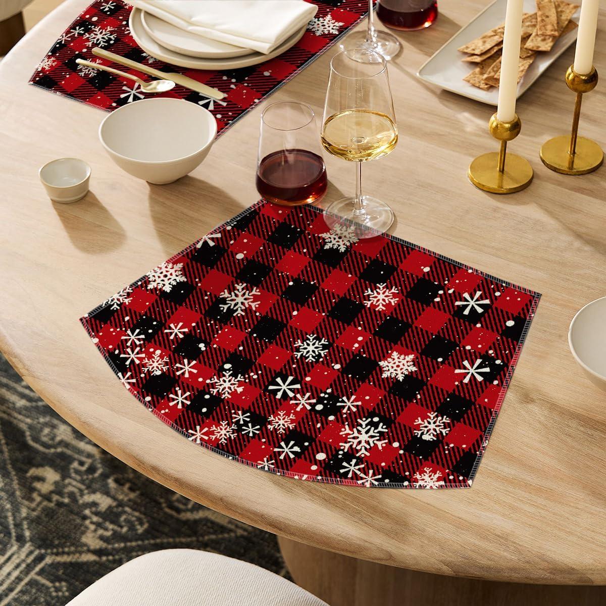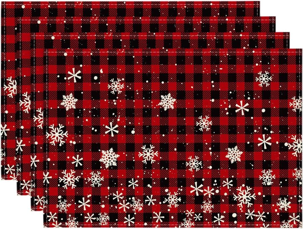 Artoid Mode Red and Black Buffalo Plaid Christmas Placemats for Dining Table, 12 x 18 Inch Seasonal Winter Xmas Snowflakes Holiday Rustic Vintage Thanksgiving Washable Table Mats Set of 4(Red/Black)