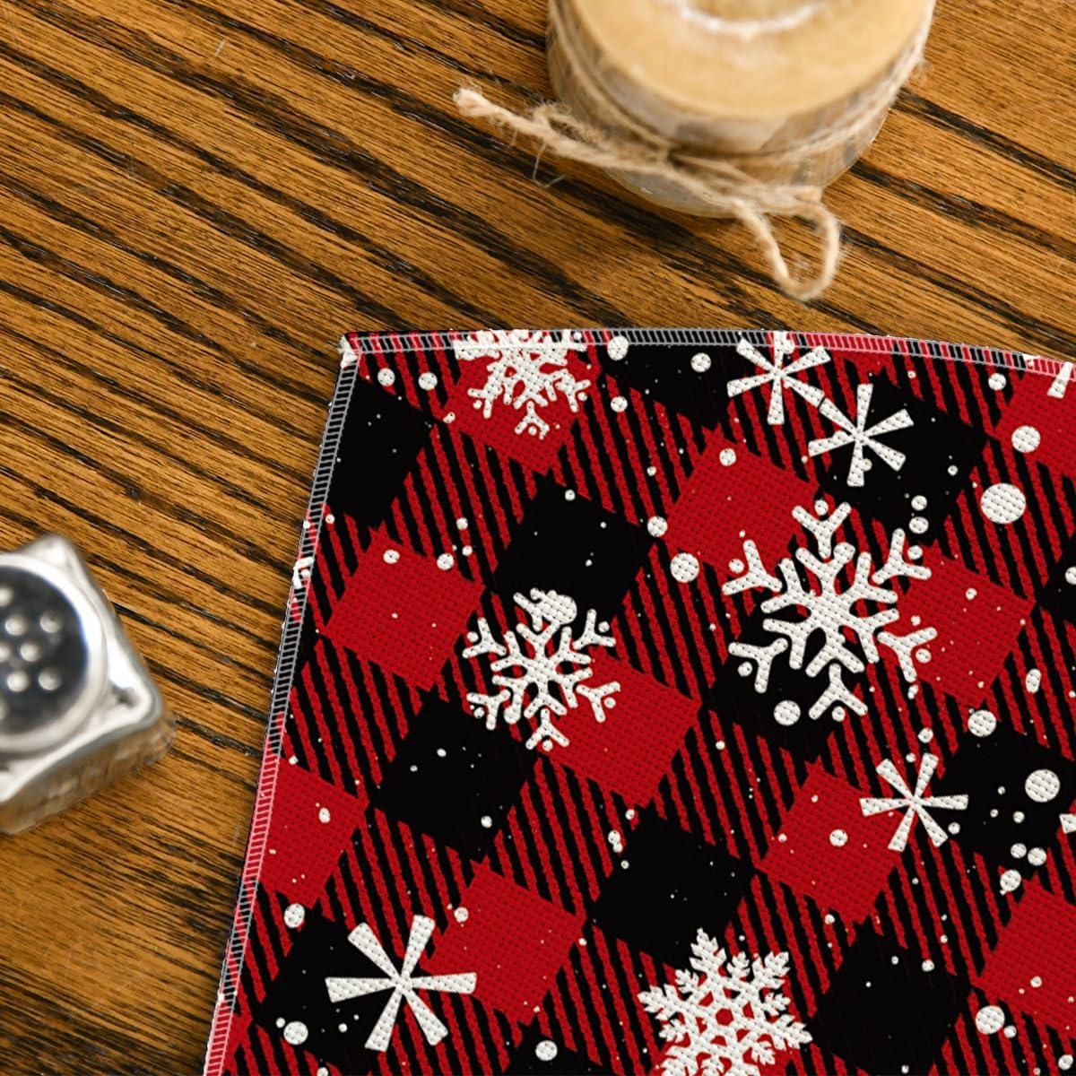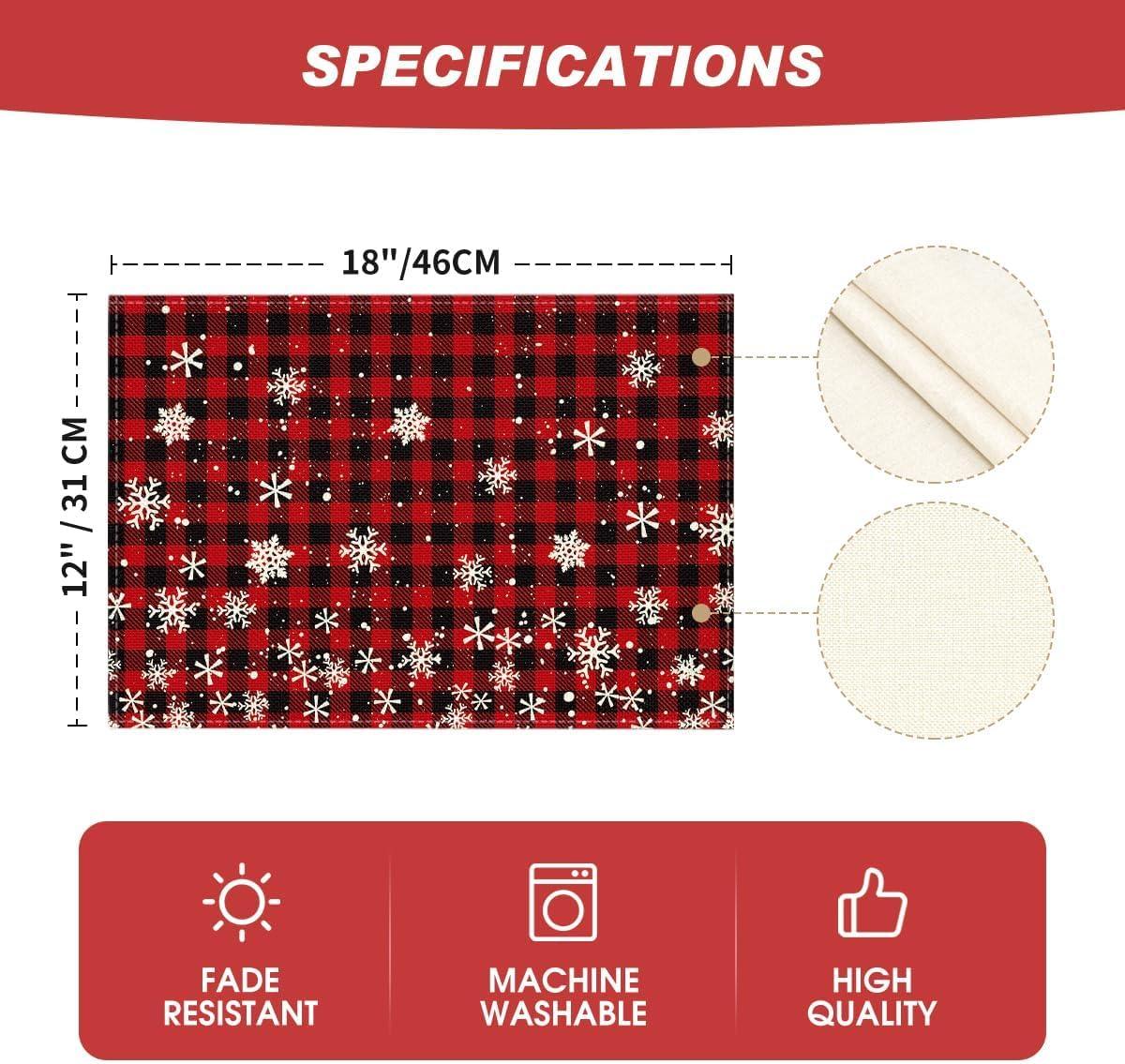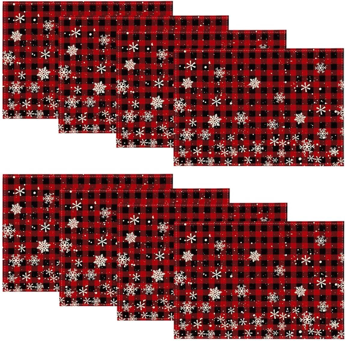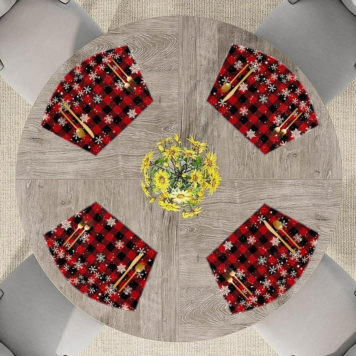 Artoid Mode Red and Black Buffalo Plaid Christmas Placemats for Dining Table, 12 x 18 Inch Seasonal Winter Xmas Snowflakes Holiday Rustic Vintage Thanksgiving Washable Table Mats Set of 4(Red/Black)