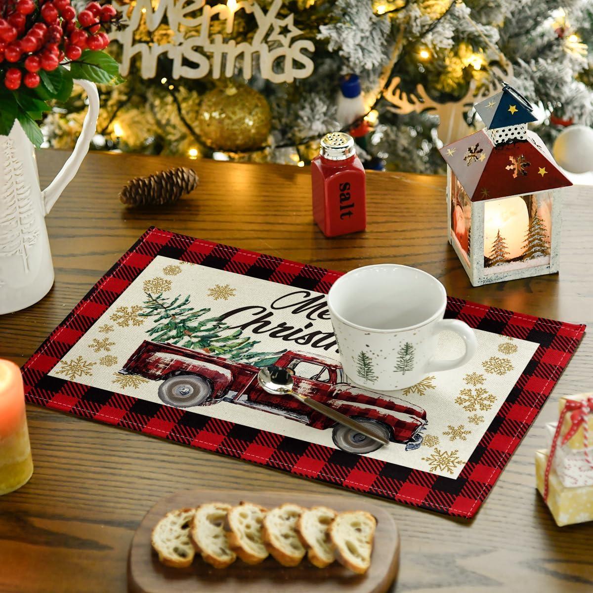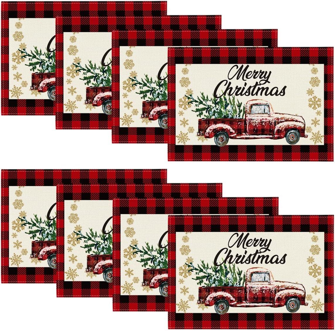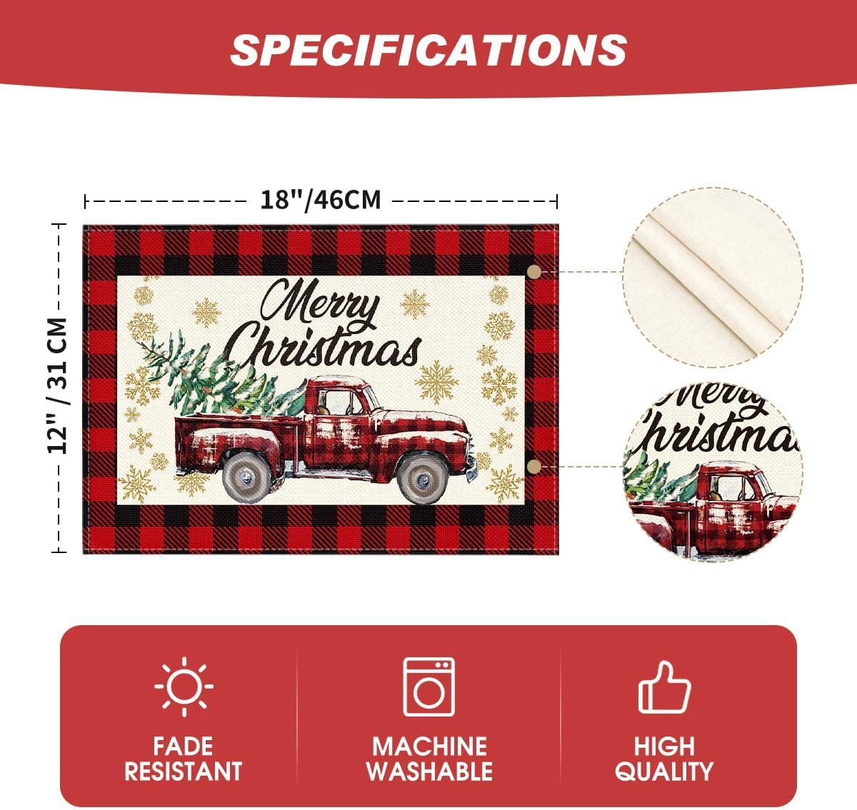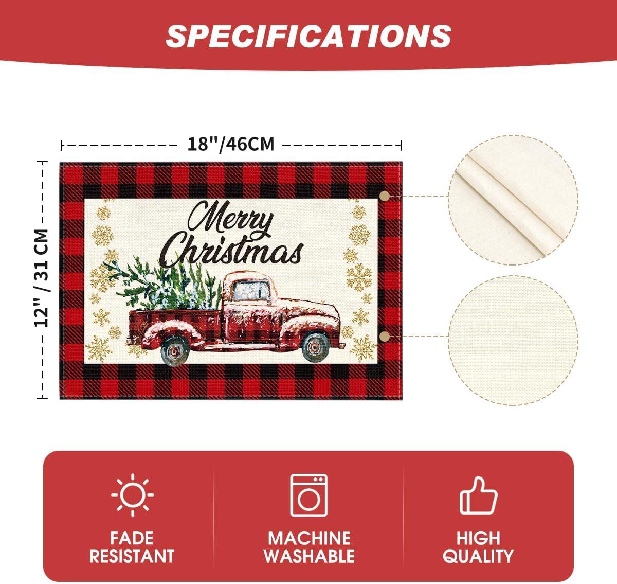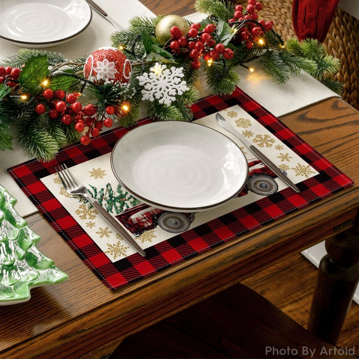 Artoid Mode Red and Black Buffalo Plaid Truck Merry Christmas Placemats Set of 4, 12×18 Inch Seasonal Winter Xmas Holiday Table Mats for Party Kitchen Dining Decoration(Red/Black)