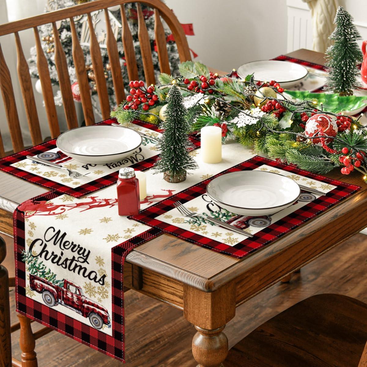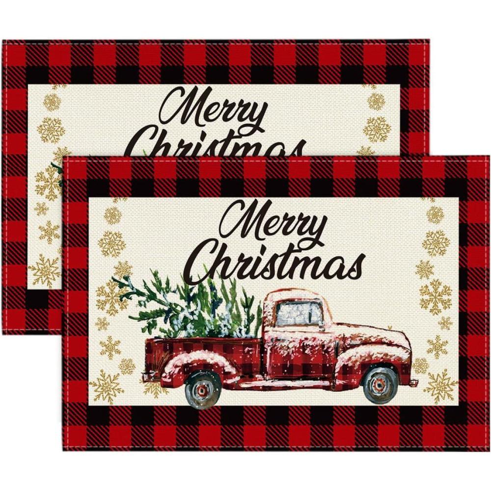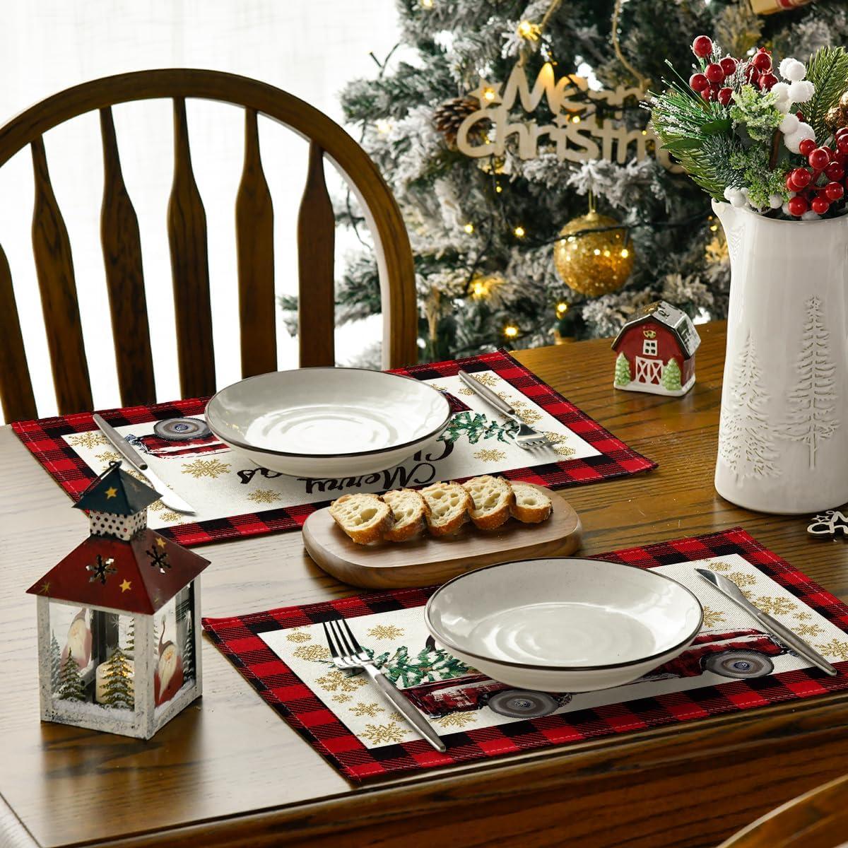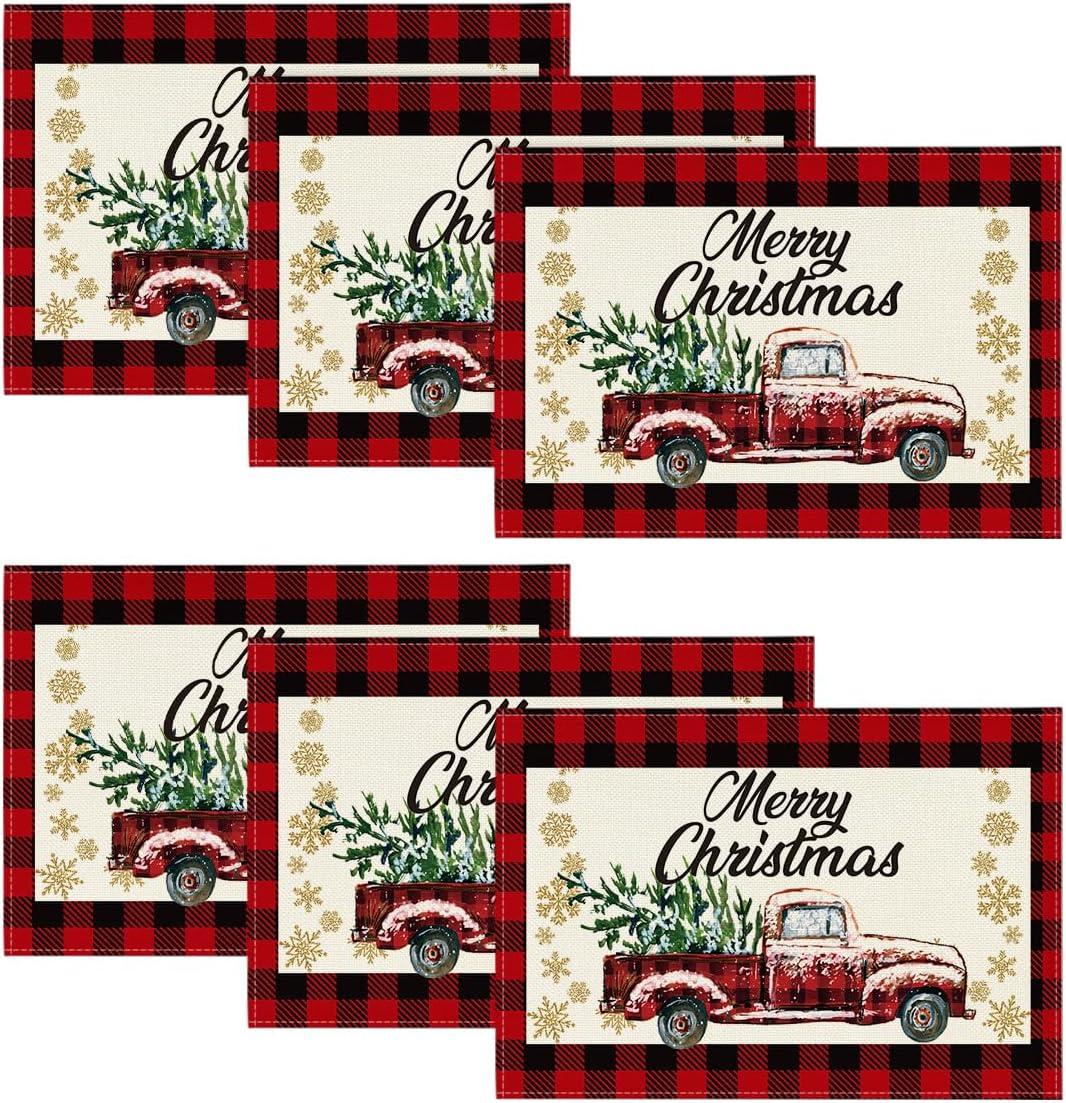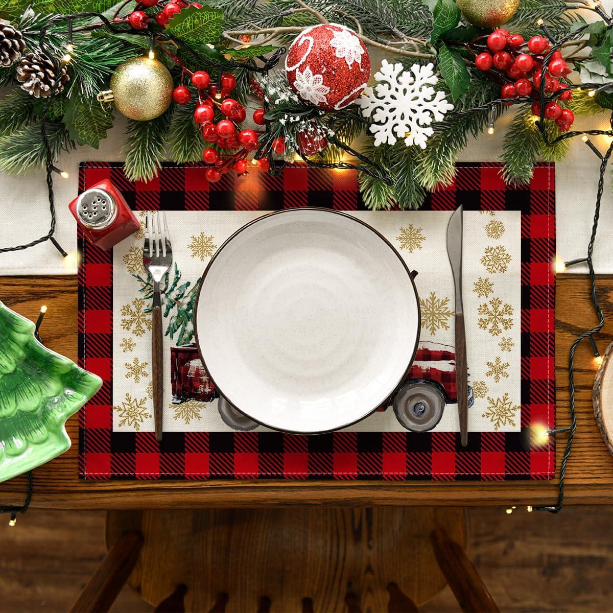 Artoid Mode Red and Black Buffalo Plaid Truck Merry Christmas Placemats Set of 4, 12×18 Inch Seasonal Winter Xmas Holiday Table Mats for Party Kitchen Dining Decoration(Red/Black)