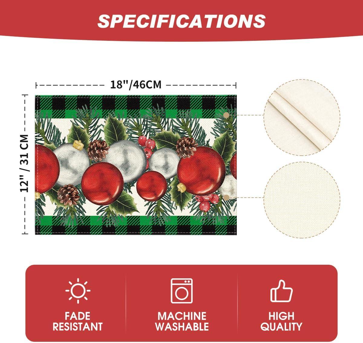 Artoid Mode Red Black Buffalo Plaid Holly Pine Cones Christmas Balls Placemats Set of 4, 12×18 Inch Seasonal Winter Table Mats for Party Kitchen Dining Decoration(Green/Black)