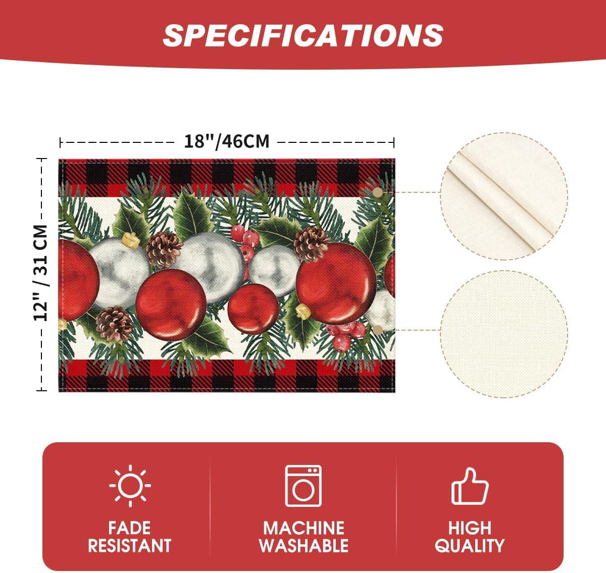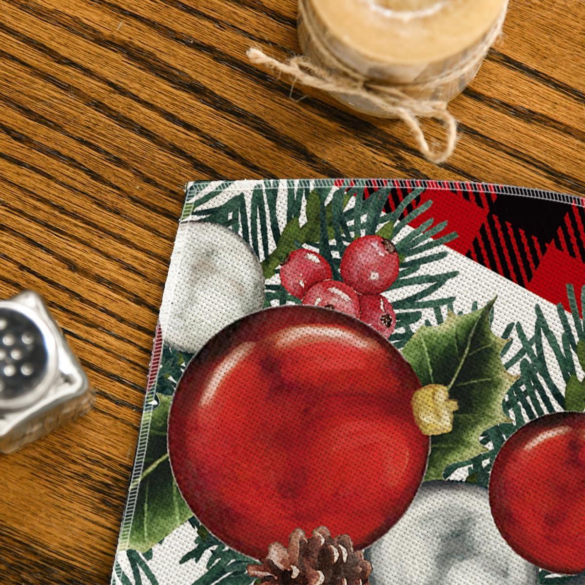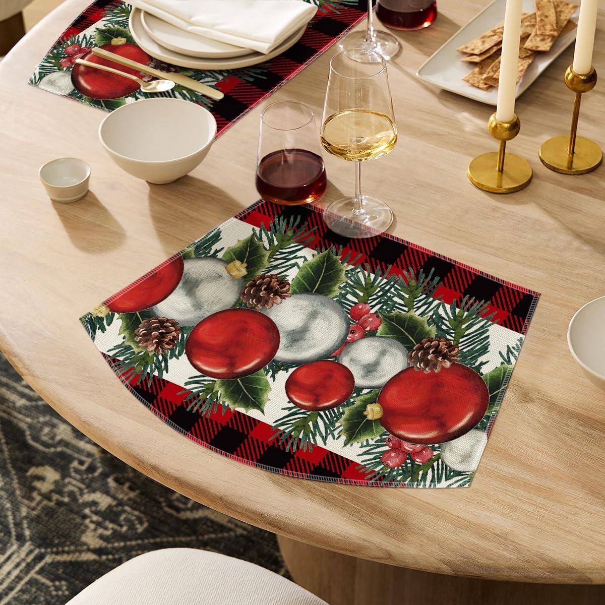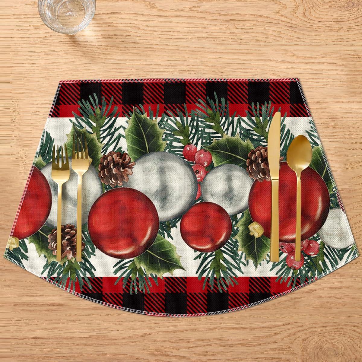 Artoid Mode Red Black Buffalo Plaid Holly Pine Cones Christmas Balls Placemats Set of 4, 12×18 Inch Seasonal Winter Table Mats for Party Kitchen Dining Decoration(Red/Black)