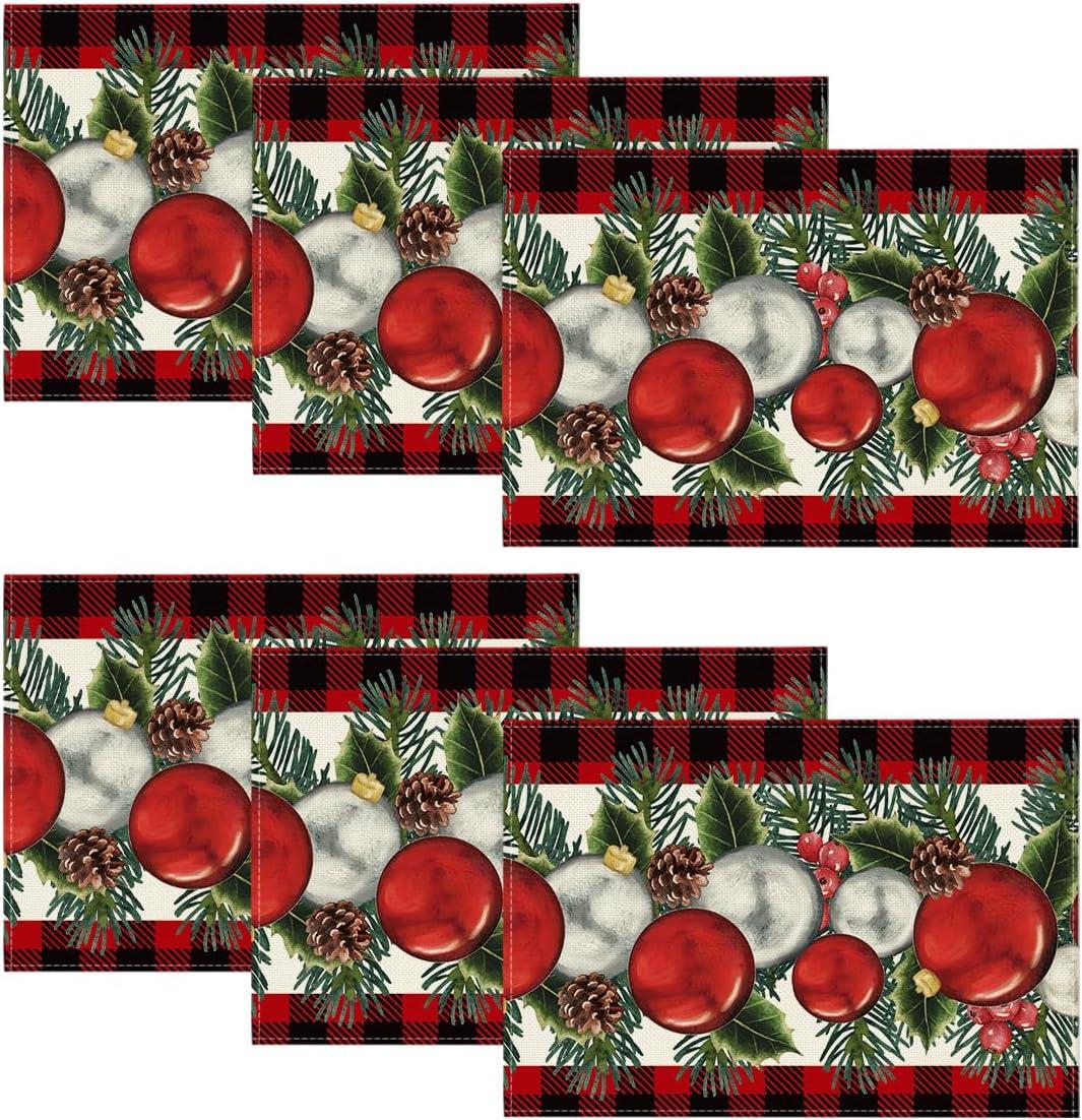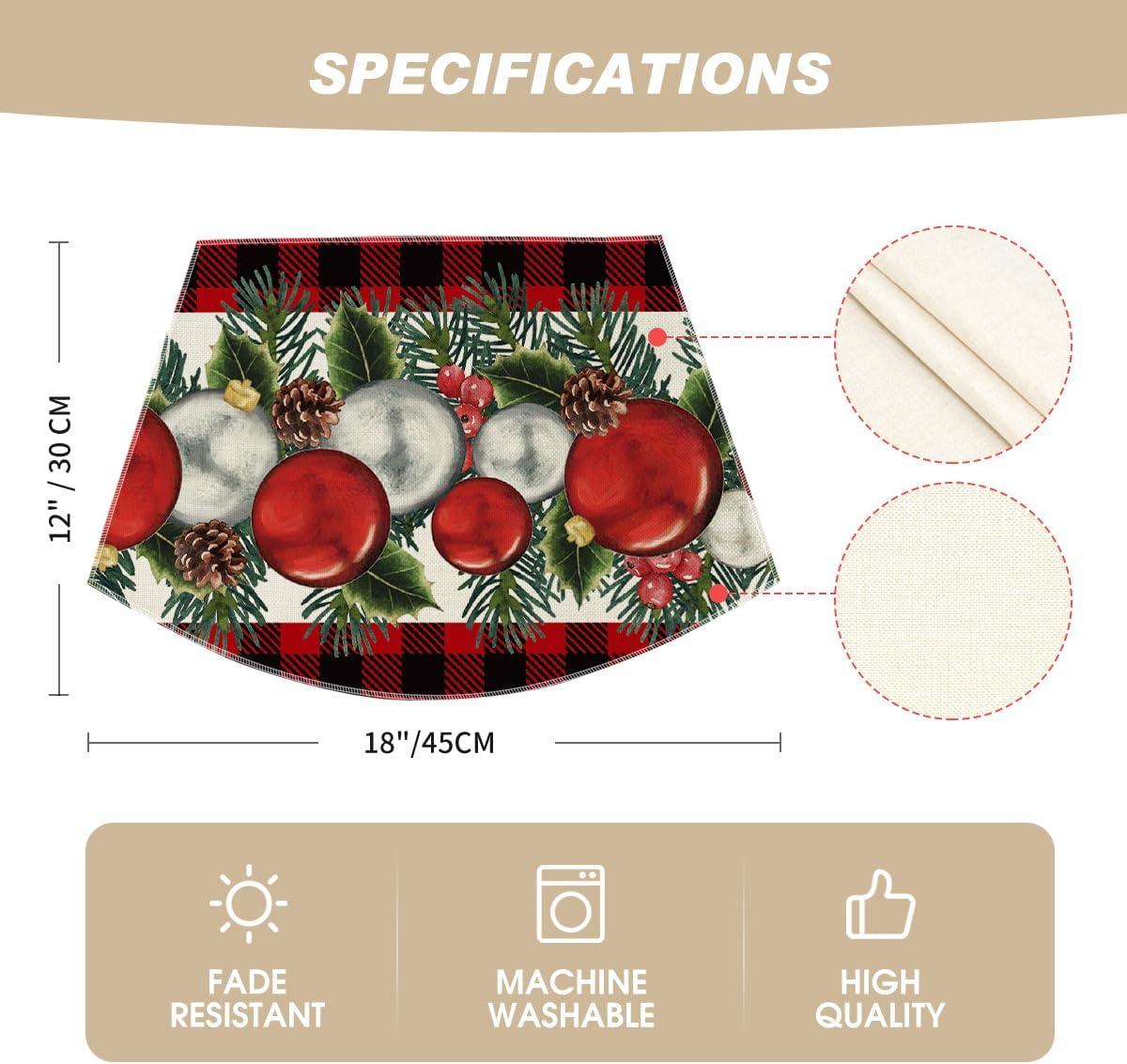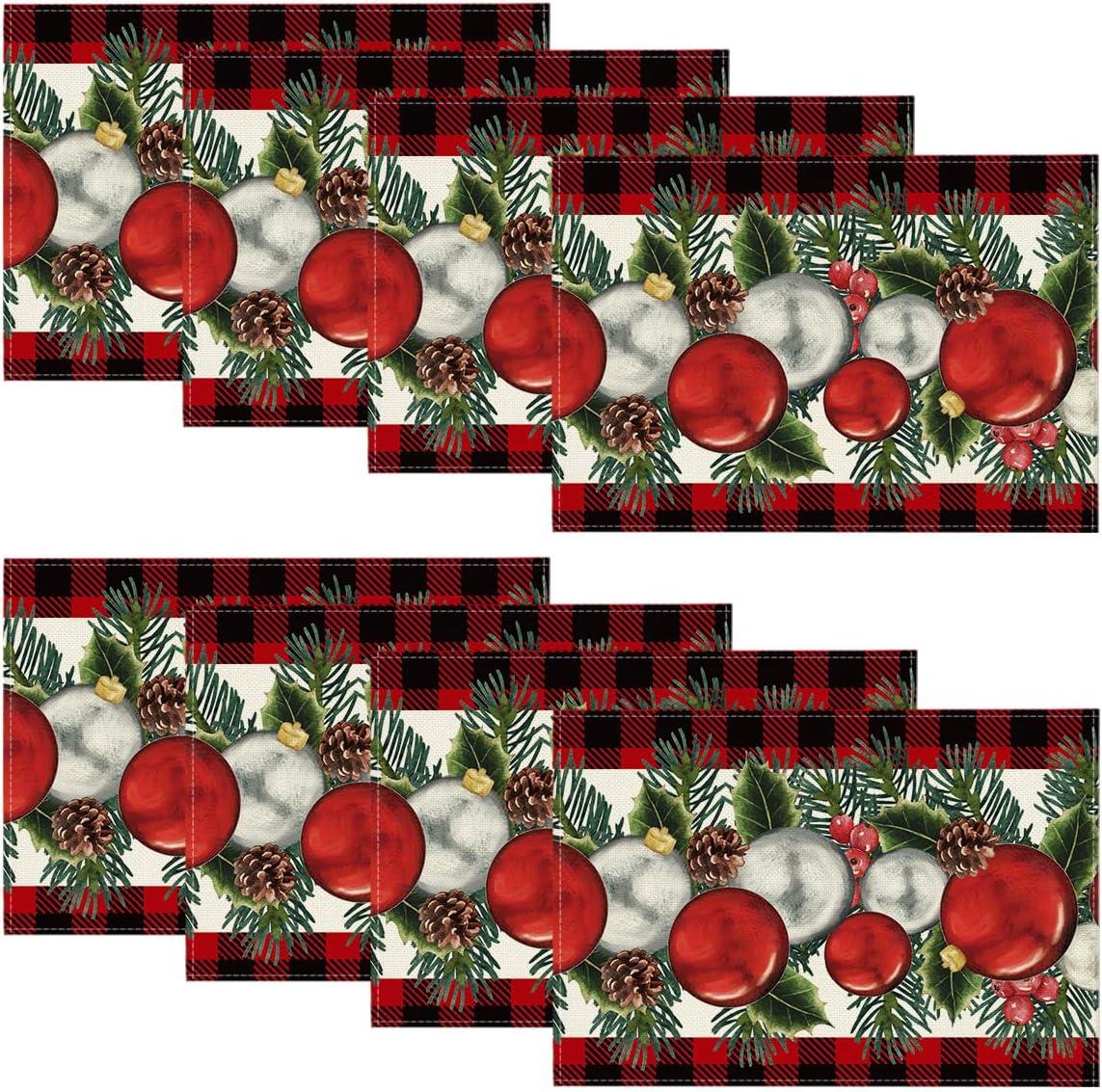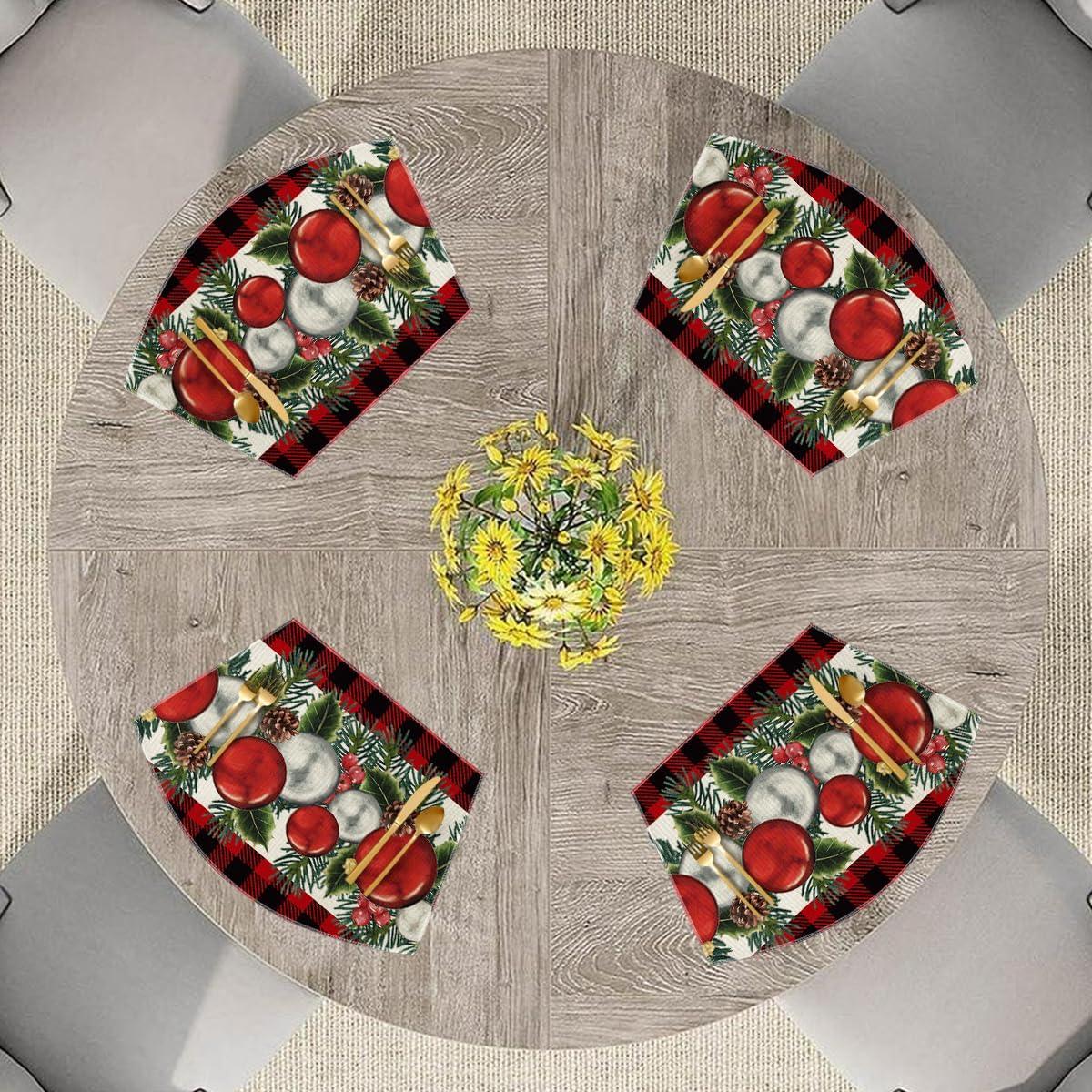 Artoid Mode Red Black Buffalo Plaid Holly Pine Cones Christmas Balls Placemats Set of 4, 12×18 Inch Seasonal Winter Table Mats for Party Kitchen Dining Decoration(Red/Black)