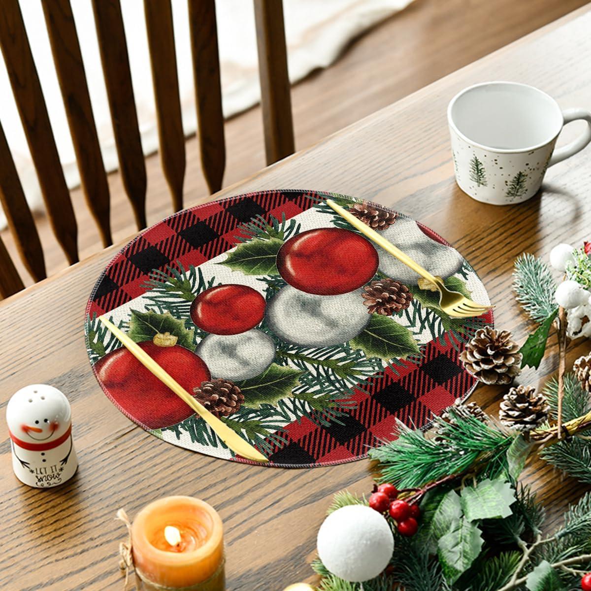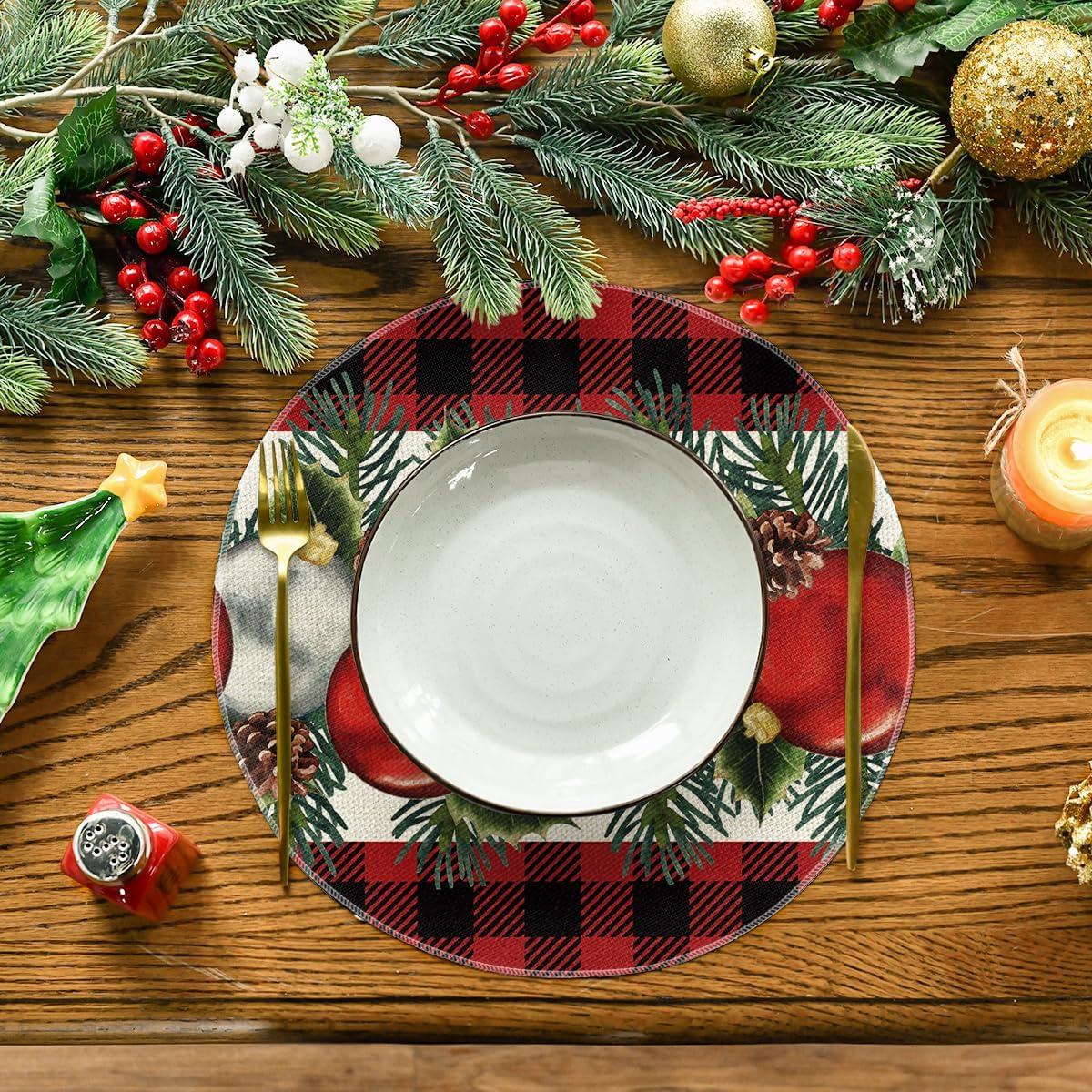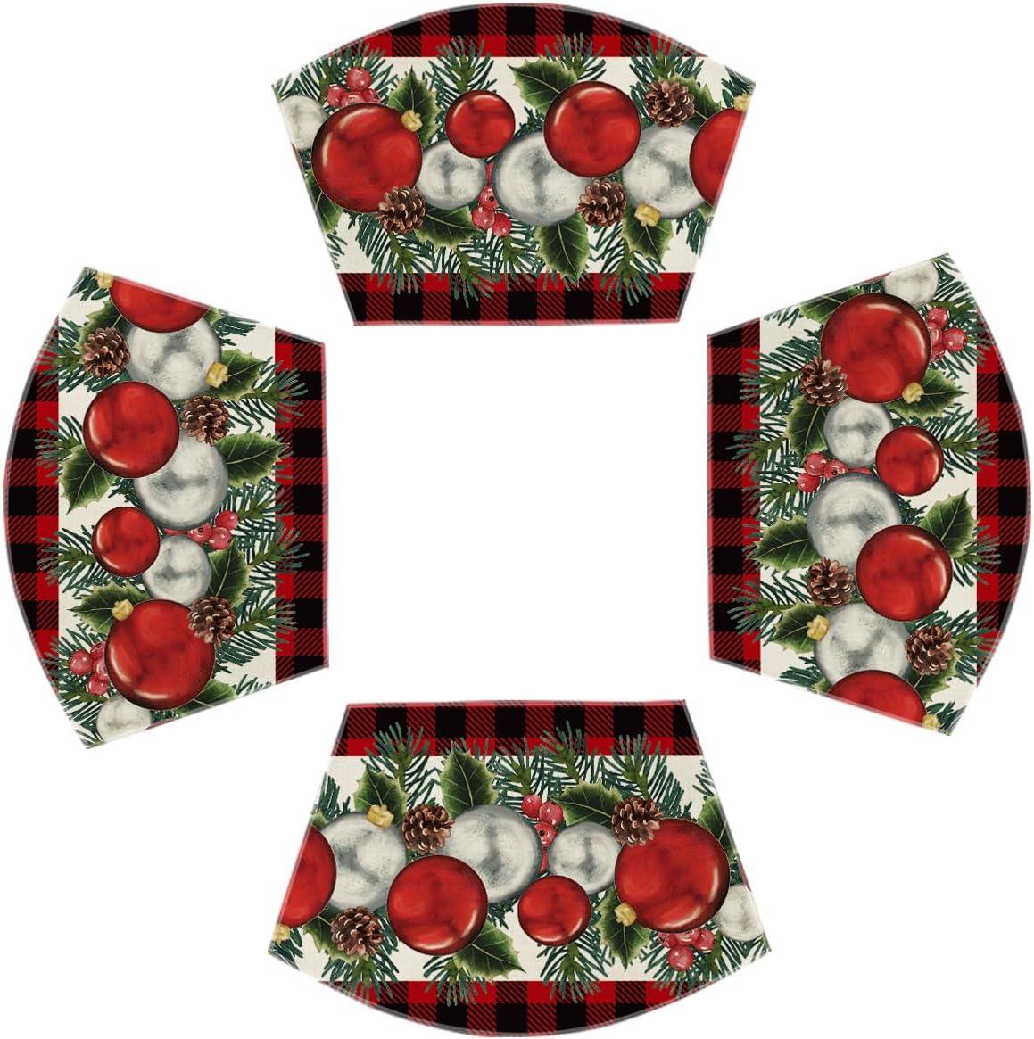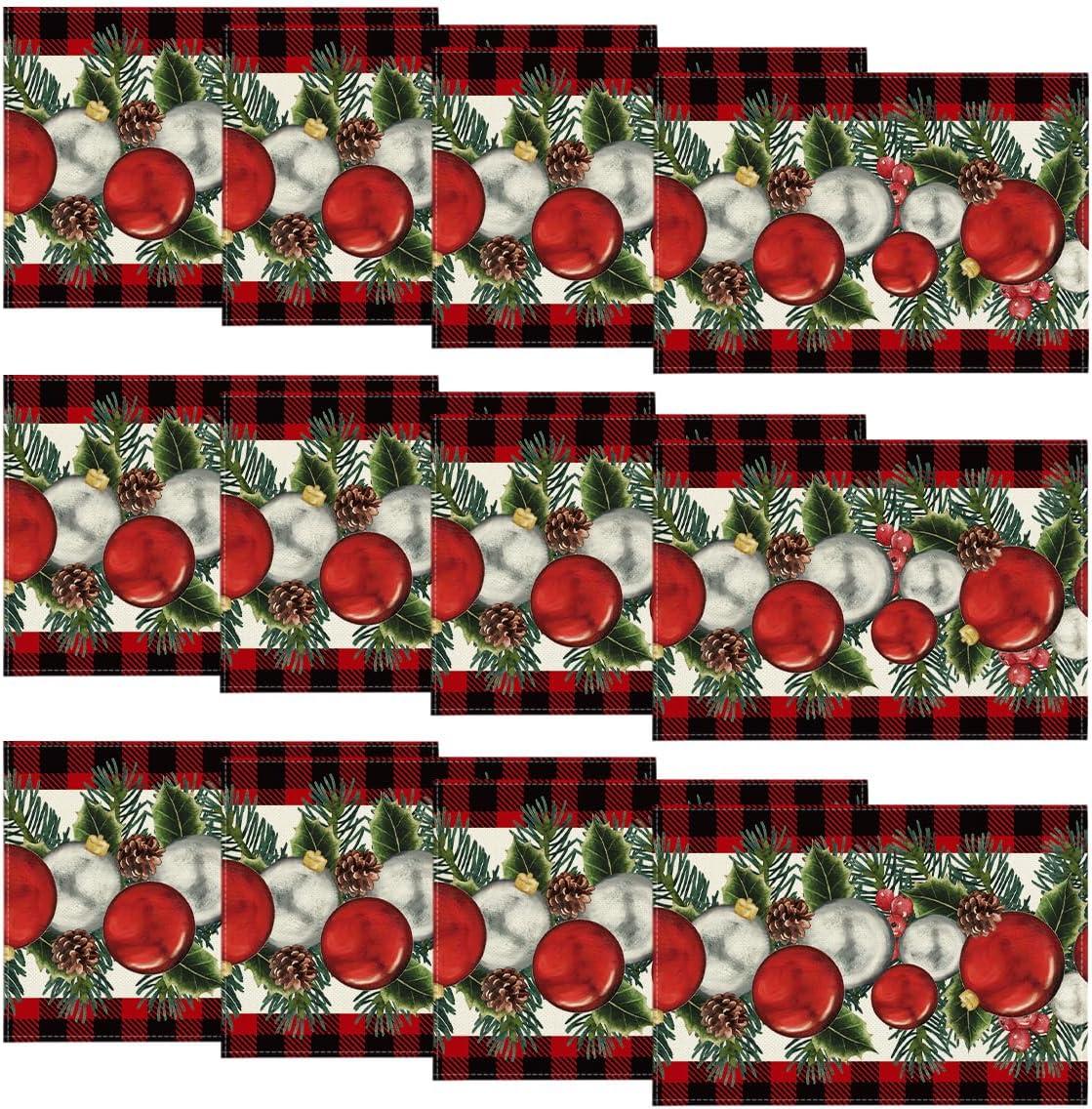 Artoid Mode Red Black Buffalo Plaid Holly Pine Cones Christmas Balls Placemats Set of 4, 12×18 Inch Seasonal Winter Table Mats for Party Kitchen Dining Decoration(Red/Black)