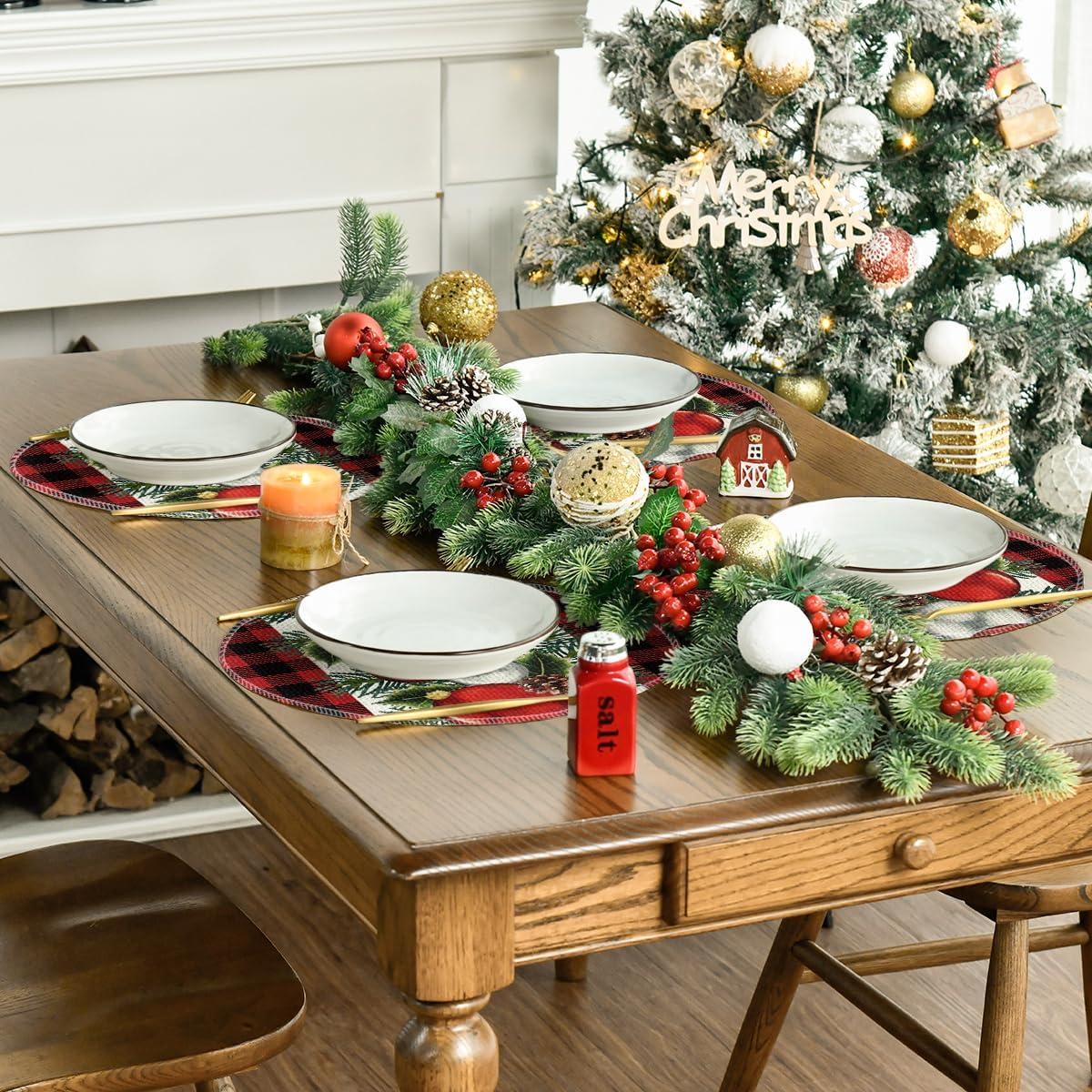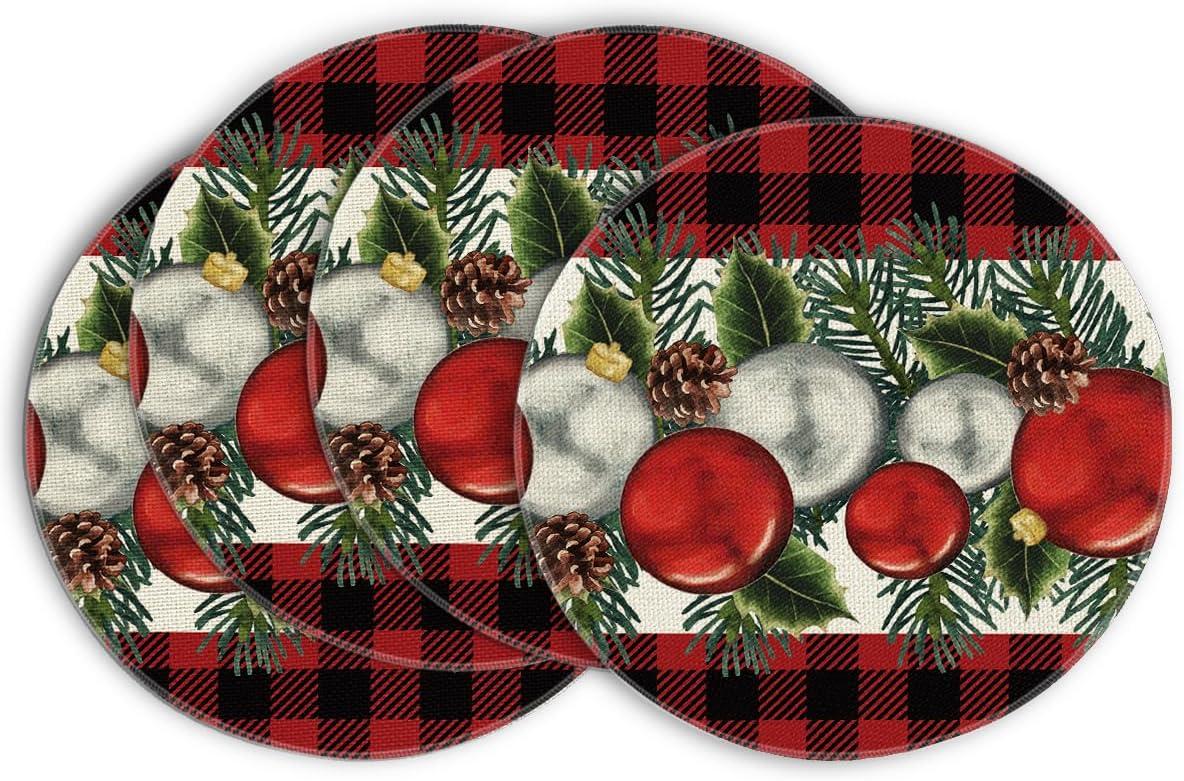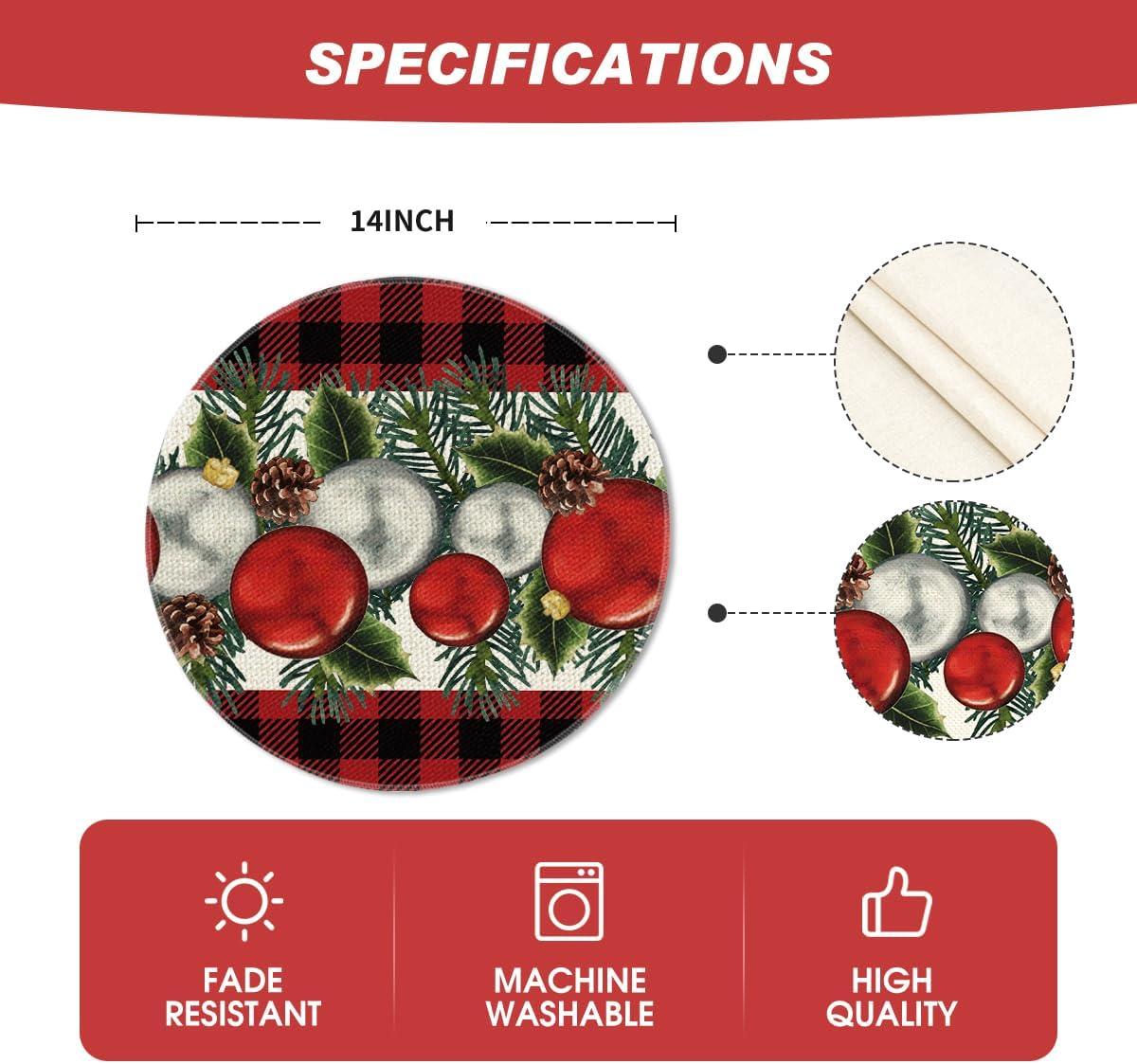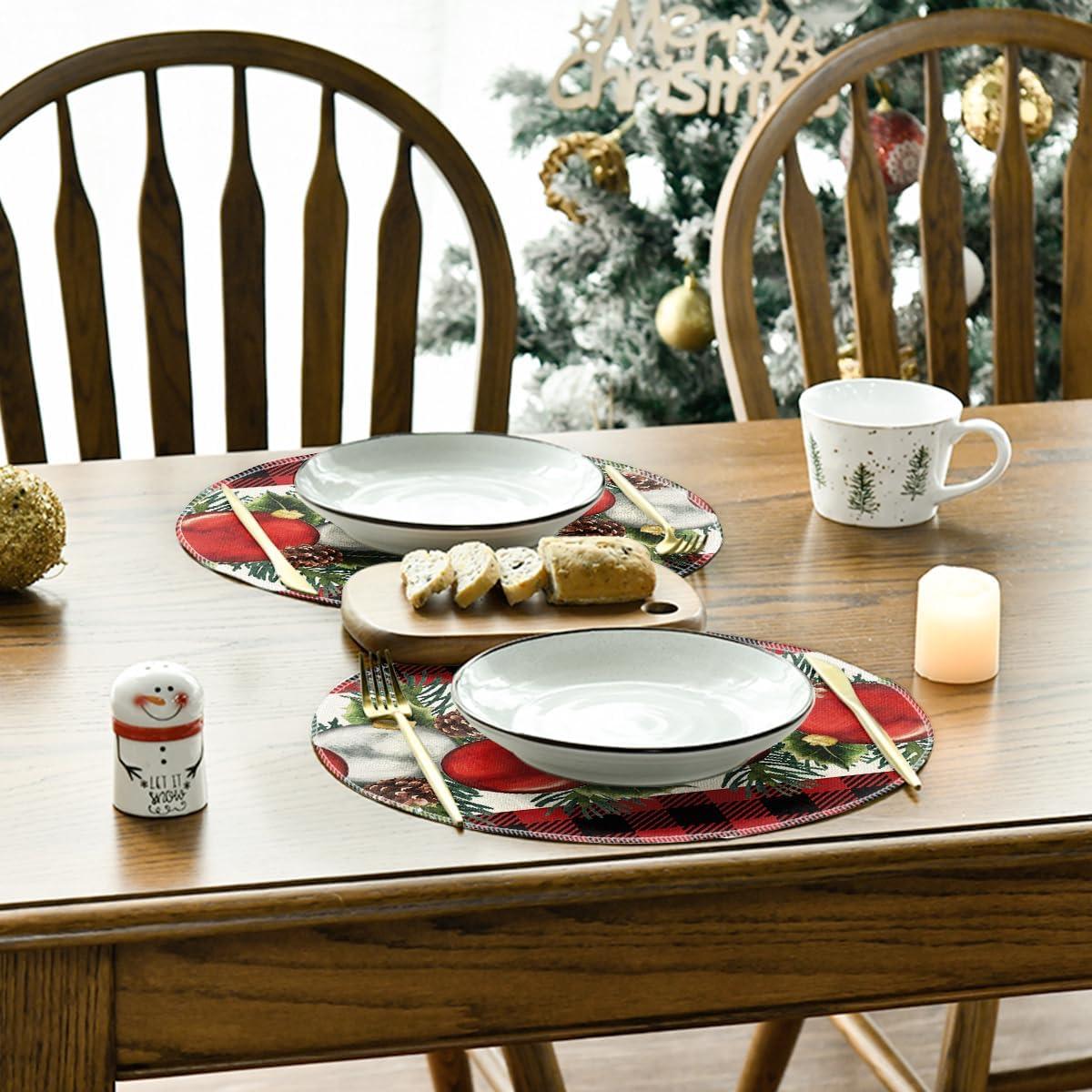 Artoid Mode Red Black Buffalo Plaid Holly Pine Cones Christmas Balls Placemats Set of 4, 12×18 Inch Seasonal Winter Table Mats for Party Kitchen Dining Decoration(Red/Black)