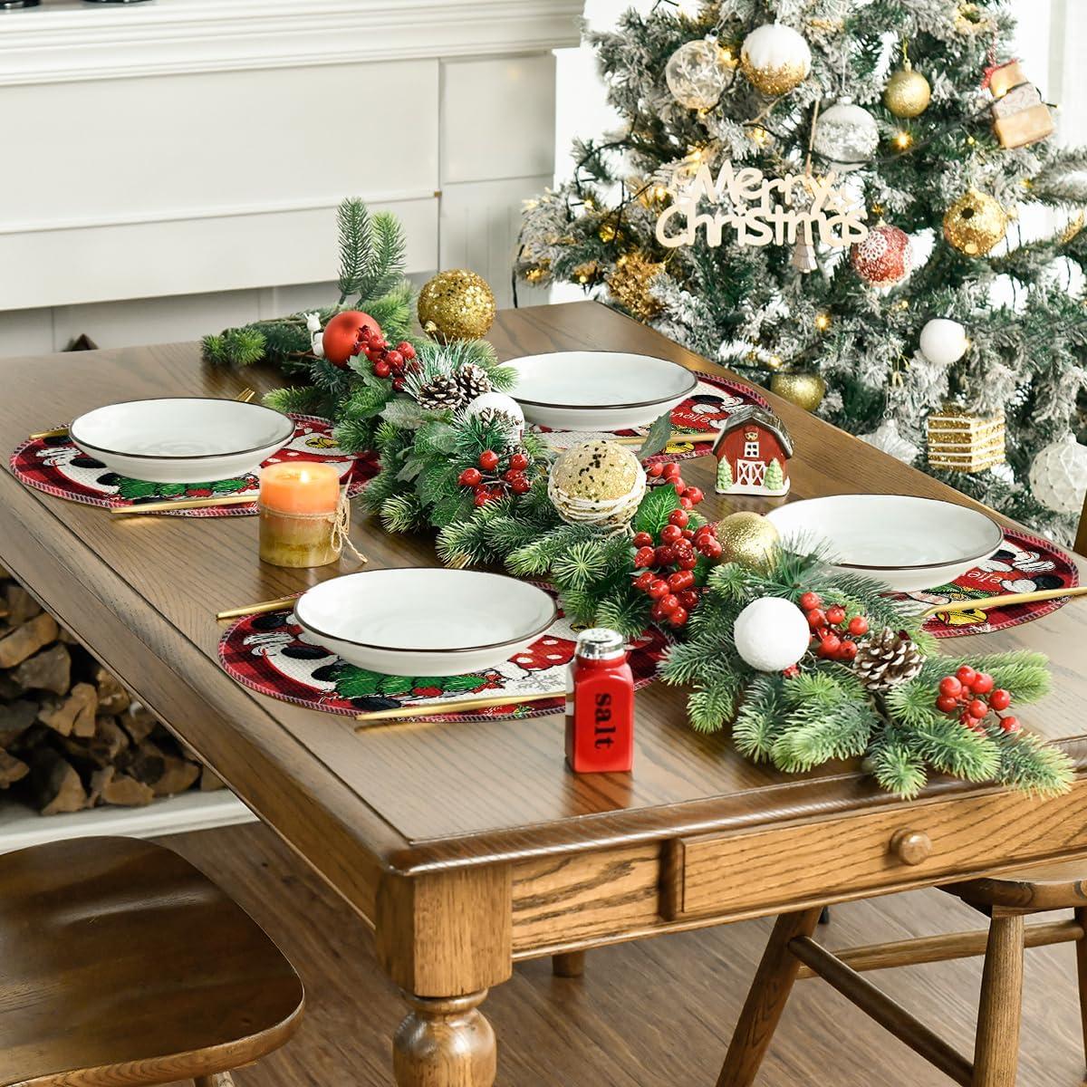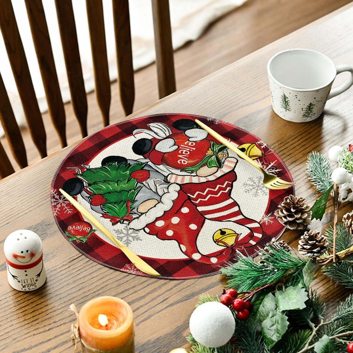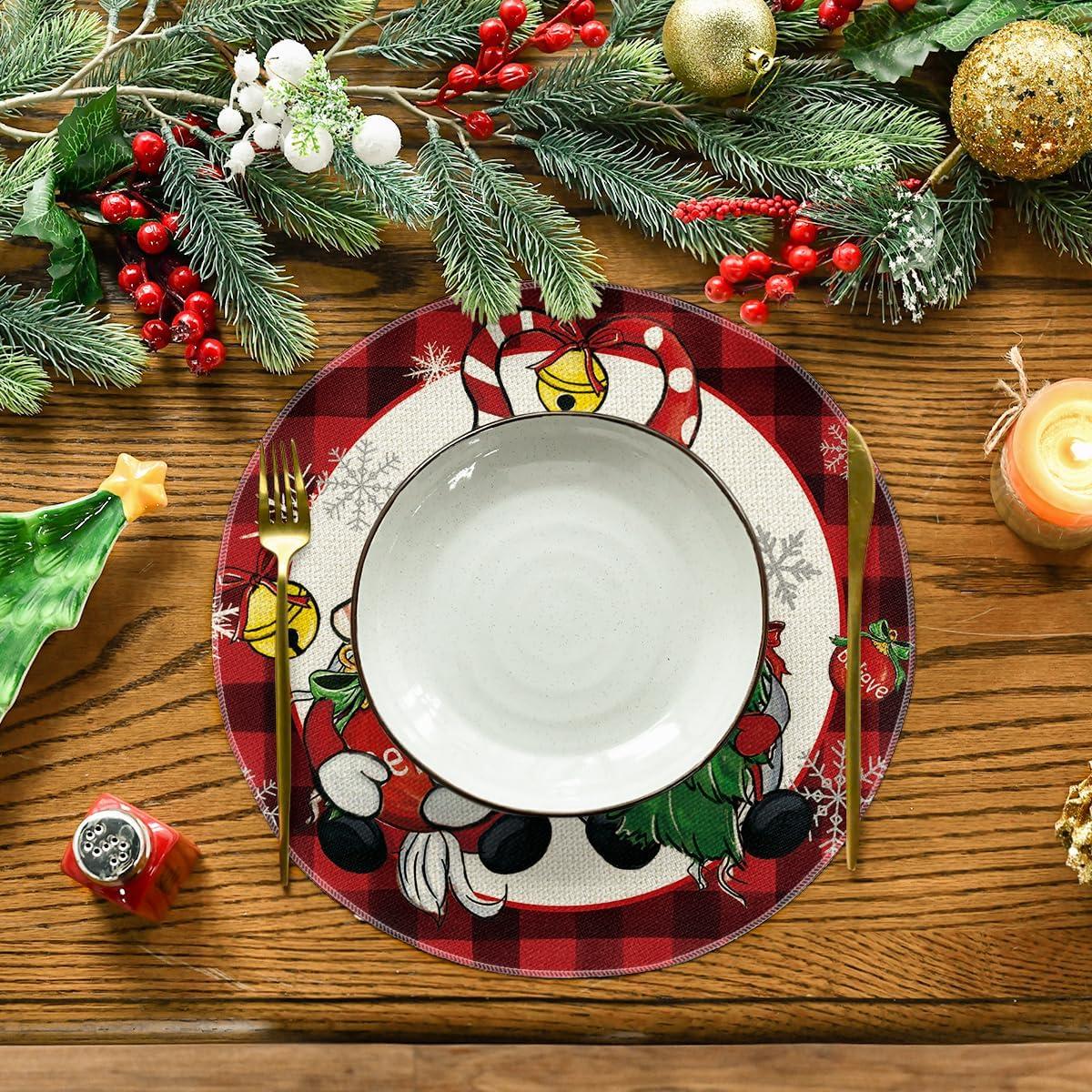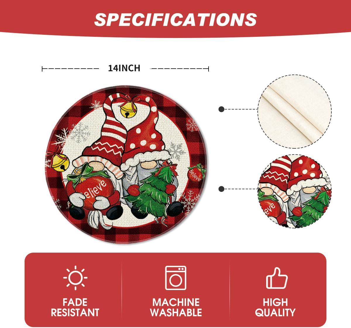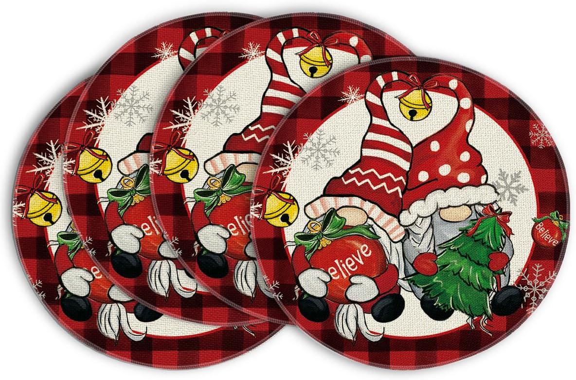 Artoid Mode Red Buffalo Plaid Gnome Believe Xmas Balls Merry Christmas Round Placemats Set of 4, 14 Inch Winter Round Table Mats for Dining Decoration(Red/Black)