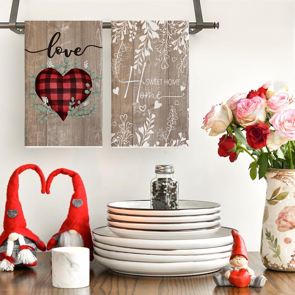 Artoid Mode Red Buffalo Plaid Heart Love Valentine’s Kitchen Towels Dish Towels, 18×26 Inch Farmhouse Wedding Decoration Hand Towels Set of 4(Wood)
