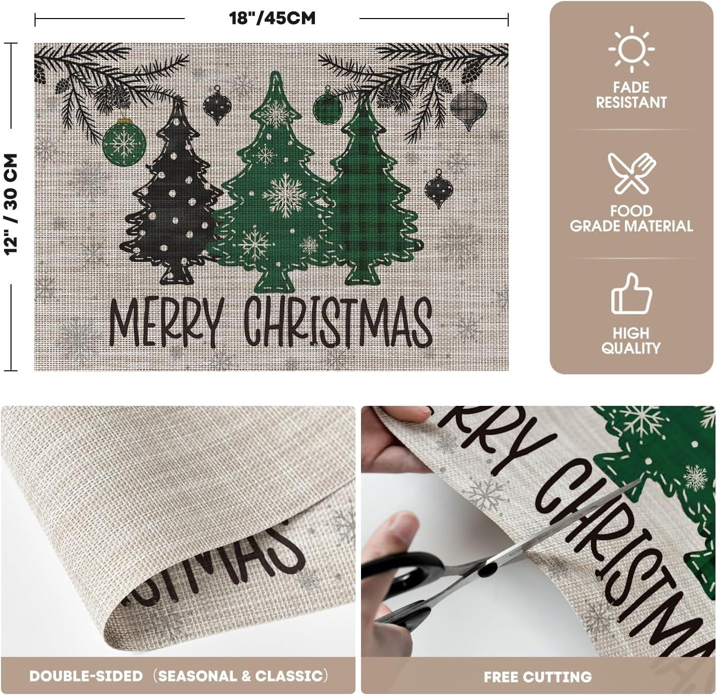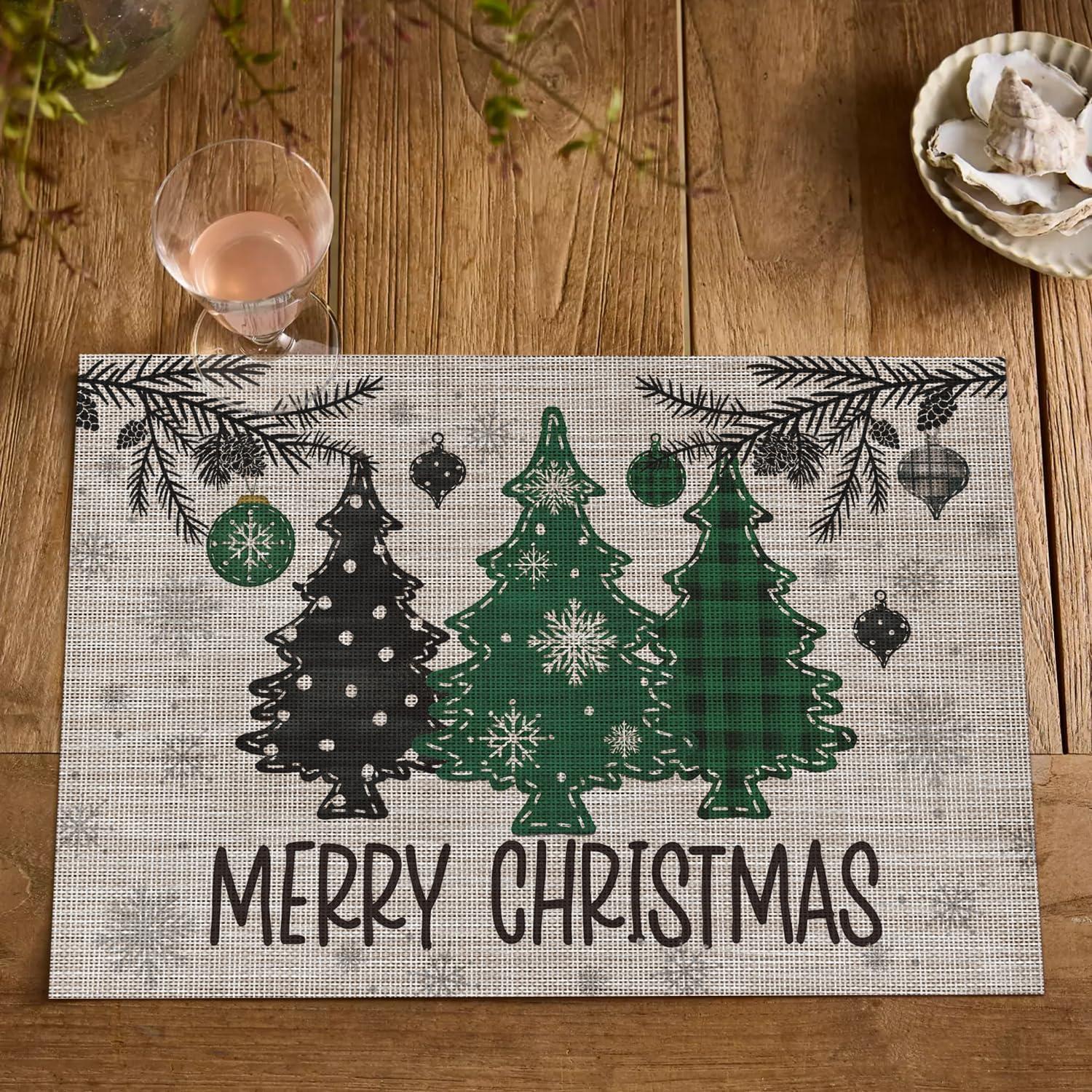 Artoid Mode Red Pine Trees Balls Christmas Vinyl Placemats Set of 4, 12×18 Inch Wipeable Winter PVC Woven Table Mats for Party Kitchen Dining Decor(Beige/Green)