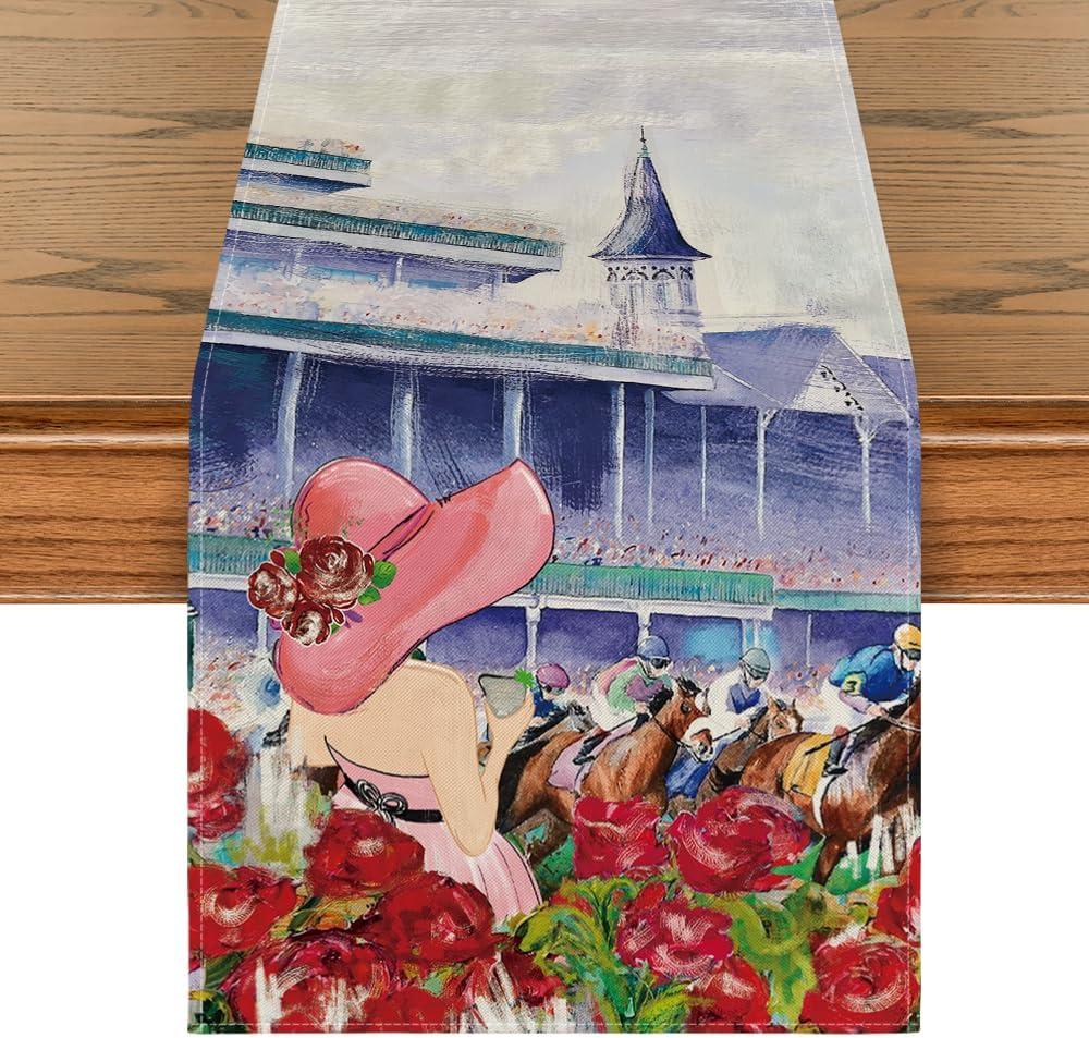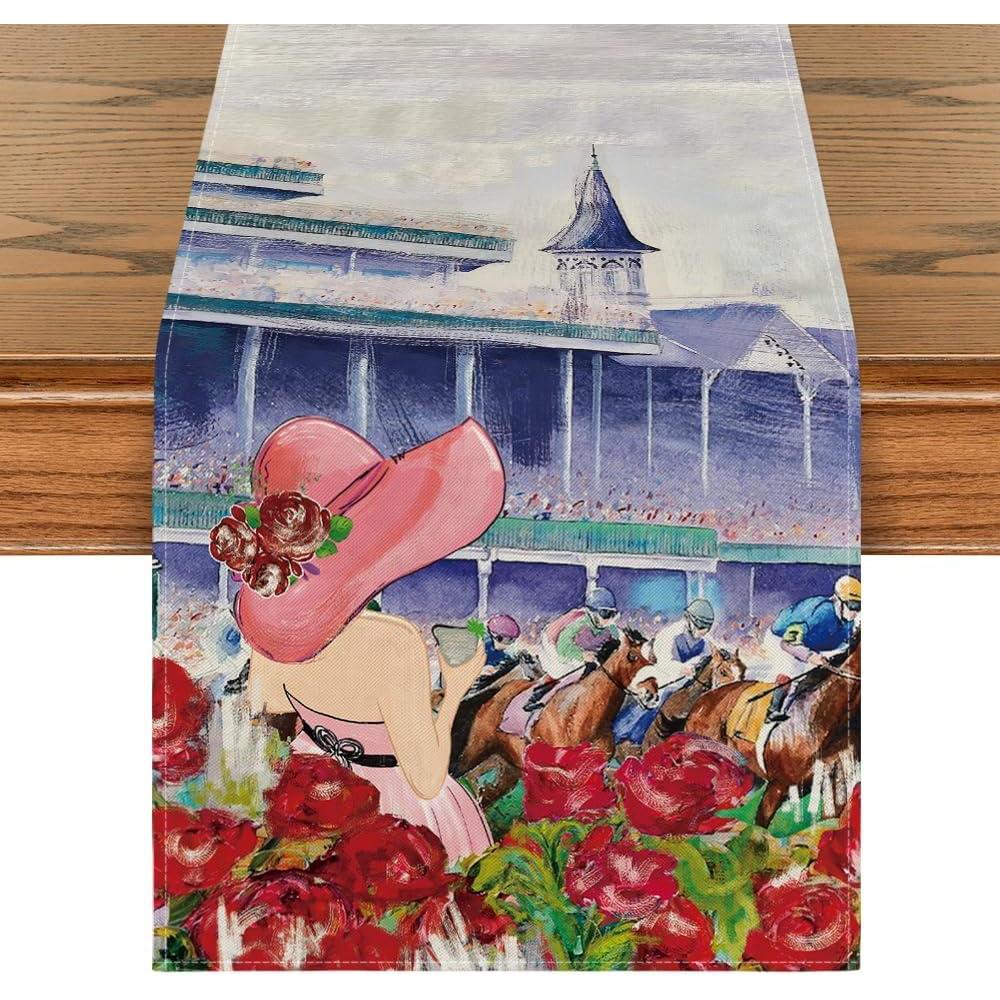 Artoid Mode Rose Horse Racing Castle Kentucky Table Runner, Sports Festival Kitchen Dining Table Decoration for Home Party Decor 13×72 Inch(Beige)