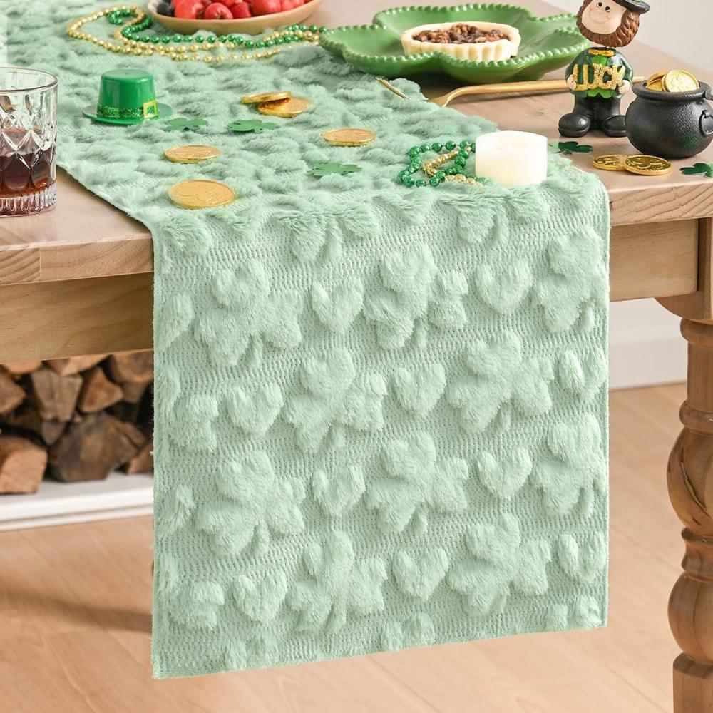 Artoid Mode Sage Green Soft Plush Faux Fur Jacquard Heart Clover St. Patrick’s Day Table Runner, Seasonal Kitchen Dining Table Decoration for Home Party Decor 13×72 Inch(Sage Green)