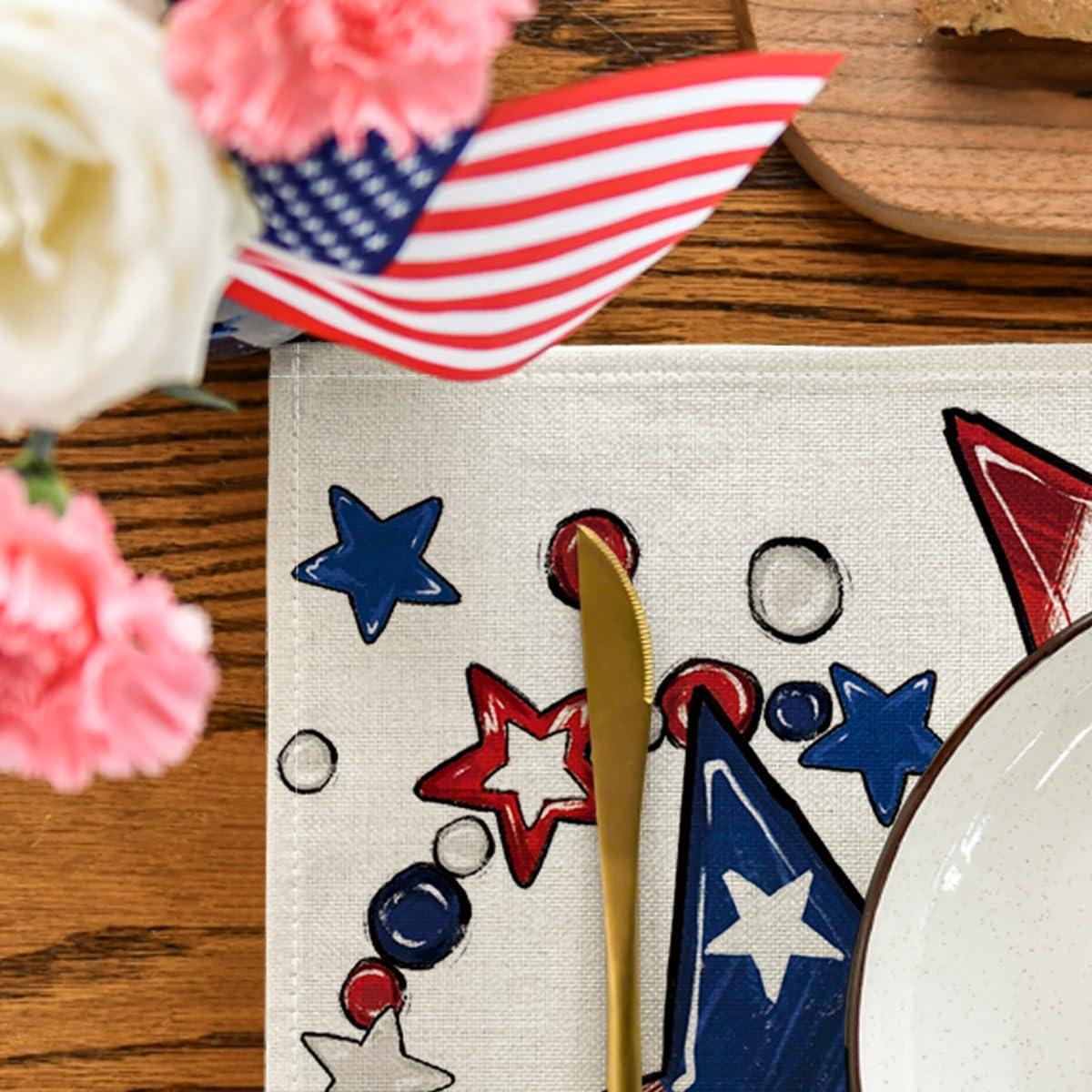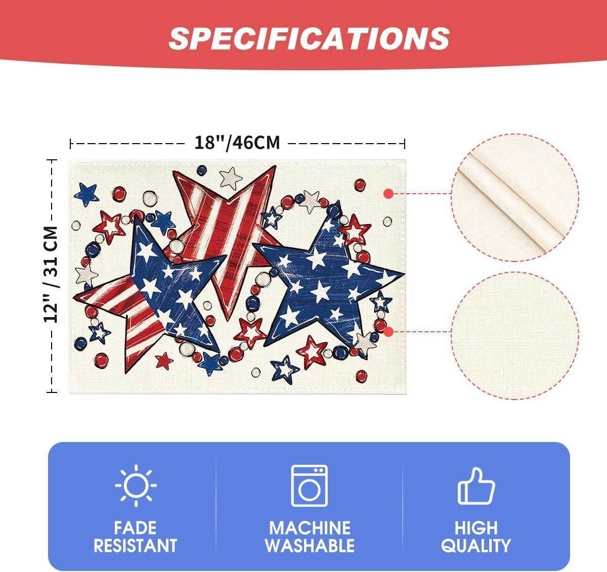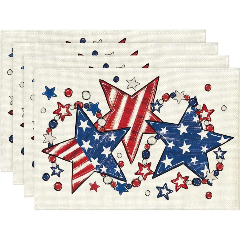 Artoid Mode Silver Beads Stars Patriotic 4th of July Placemats Set of 4, 12×18 Inch Memorial Day Table Mats for Party Kitchen Dining Decoration(Beige)