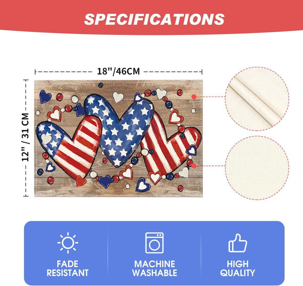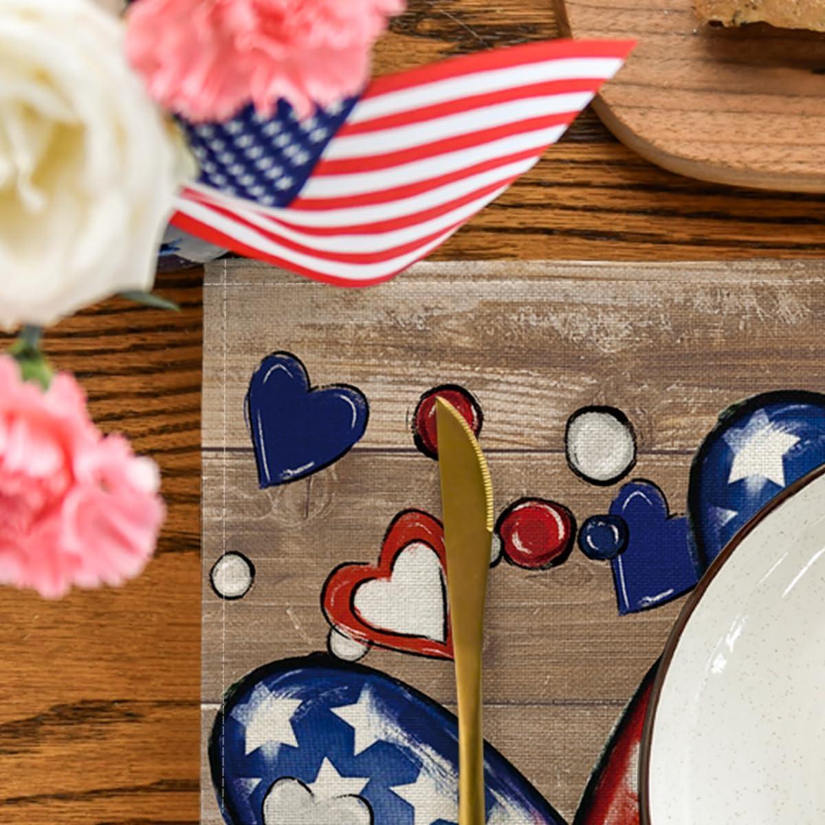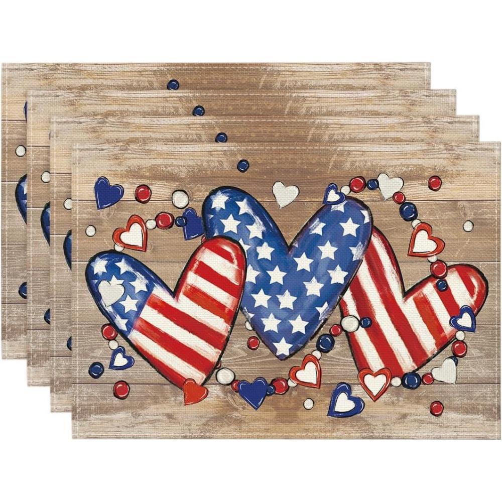 Artoid Mode Silver Beads Stars Patriotic 4th of July Placemats Set of 4, 12×18 Inch Memorial Day Table Mats for Party Kitchen Dining Decoration(Wood Heart)