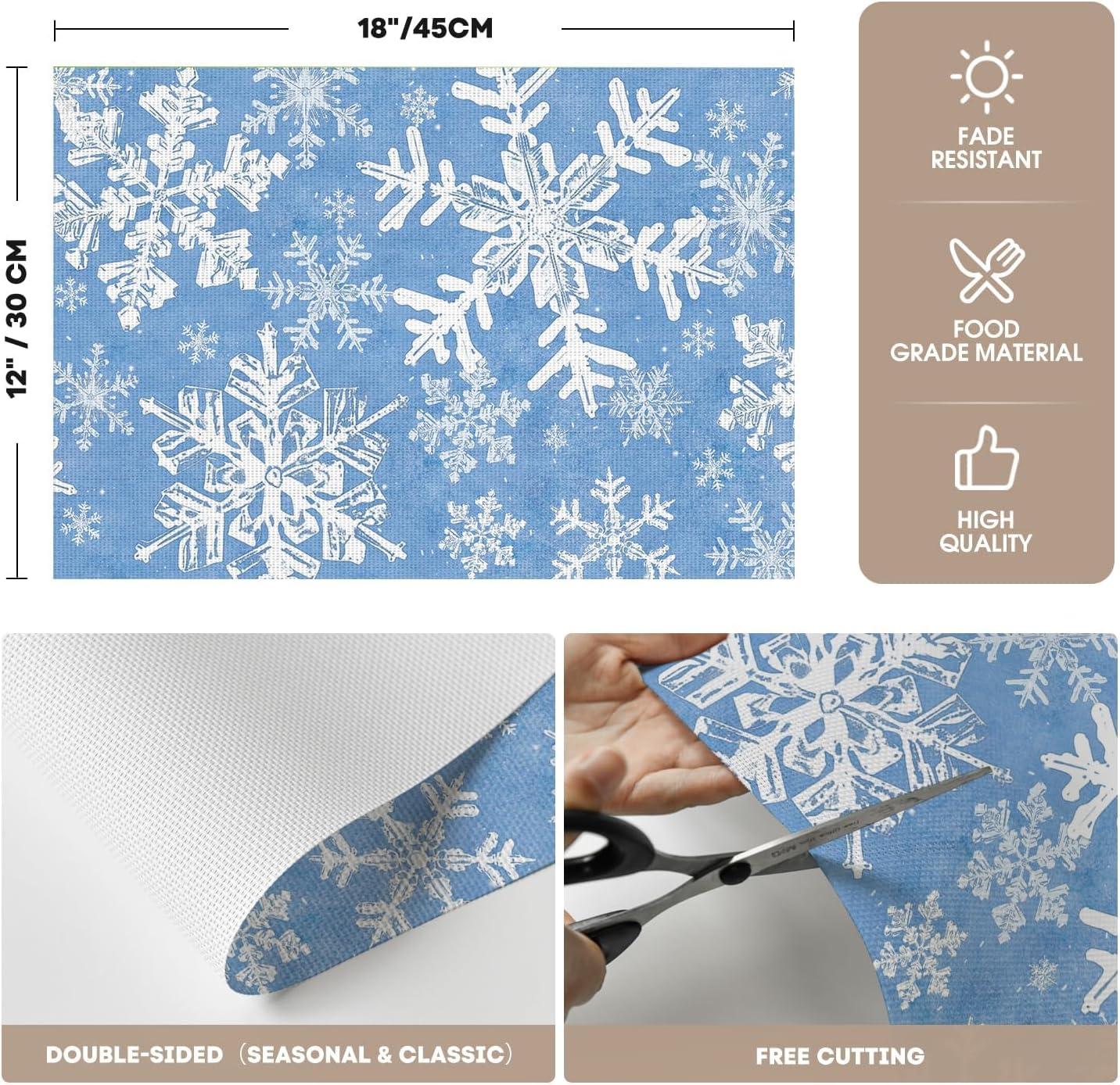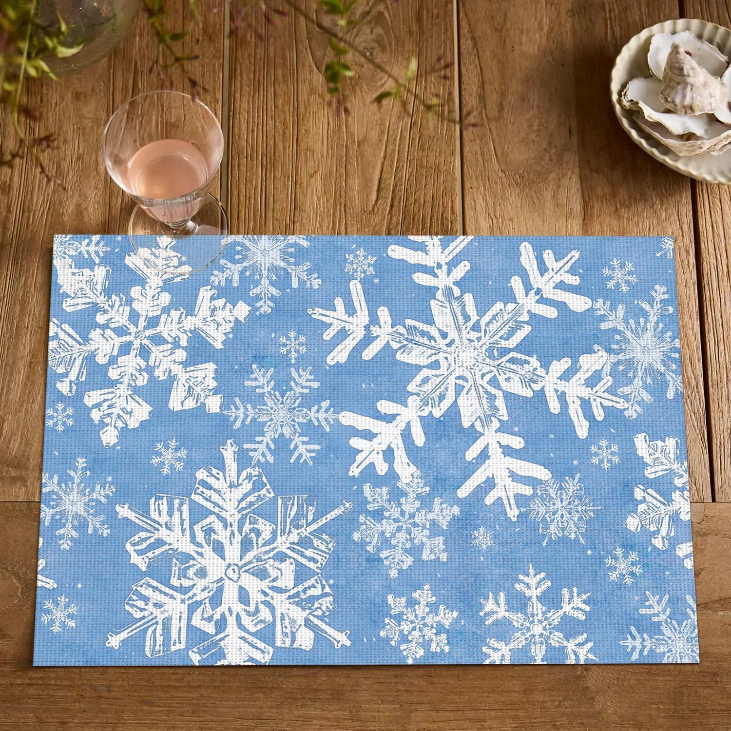 Artoid Mode Snowflakes Christmas Vinyl Placemats Set of 4, 12×18 Inch Wipeable Navy Blue Winter PVC Woven Table Mats for Party Kitchen Dining Decor(Blue/White)