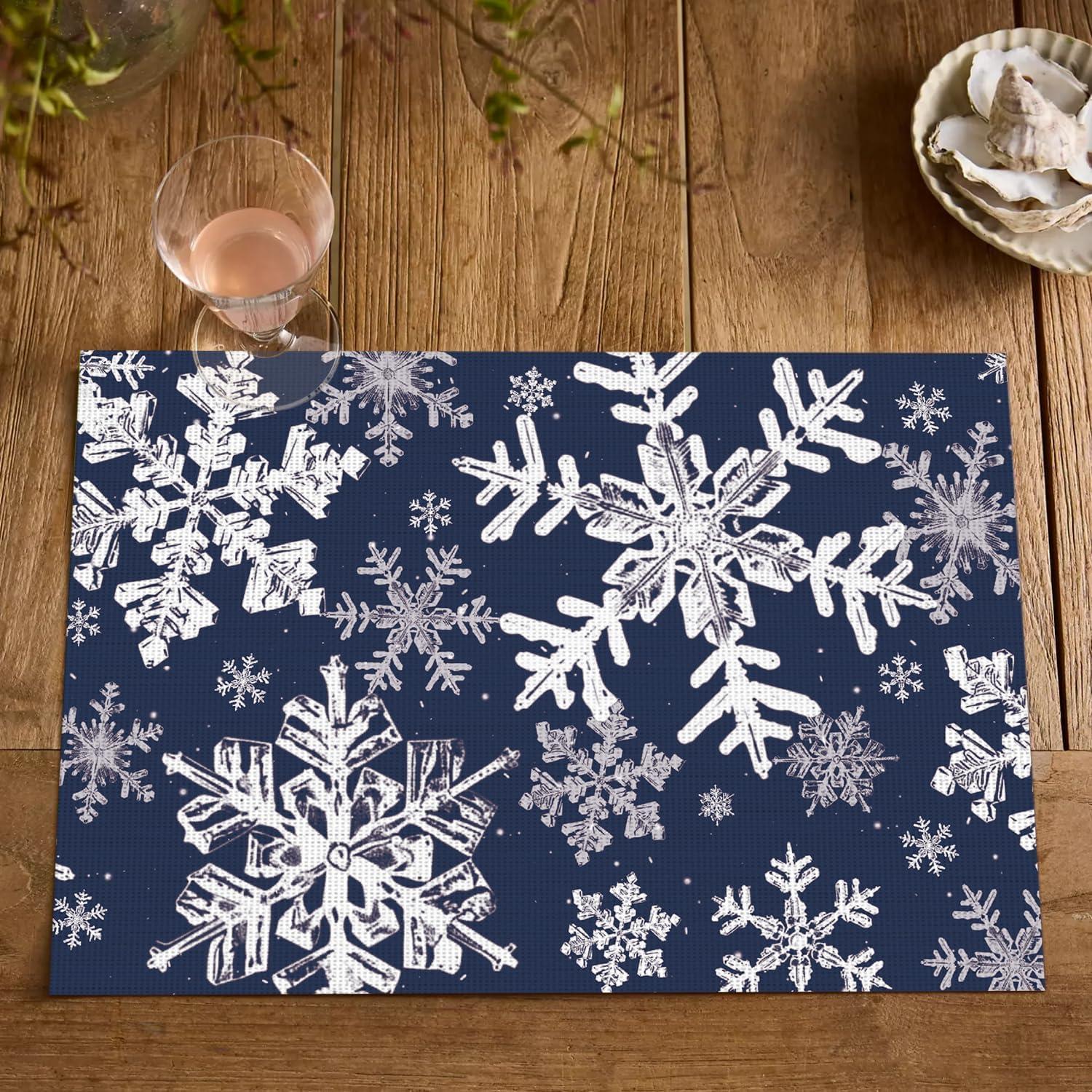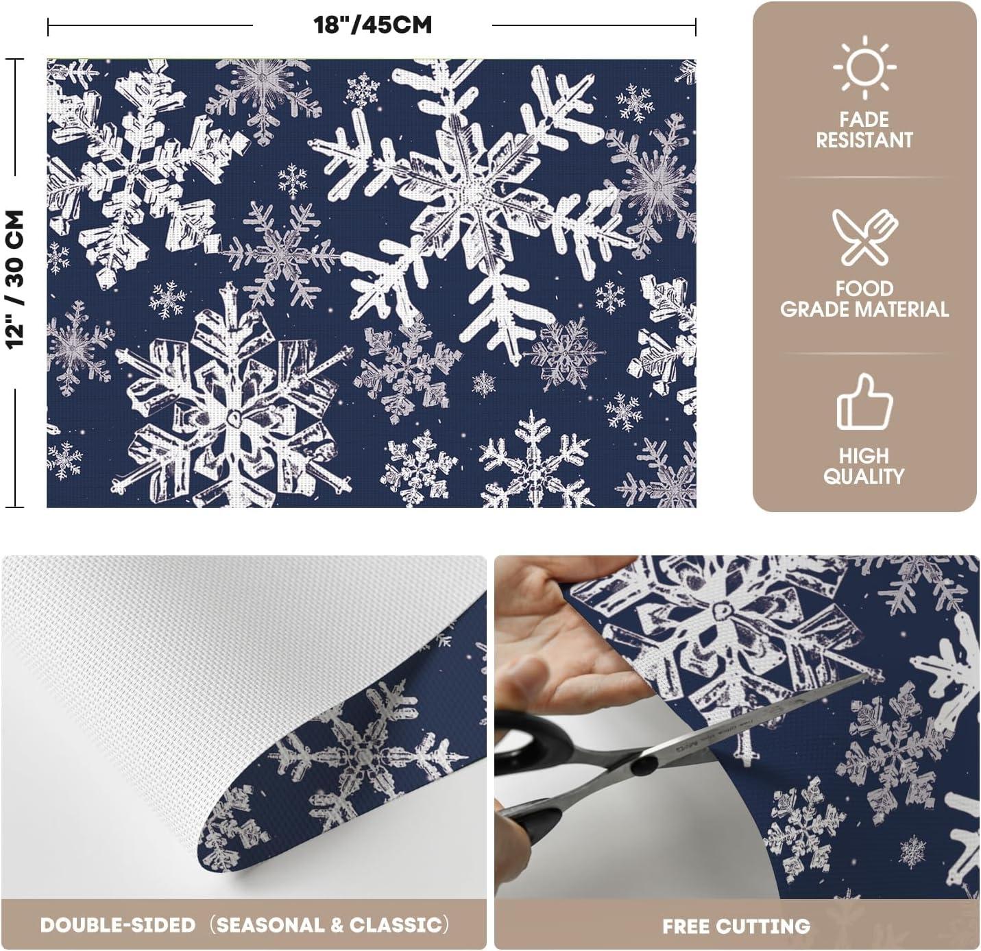 Artoid Mode Snowflakes Christmas Vinyl Placemats Set of 4, 12×18 Inch Wipeable Navy Blue Winter PVC Woven Table Mats for Party Kitchen Dining Decor(Blue)