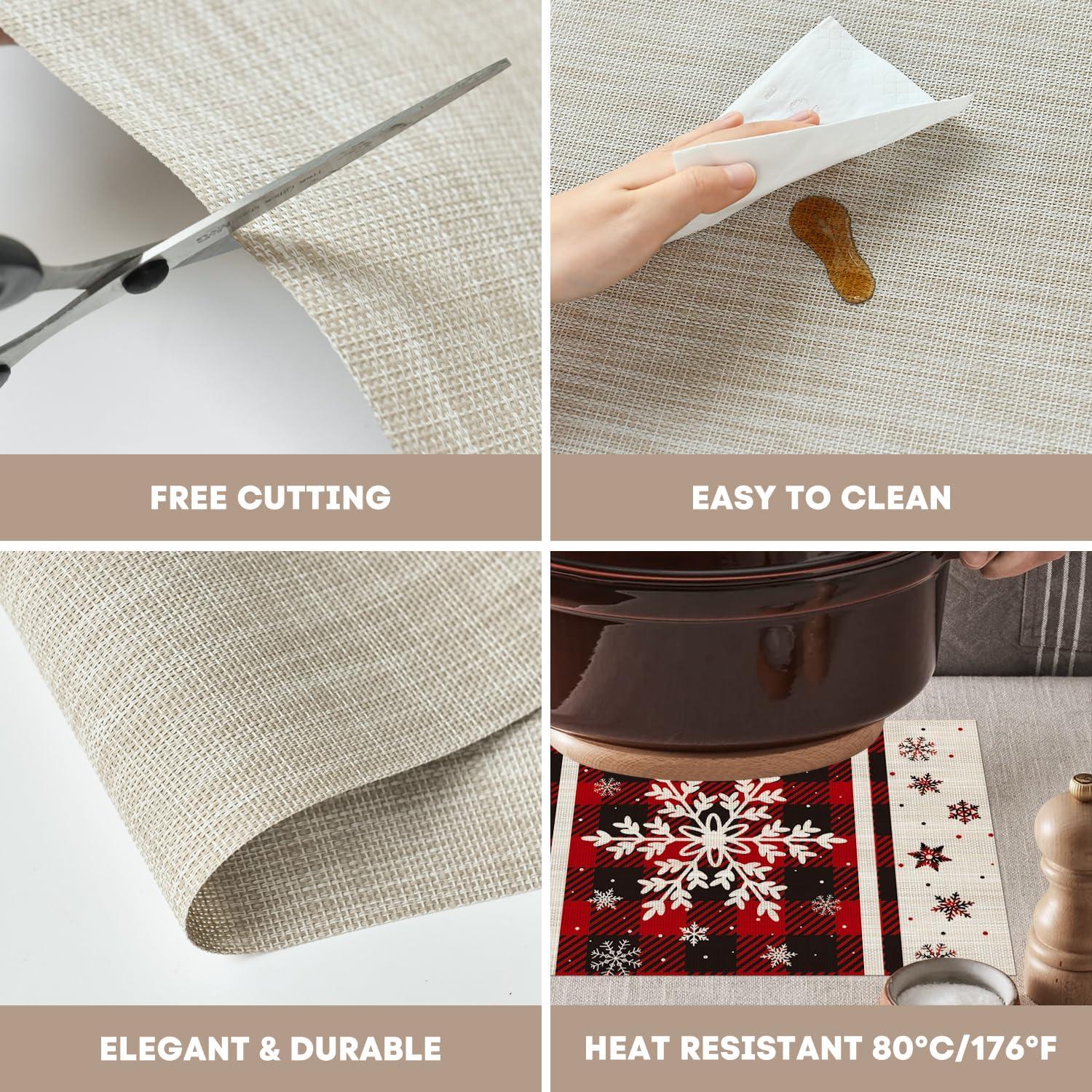 Easy To Clean:The washable placemats simply wipe with soap,water and a soft sponge or cloth.Scrub stubborn stains with a soft bristle-brush and a bleach-based cleanse.