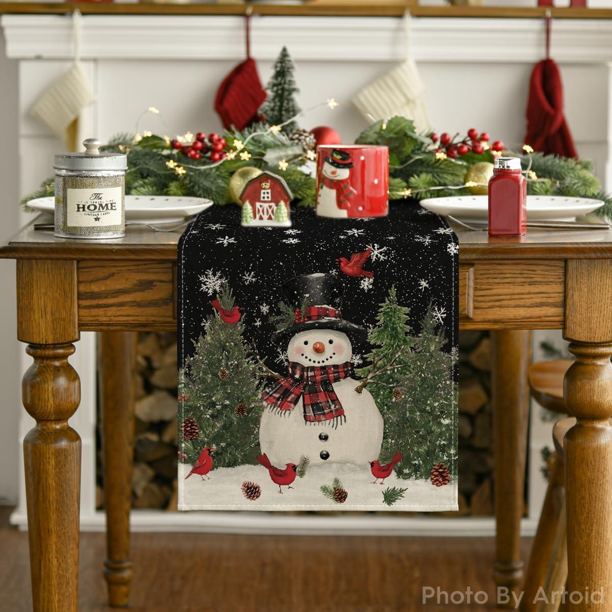 Artoid Mode Snowman Christmas Birds Trees Table Runner, Seasonal Winter Xmas Holiday Kitchen Dining Table Decoration for Indoor Outdoor Home Party Decor 13 x 72 Inch(Black)