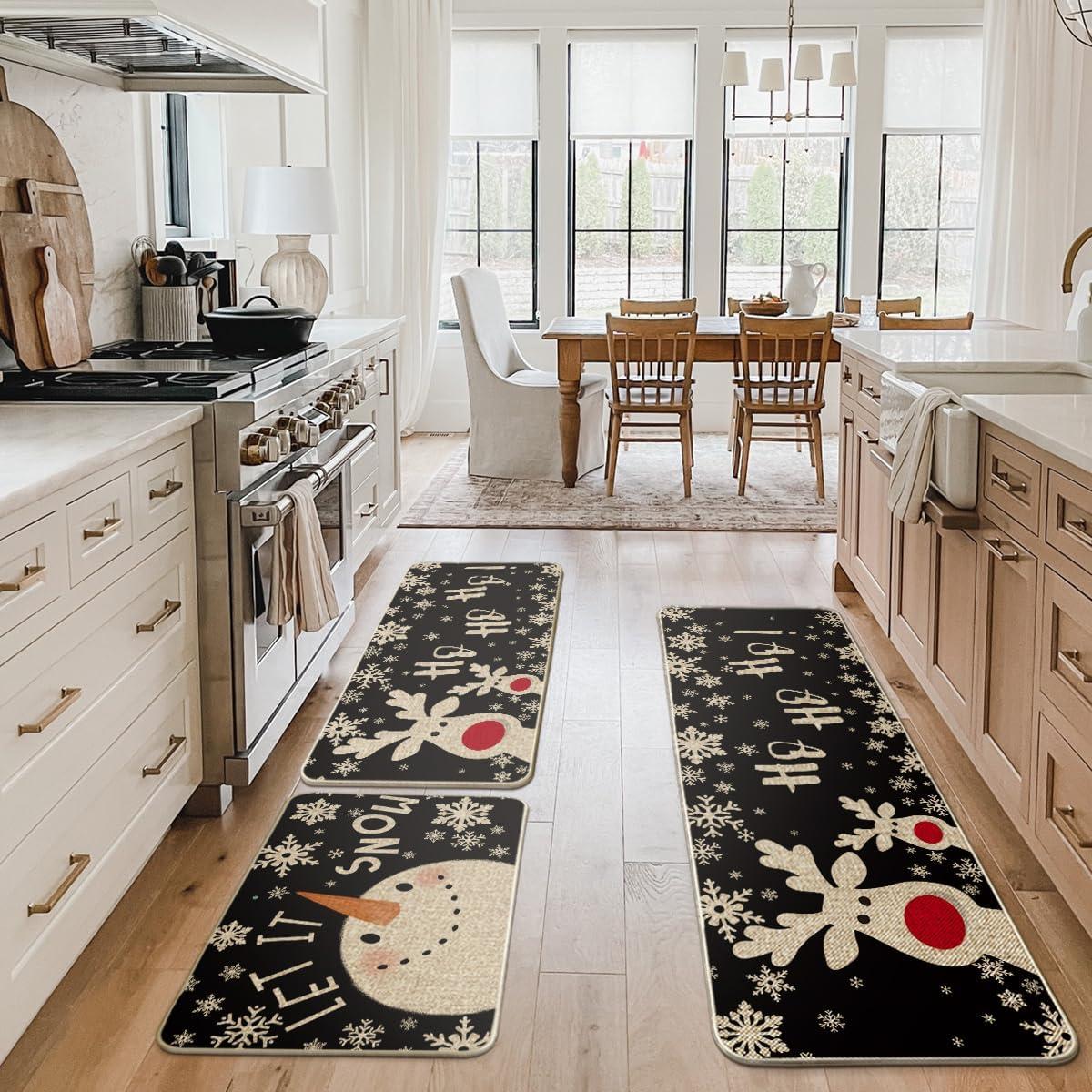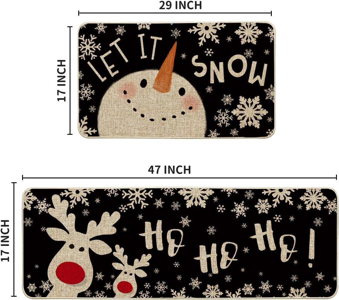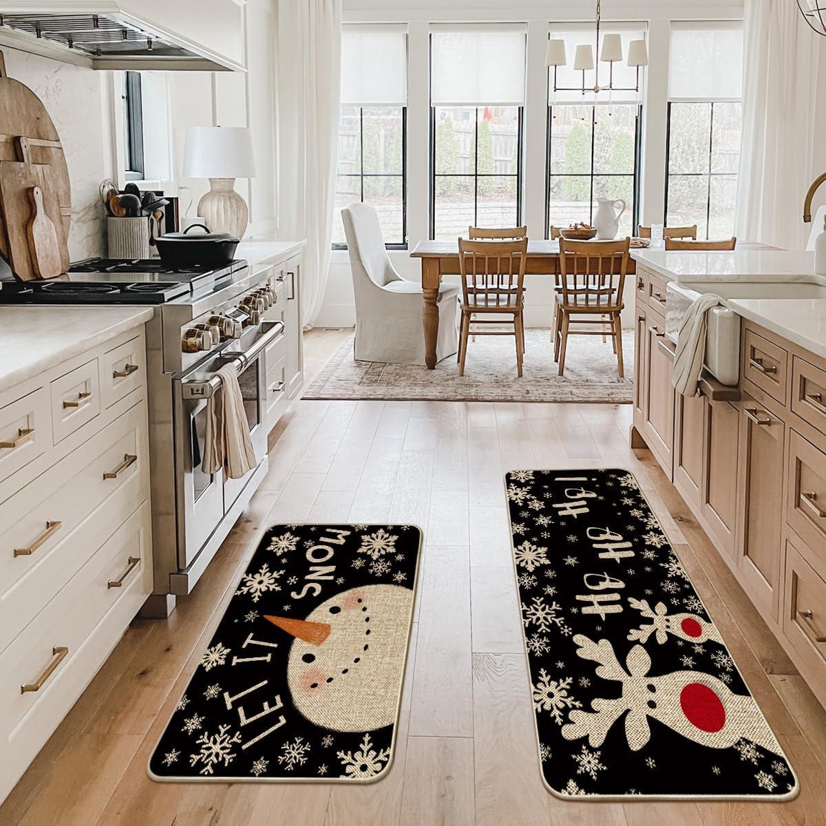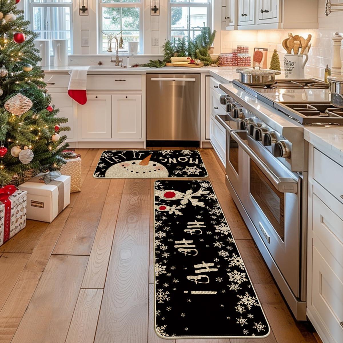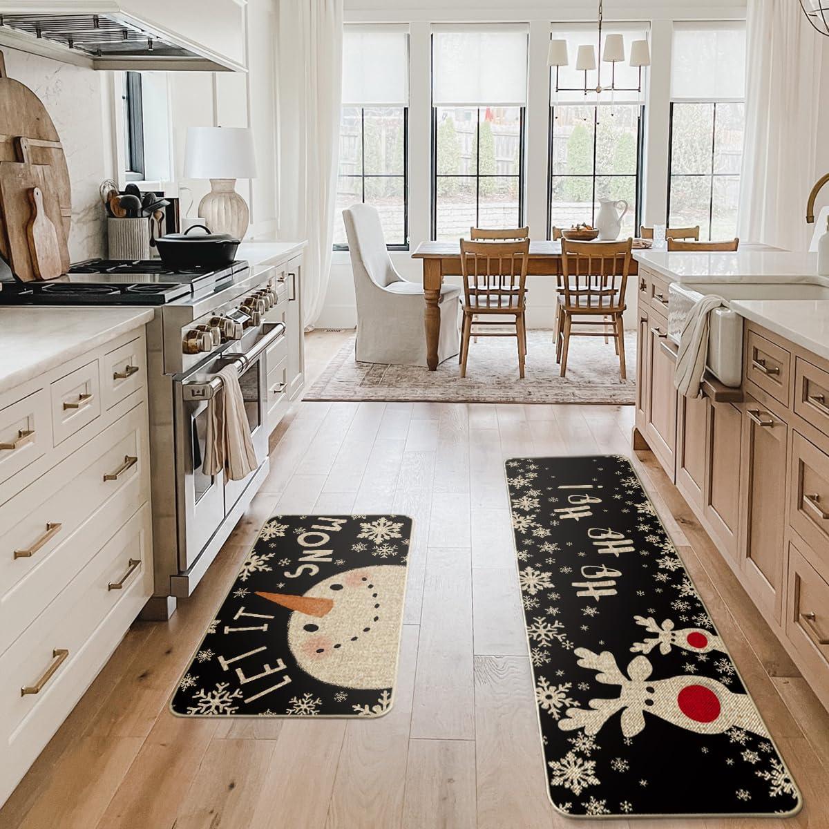 Artoid Mode Snowman Deer Let It Snow Snowflake Christmas Kitchen Mats Set of 2, Winter Decor Low-Profile Kitchen Rugs for Floor – 17×29 and 17×47 Inch(Black)