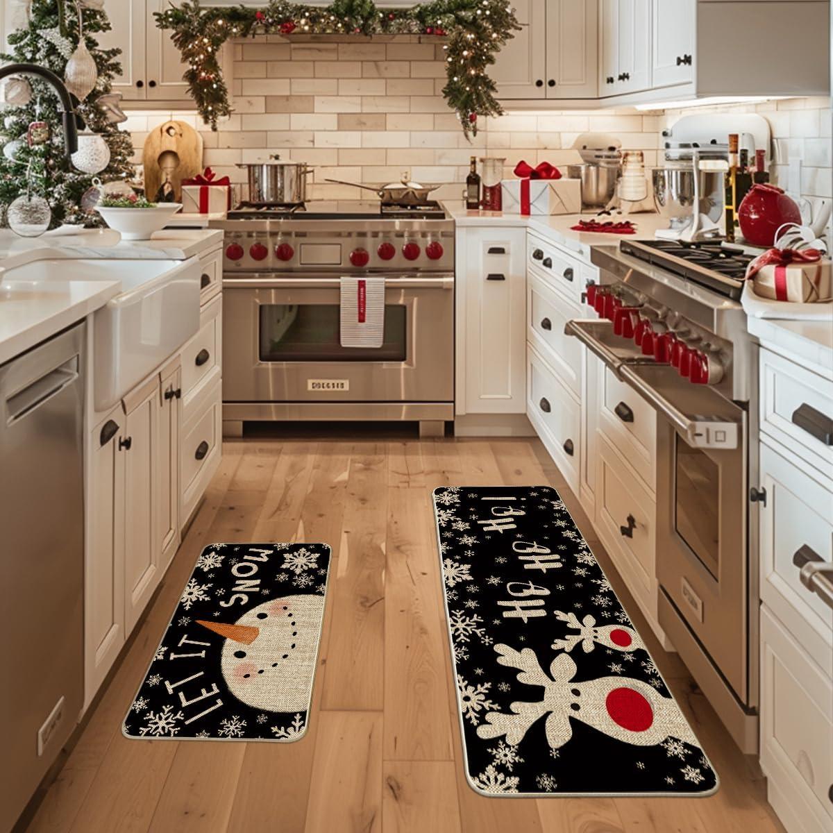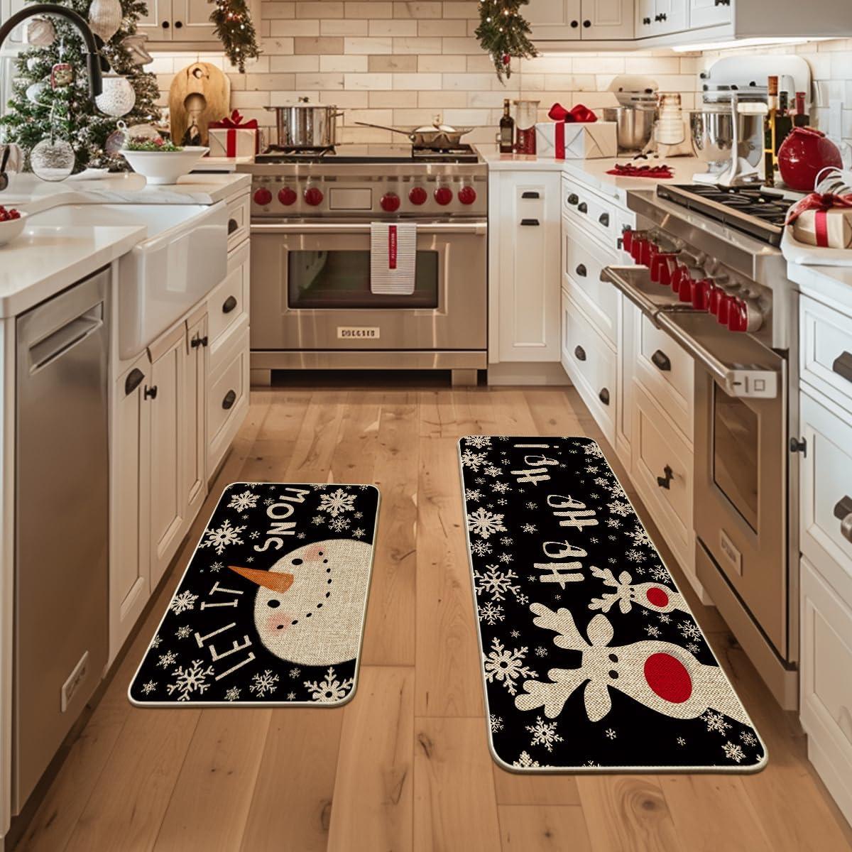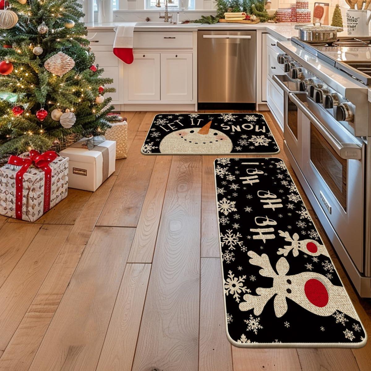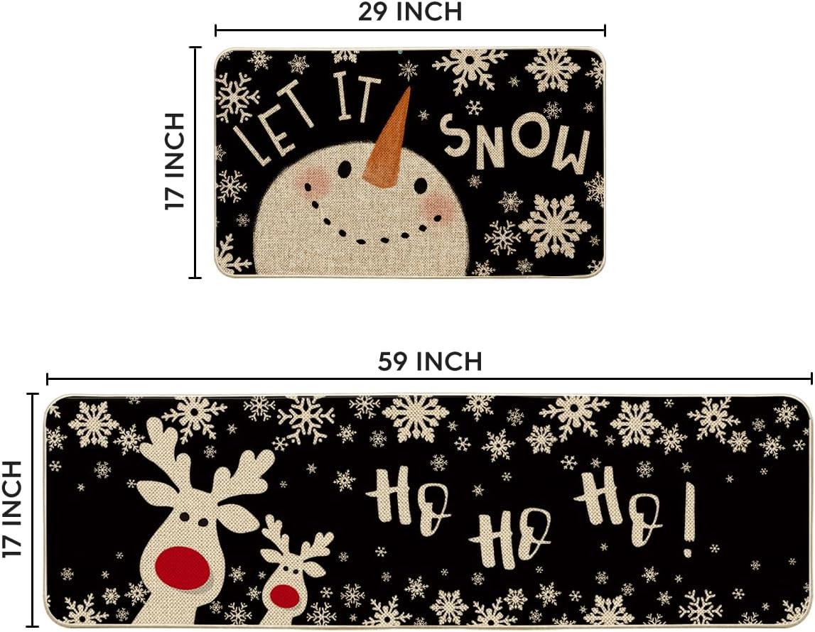 Artoid Mode Snowman Deer Let It Snow Snowflake Christmas Kitchen Mats Set of 2, Winter Decor Low-Profile Kitchen Rugs for Floor – 17×29 and 17×47 Inch(Black)