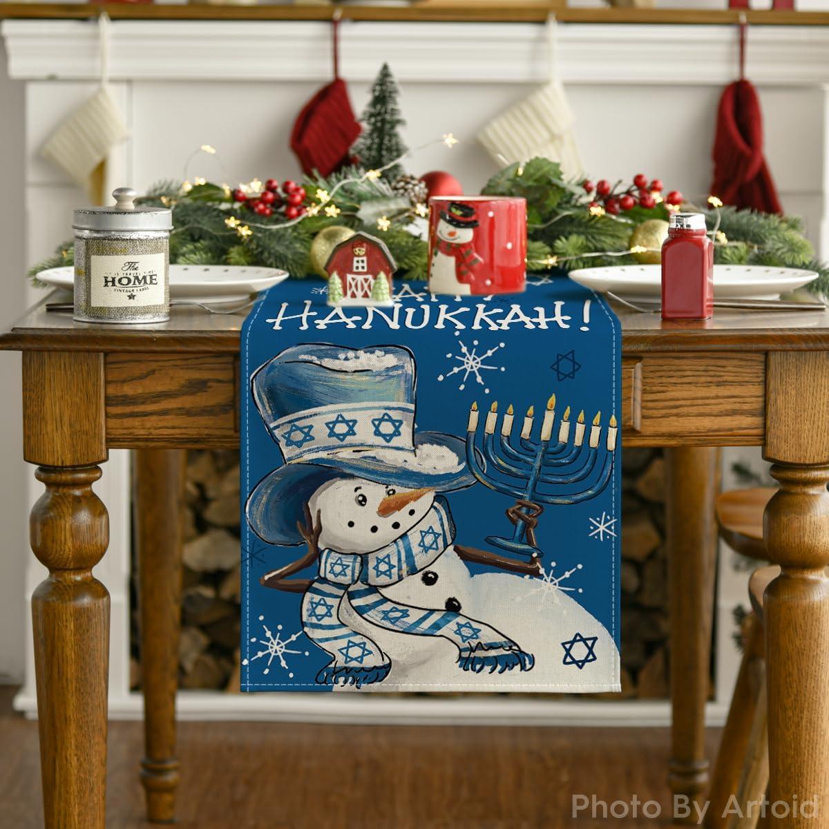 Artoid Mode Snowman Menorah Happy Hanukkah Table Runner, Chanukah Holiday Kitchen Dining Table Decoration for Home Party Decor 13×72 Inch