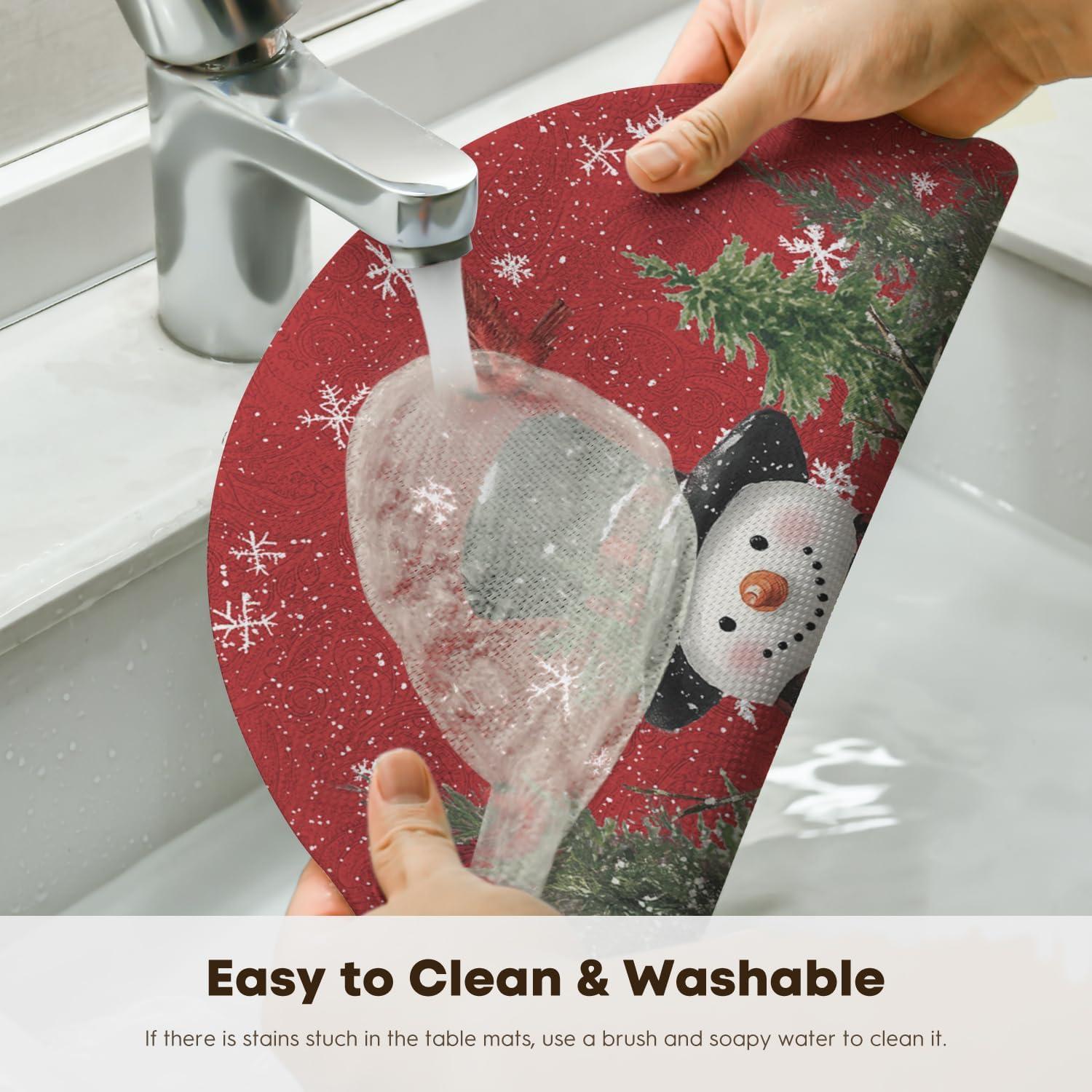 Easy To Clean:The washable placemats simply wipe with soap,water and a soft sponge or cloth.Scrub stubborn stains with a soft bristle-brush and a bleach-based cleanse