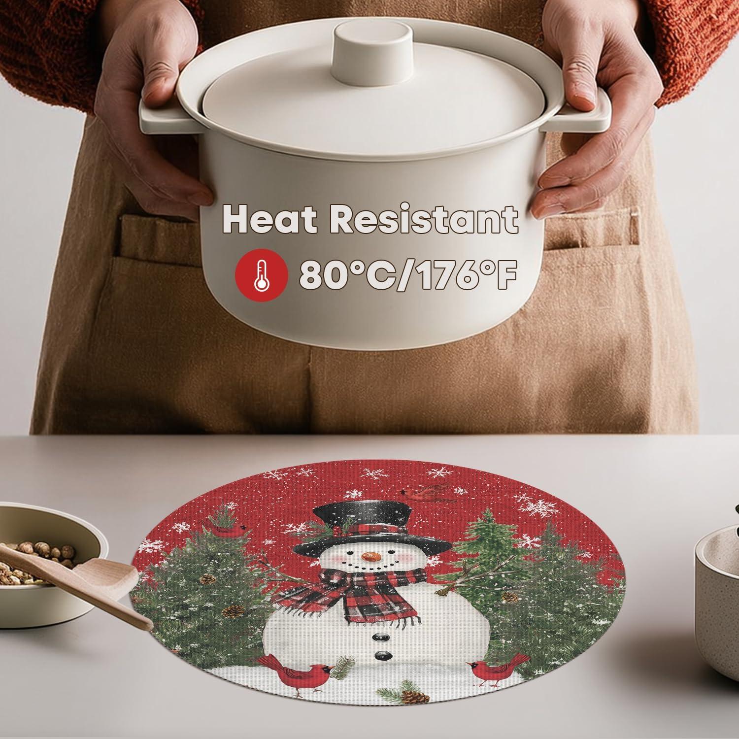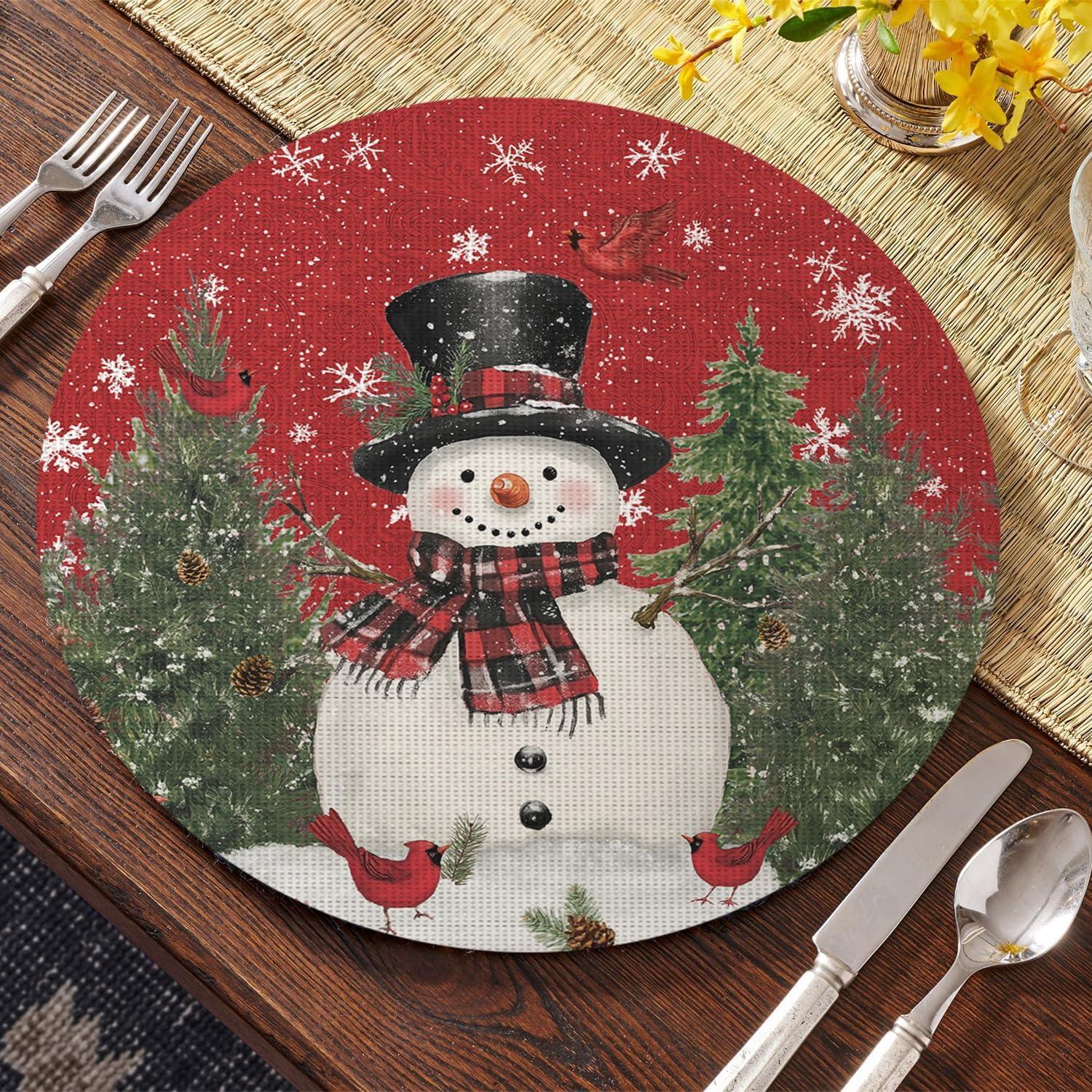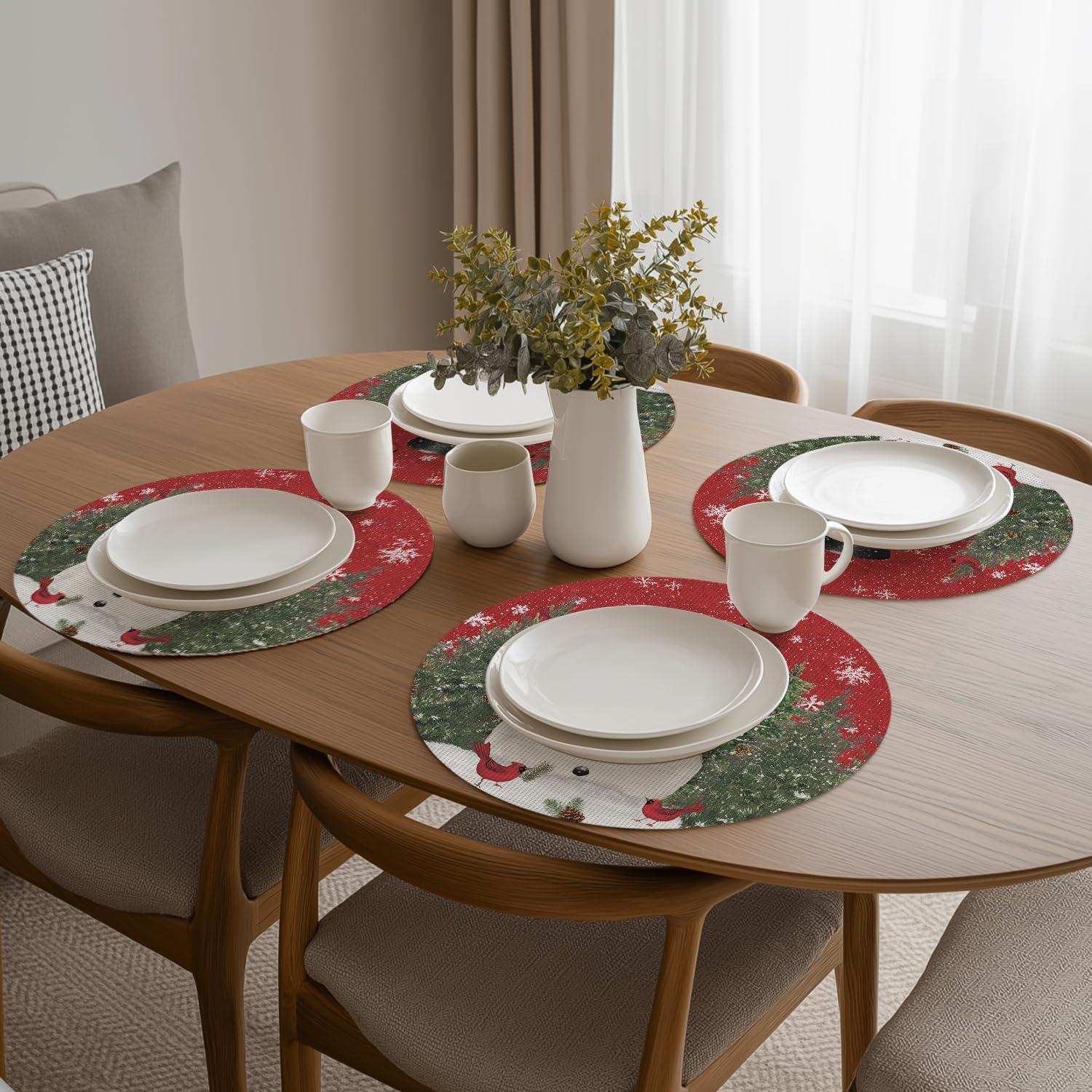 Artoid Mode Snowman Trees Christmas Floral Vinyl Placemats Set of 4, Wipeable Blue Winter PVC Woven Table Mats for Party Kitchen Dining Decor, 12×18 Inch(Red)