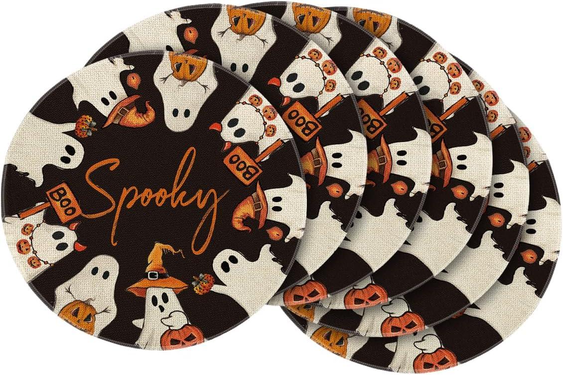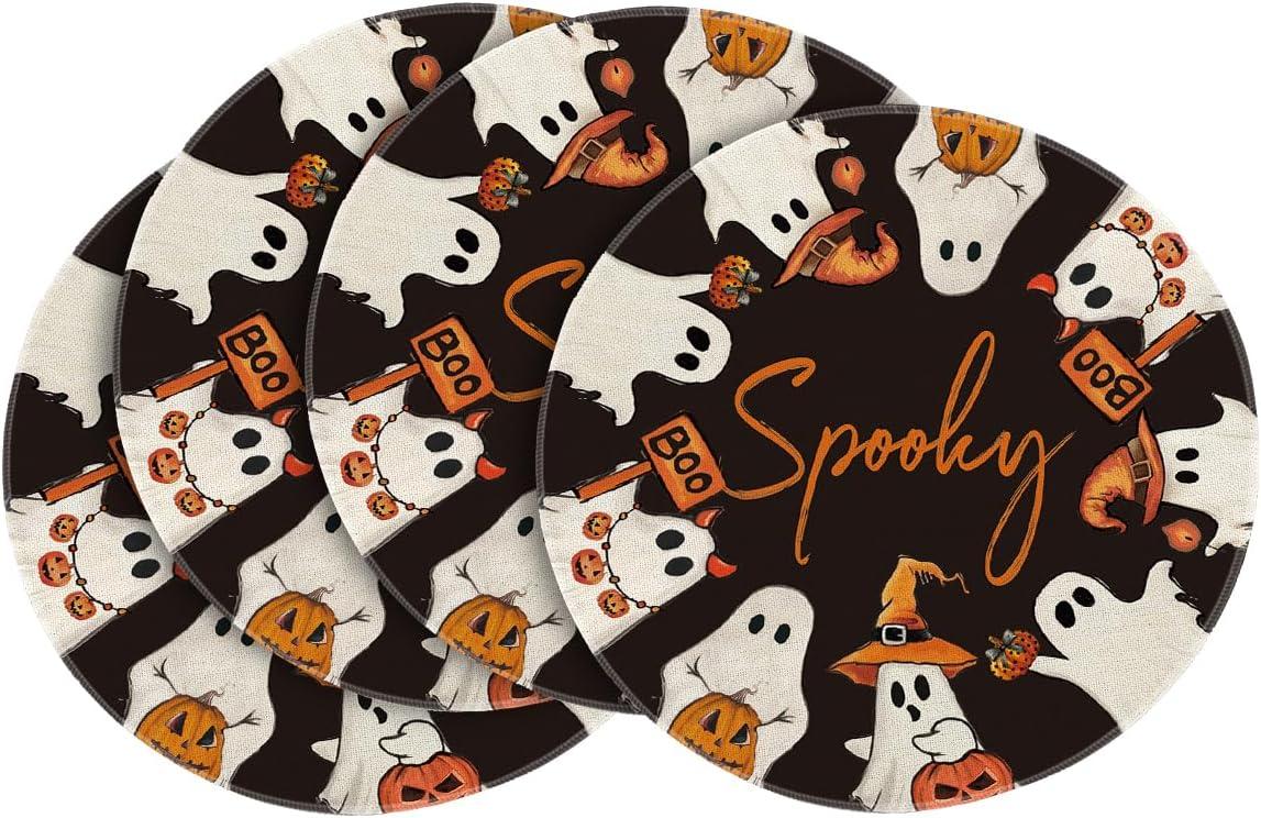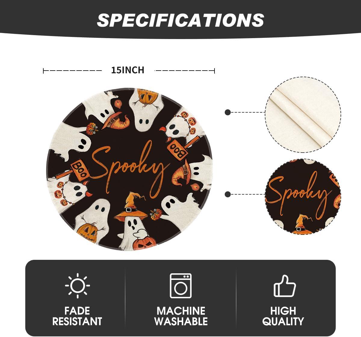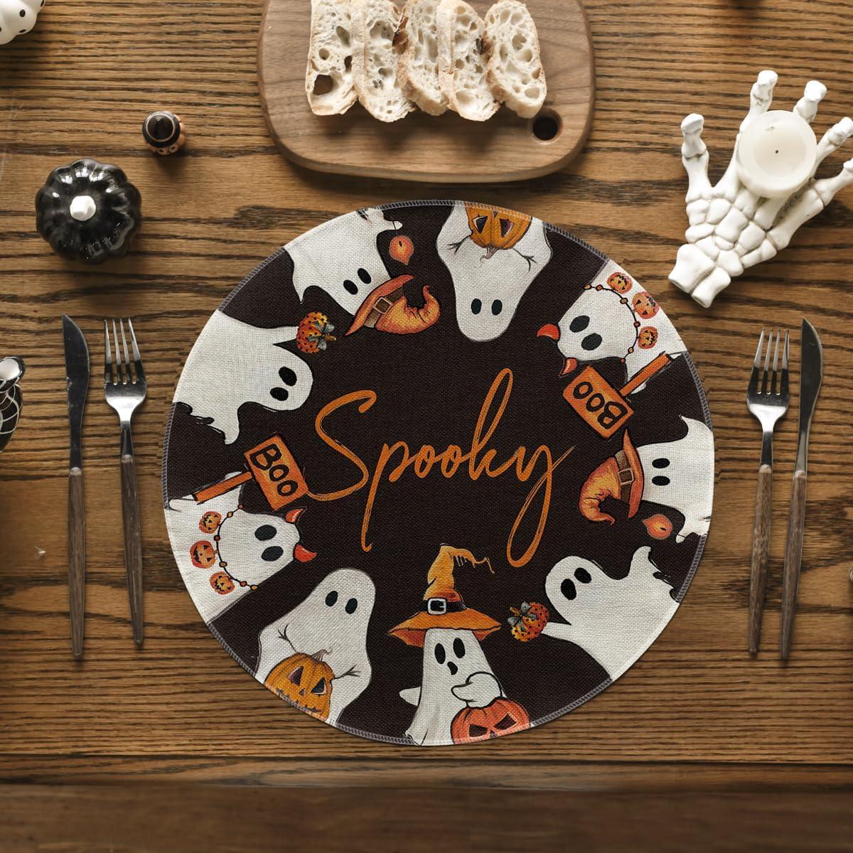 Artoid Mode Spooky Ghost Halloween Round Placemats Set of 4, 14 Inch Table Mats for Party Kitchen Dining(Black/Beige)