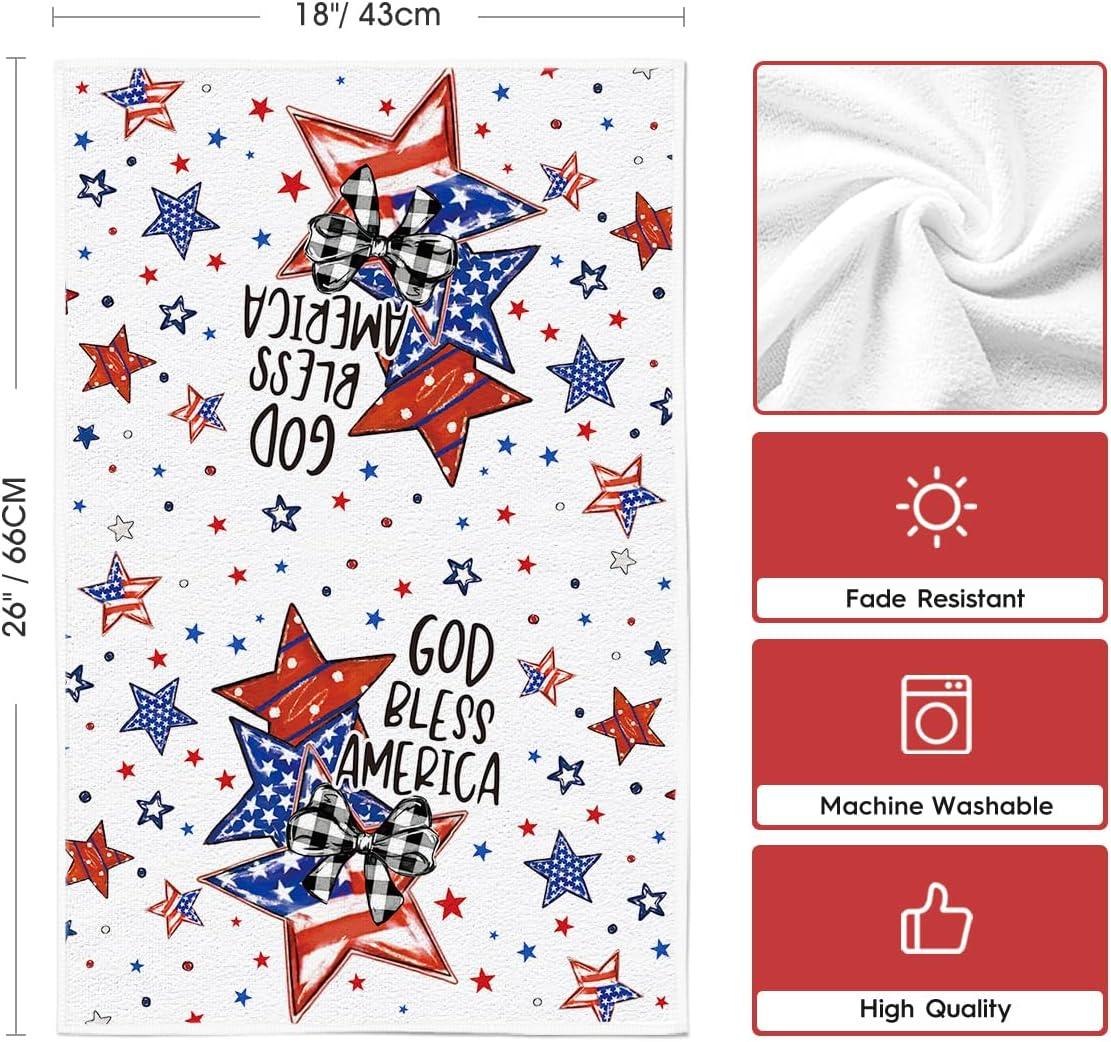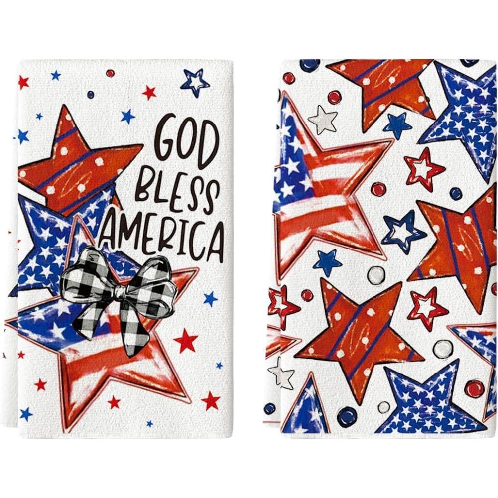 Artoid Mode Stars Bow America Patriotic 4th of July Kitchen Towels Dish Towels, 18×26 Inch God Bless Memorial Day Decoration Hand Towels Set of 2