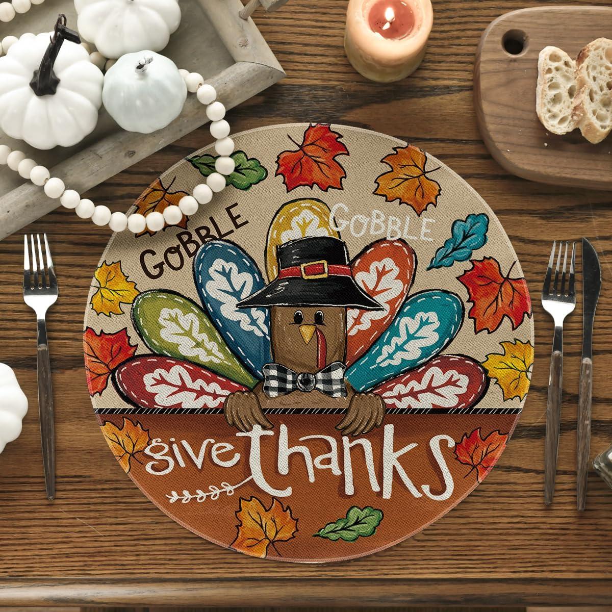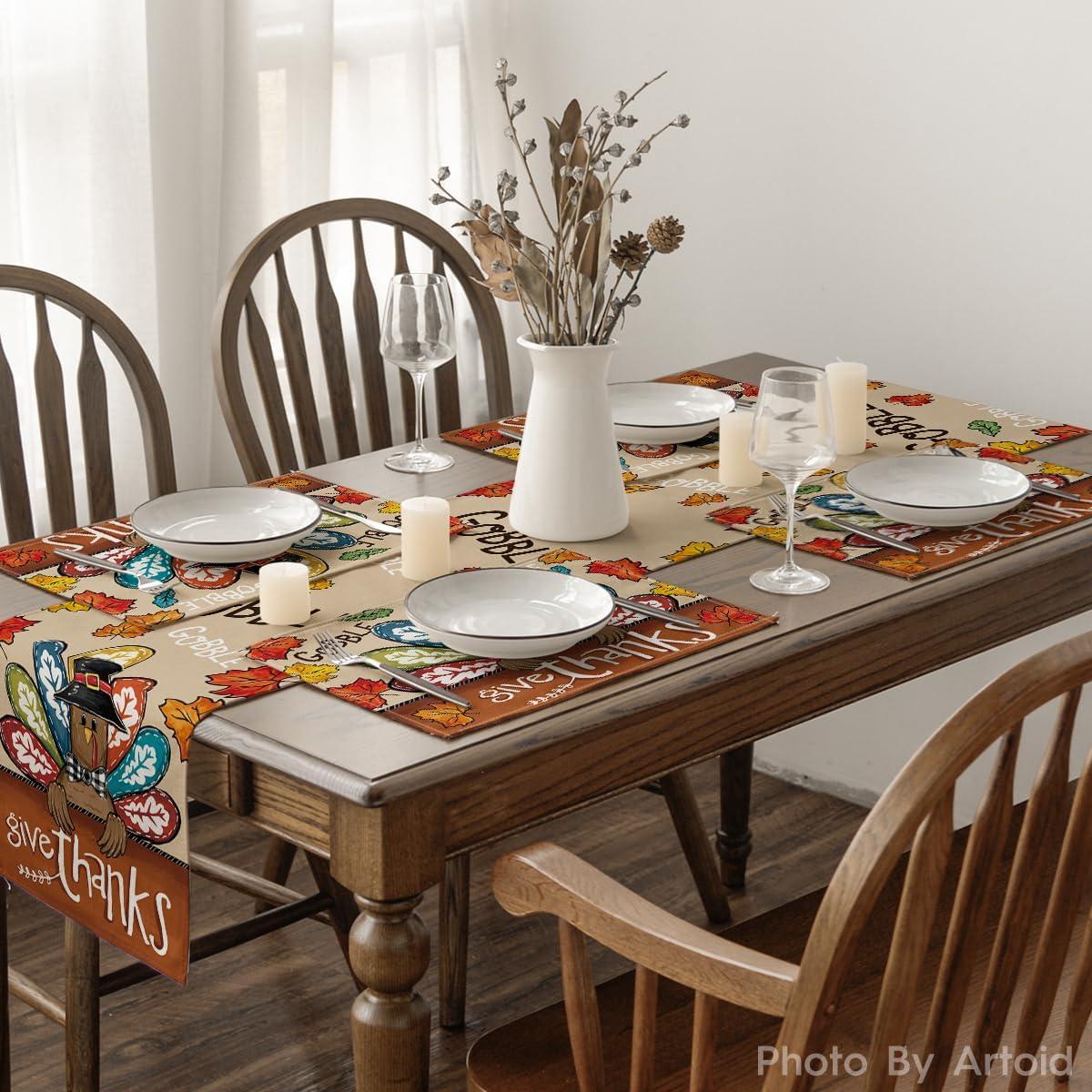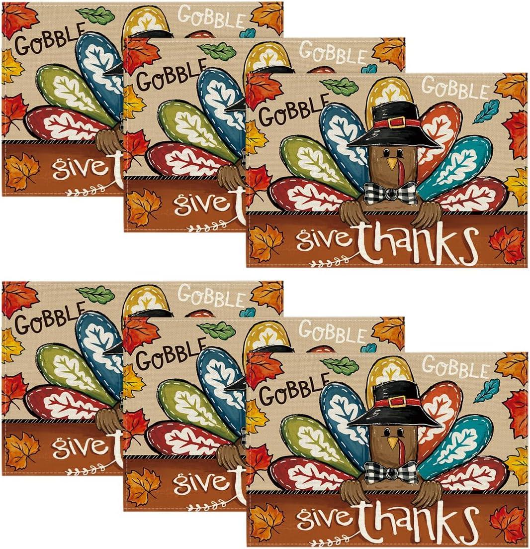 Artoid Mode Turkey Give Thanks Thanksgiving Placemats Set of 6, 12×18 Inch Seasonal Table Mats for Party Kitchen Dining Decoration(Brown)