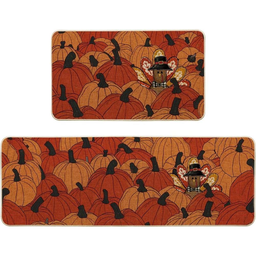 Artoid Mode Turkey Pumpkins Thanksgiving Kitchen Mats Set of 2, Home Decor Low-Profile Kitchen Rugs for Floor – 17×29 and 17×47 Inch