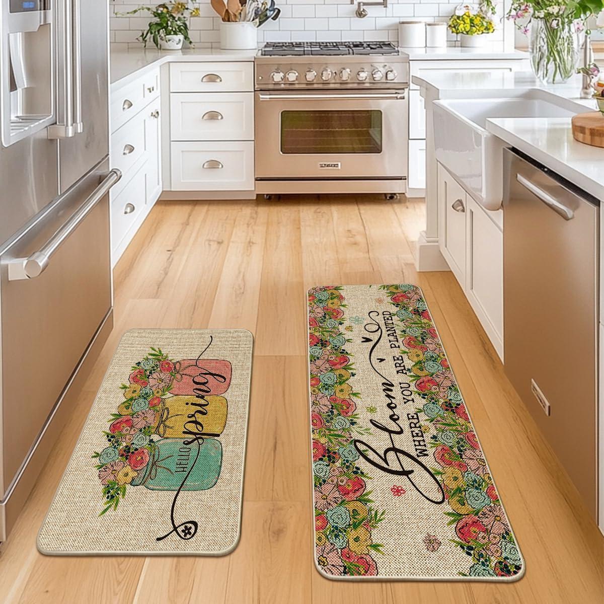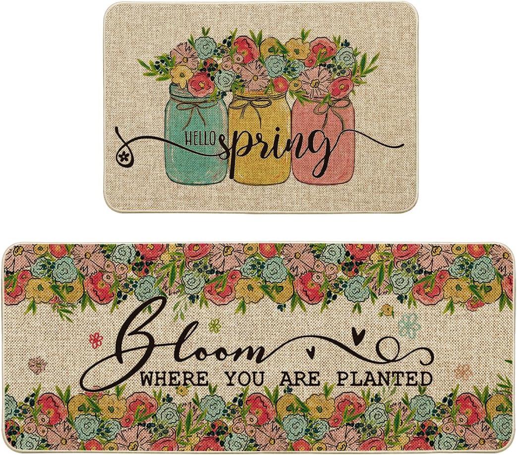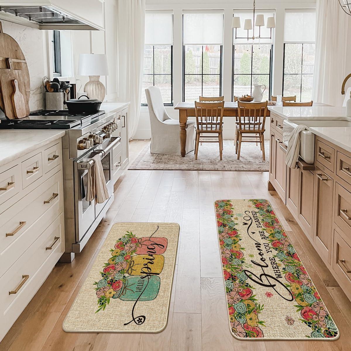Artoid Mode Vases Flowers Hello Spring Kitchen Mats Set of 2, Home Decor Low-Profile Kitchen Rugs for Floor – 17×29 and 17×47 Inch(Beige)