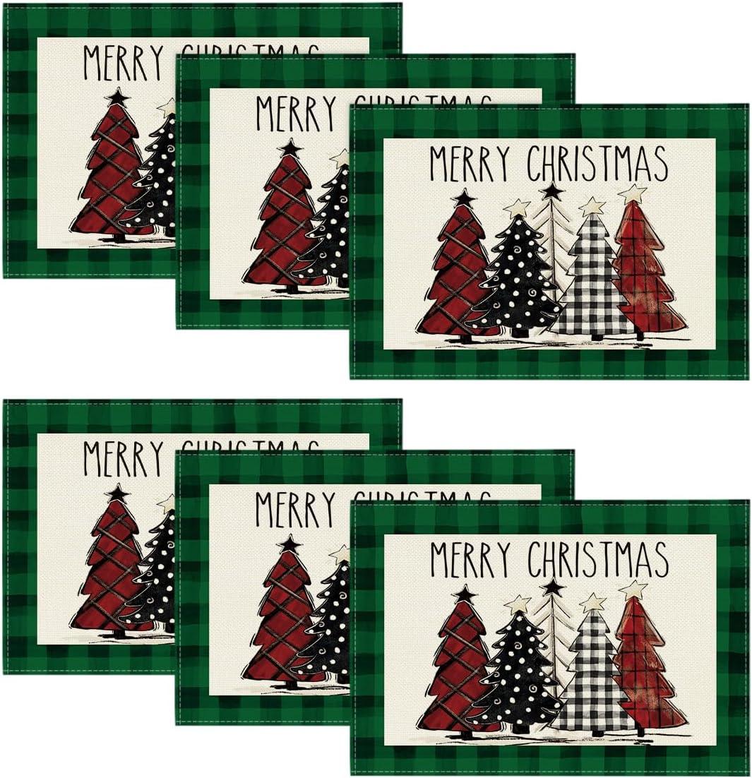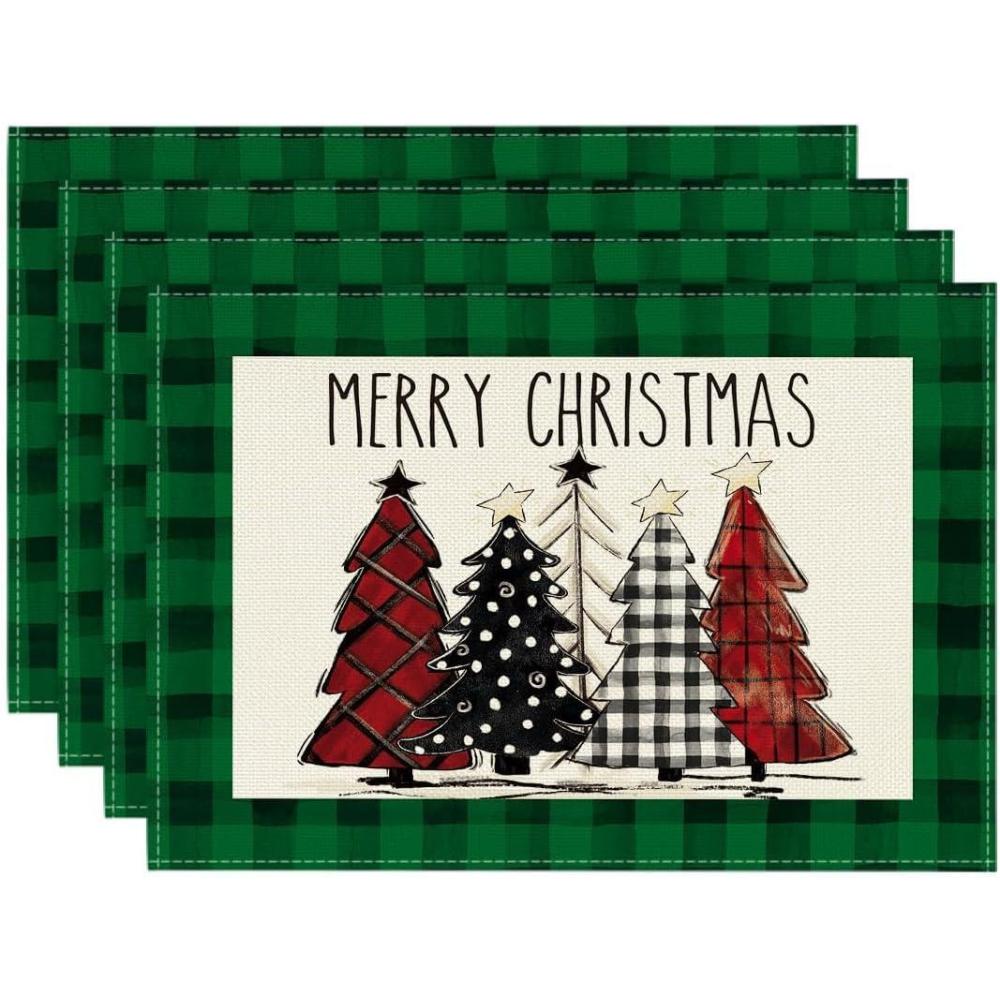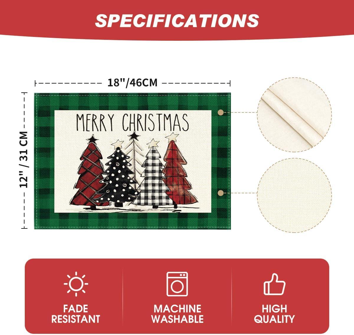 Artoid Mode Waterclor Buffalo Plaid Christmas Trees Placemats Set of 4, 12×18 Inch Winter Table Mats for Outdoor Home Party Kitchen Dining Decor(Black/Green)