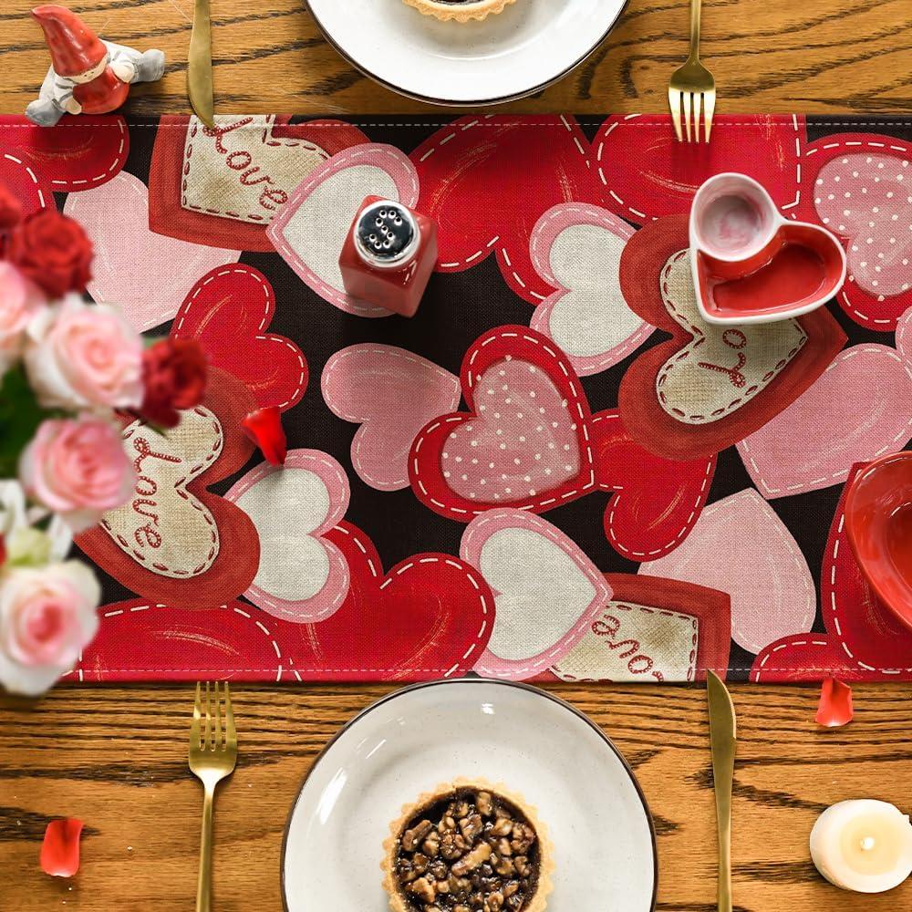 Artoid Mode White Pink Love Heart Valentine’s Day Table Runner, Holiday Anniversary Kitchen Dining Table Decoration for Home Party Decor 13×72 Inch(Black)