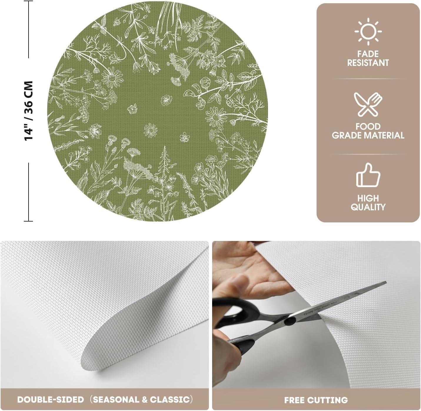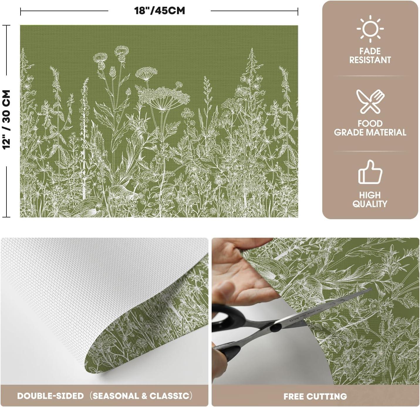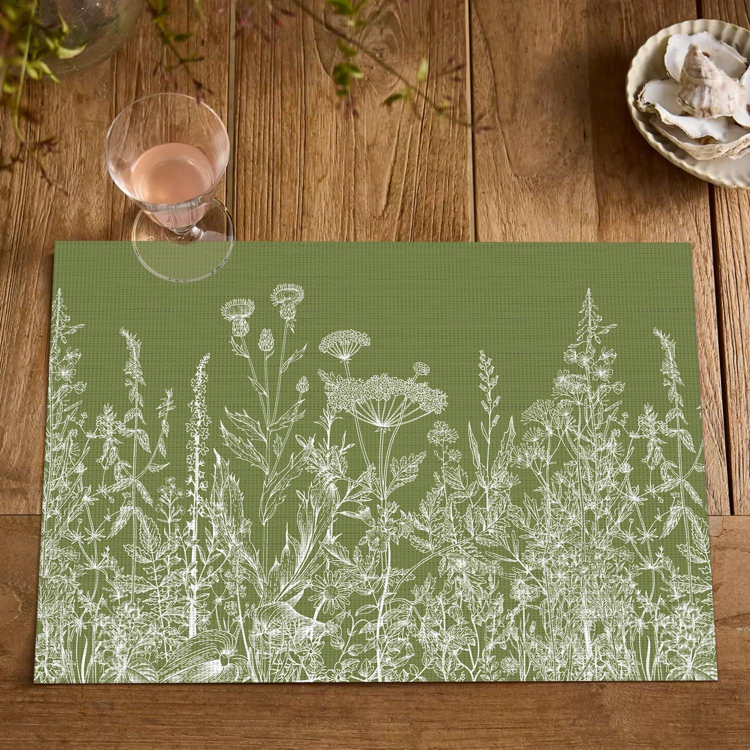 Artoid Mode Wildflower Vinyl Placemats Set of 4, Washable Non-Slip Plastic PVC Table Mats for Spring Party Kitchen Dining Decor, 12×18 Inch(Green)