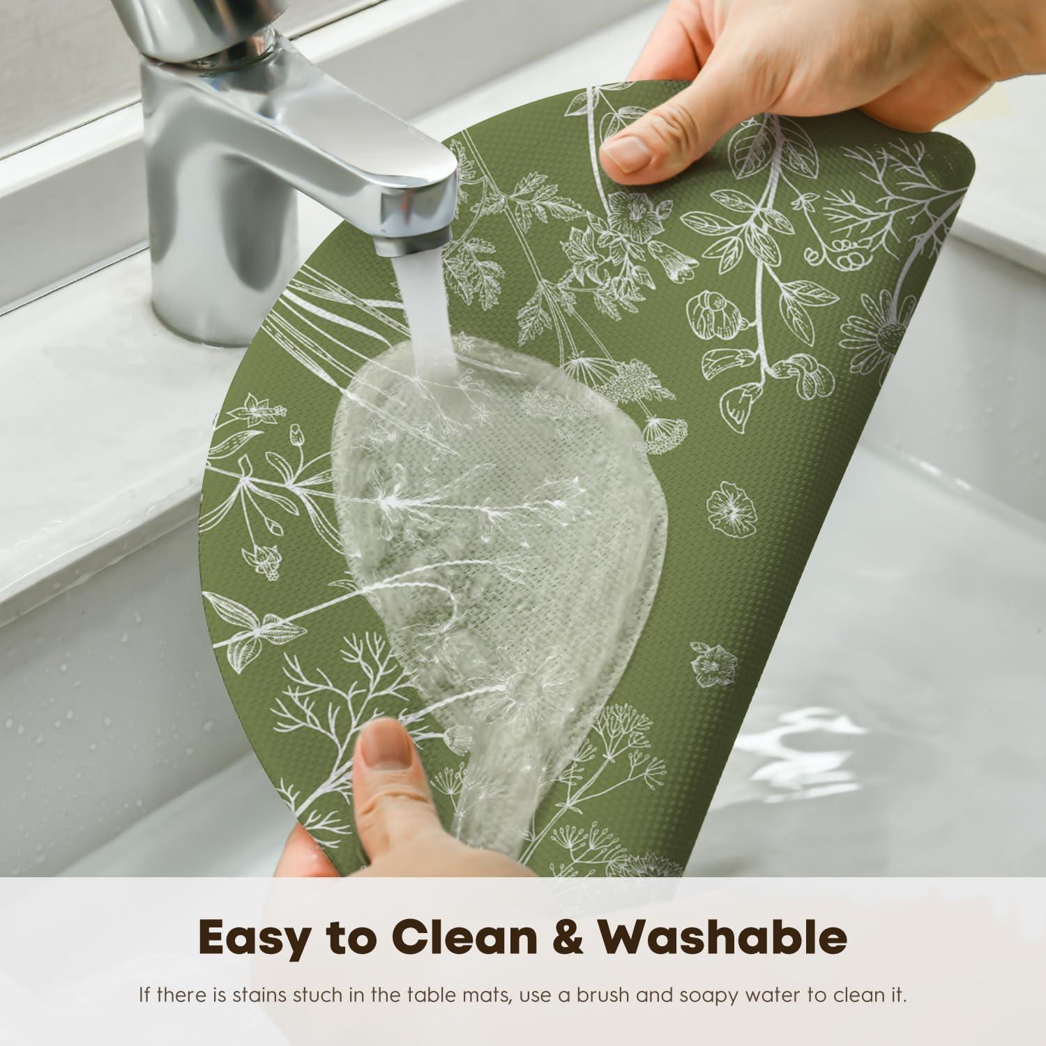 Easy To Clean:The washable placemats simply wipe with soap,water and a soft sponge or cloth.Scrub stubborn stains with a soft bristle-brush and a bleach-based cleanse